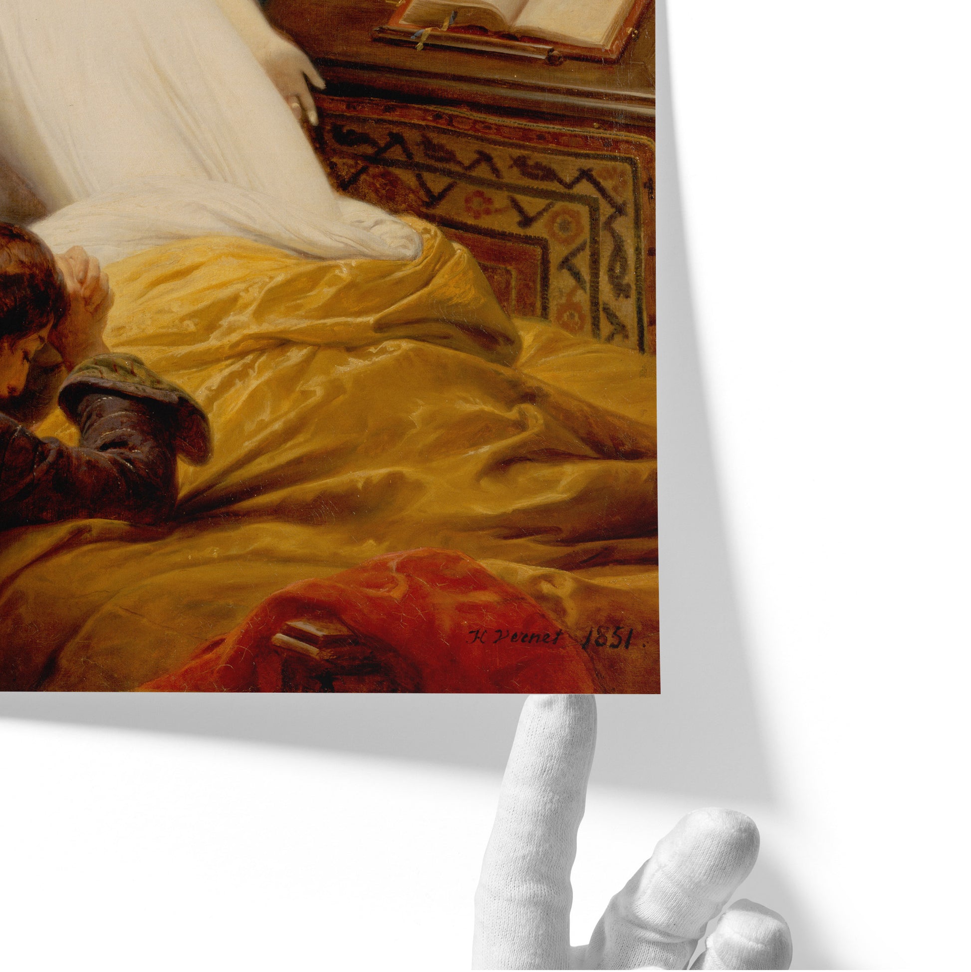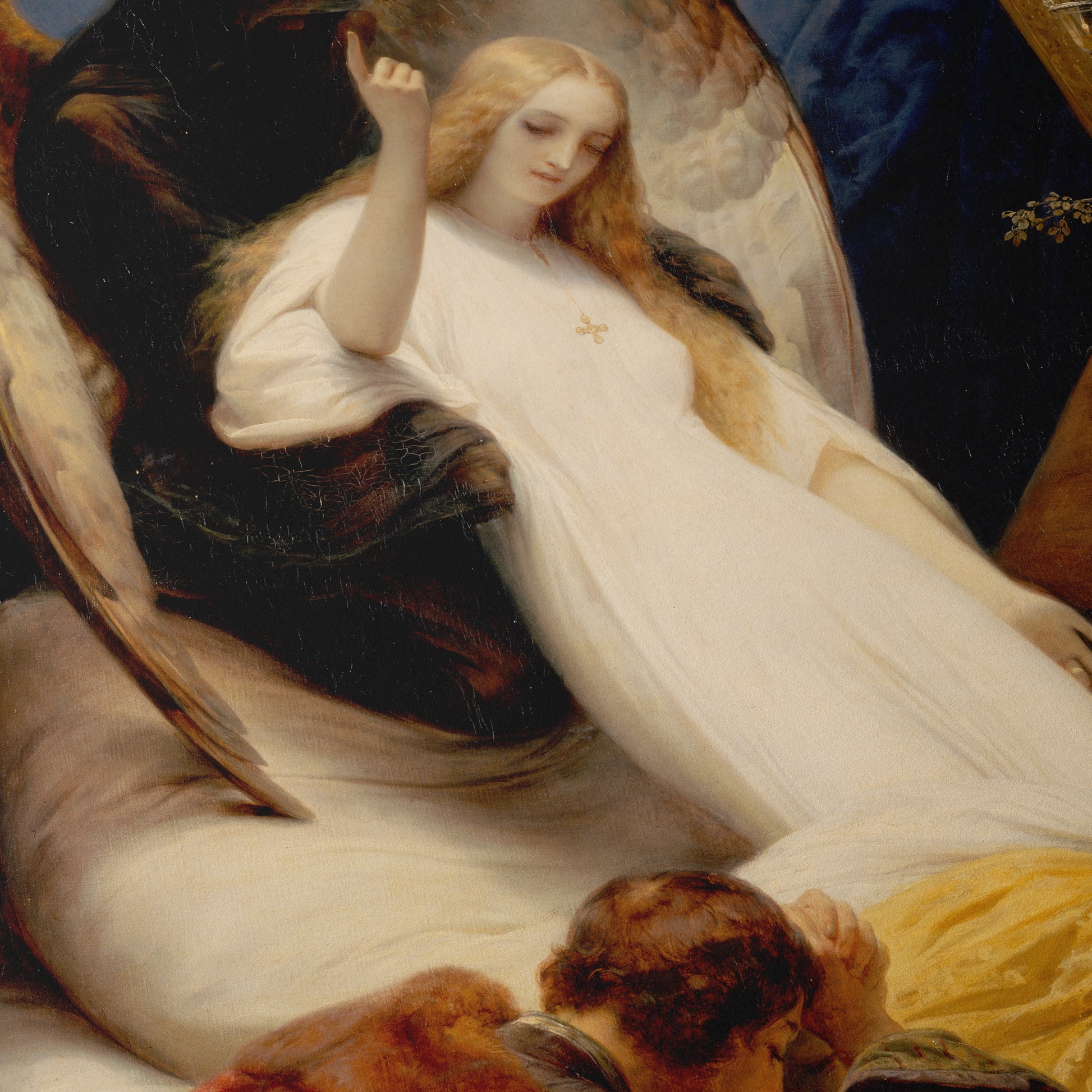 Angel of the Death by Horace Vernet (1851) shows a solemn moment in a simple interior where a young woman lies on a bed, her body gently lifted by a dark-robed, winged figure representing the Angel of Death. Her right hand is raised toward a beam of light from above, suggesting a passage from life to the afterlife, while a young man kneels beside the bed in prayer, his head bowed and hands clasped tightly. The scene includes religious objects like an open Bible, an icon, flowers, and a candle that underline the spiritual context of the moment. Vernet contrasts the woman’s calm, almost luminous figure with the dark presence of the angel to evoke the 19th-century view of death as transition rather than horror. The careful composition, controlled lighting, and symbolic detail work together to emphasize peaceful acceptance and the weight of human emotion in the face of mortality.