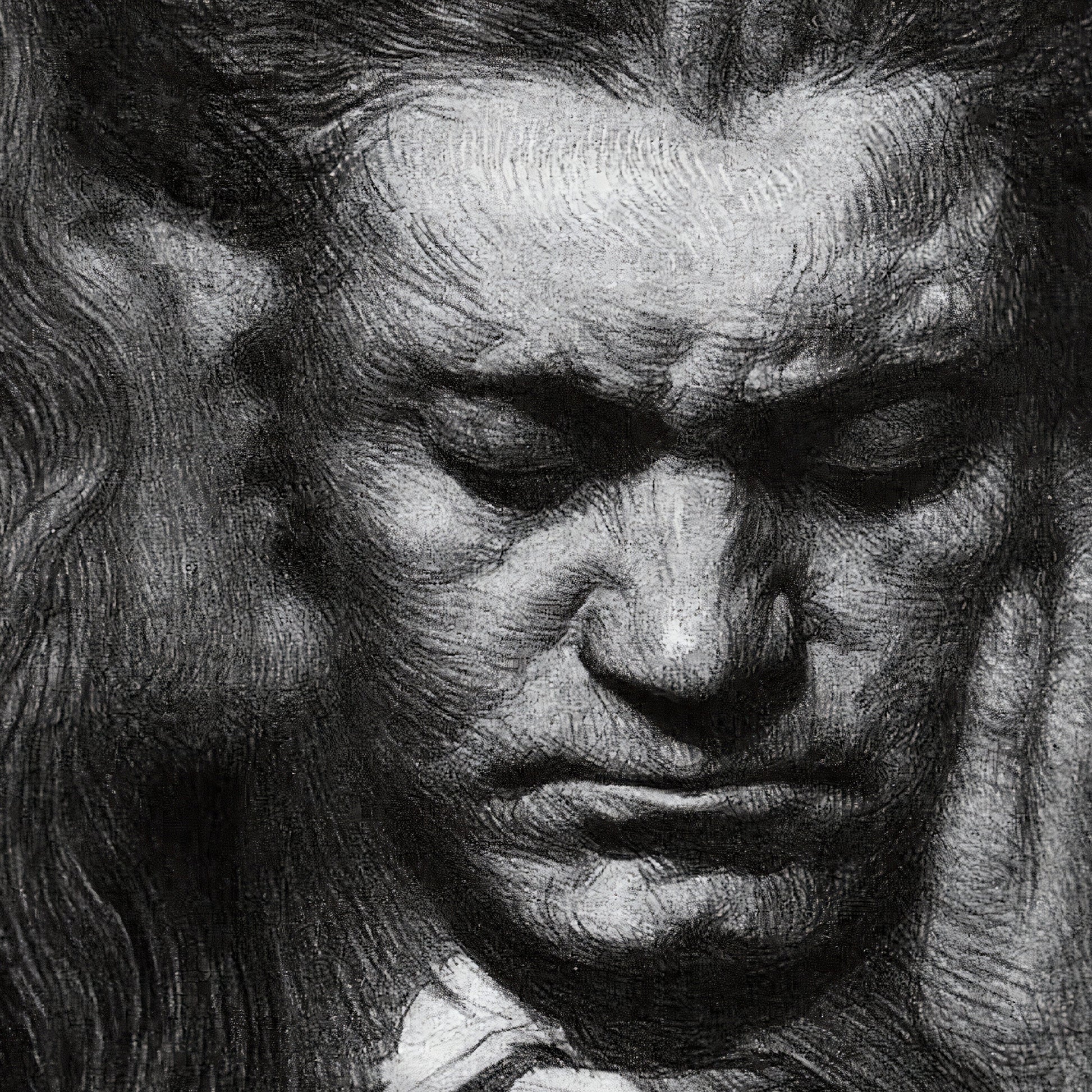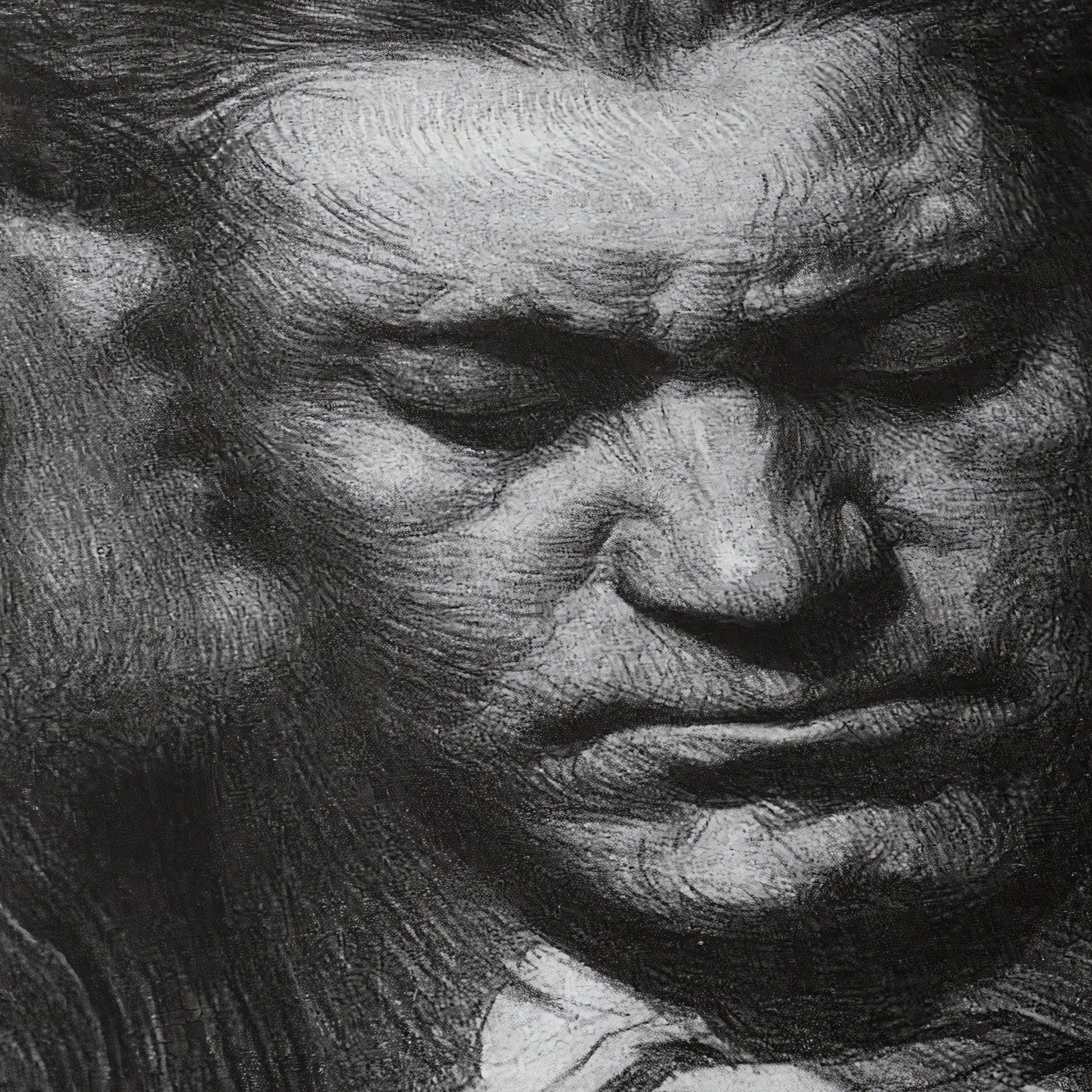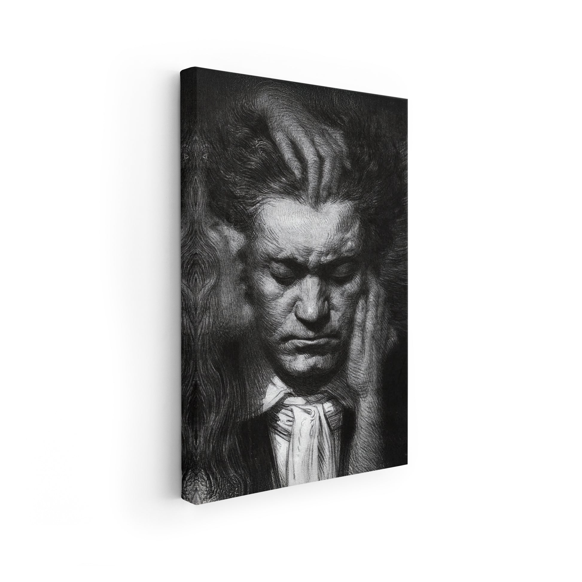 Beethoven Listening to Muse (1928) by Ludovic Alleaume presents the composer in an intimate, almost dreamlike moment, seated while a muse leans in to whisper inspiration directly to him. Painted in black and white, the work avoids dramatic color and instead emphasizes expression and form, reinforcing the idea of Beethoven’s inner world rather than his external reality. This choice connects deeply to his life, as he composed some of his greatest works while deaf, relying not on physical hearing but on imagination and inner vision. The muse becomes a symbol of that unseen source of creativity, reminding us that Beethoven’s genius was not limited by silence but fueled by it.