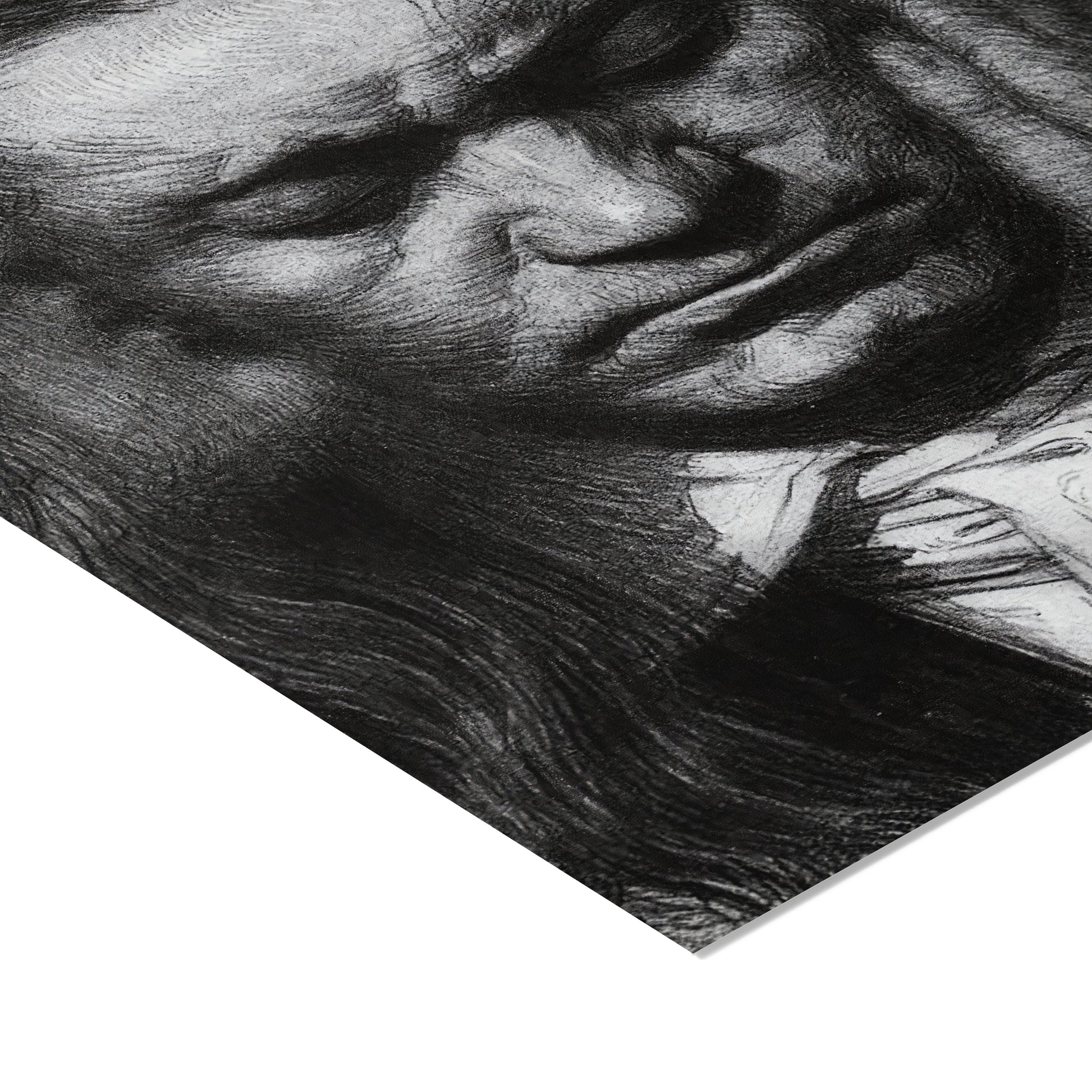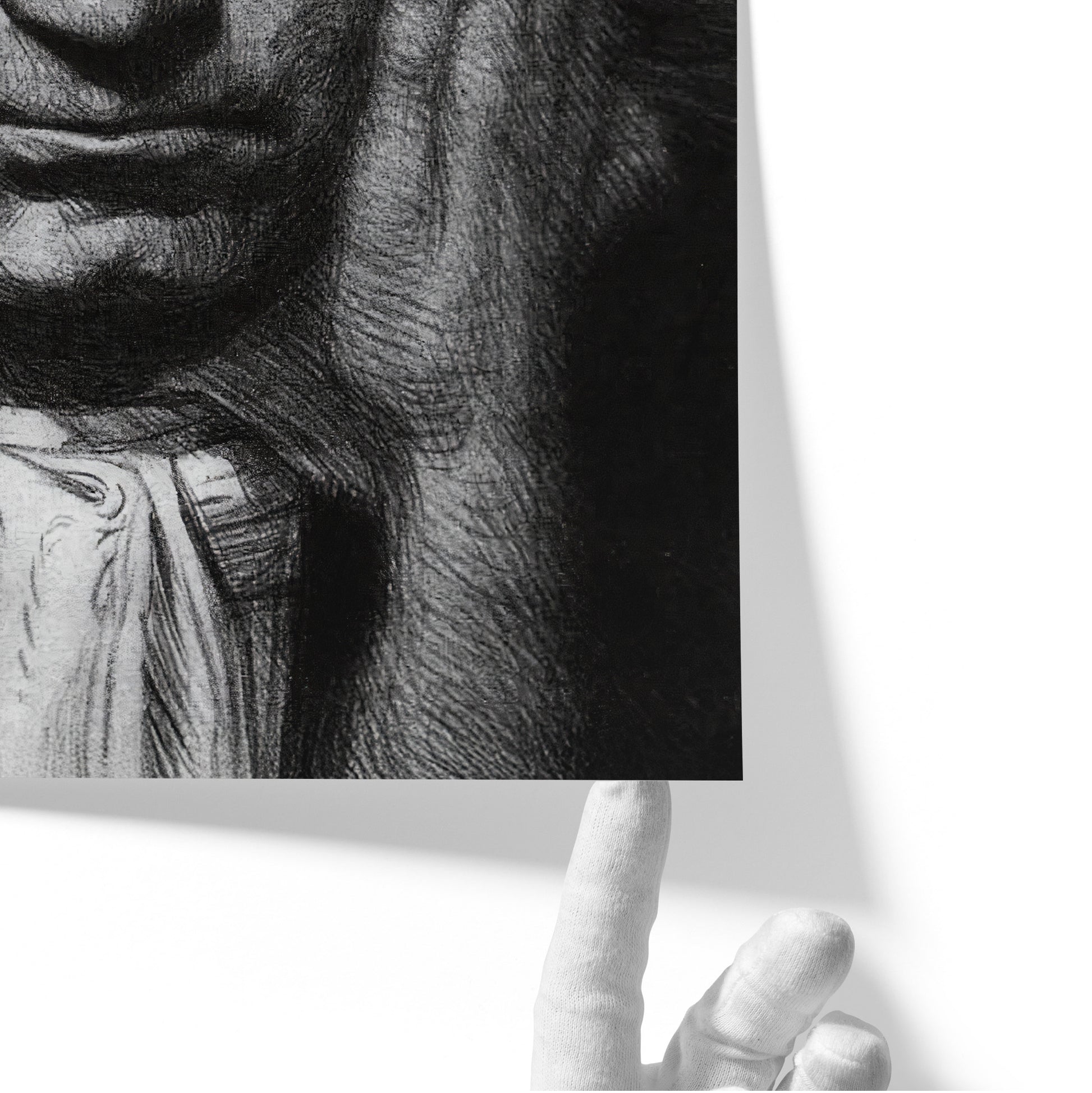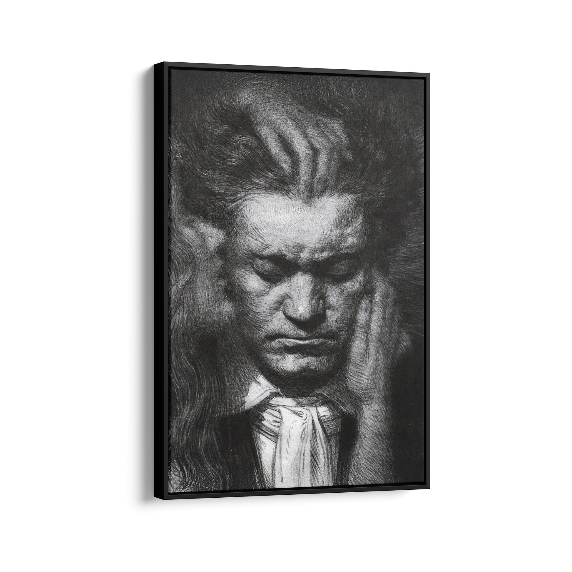 Beethoven Listening to Muse (1928) by Ludovic Alleaume presents the composer in an intimate, almost dreamlike moment, seated while a muse leans in to whisper inspiration directly to him. Painted in black and white, the work avoids dramatic color and instead emphasizes expression and form, reinforcing the idea of Beethoven’s inner world rather than his external reality. This choice connects deeply to his life, as he composed some of his greatest works while deaf, relying not on physical hearing but on imagination and inner vision. The muse becomes a symbol of that unseen source of creativity, reminding us that Beethoven’s genius was not limited by silence but fueled by it.