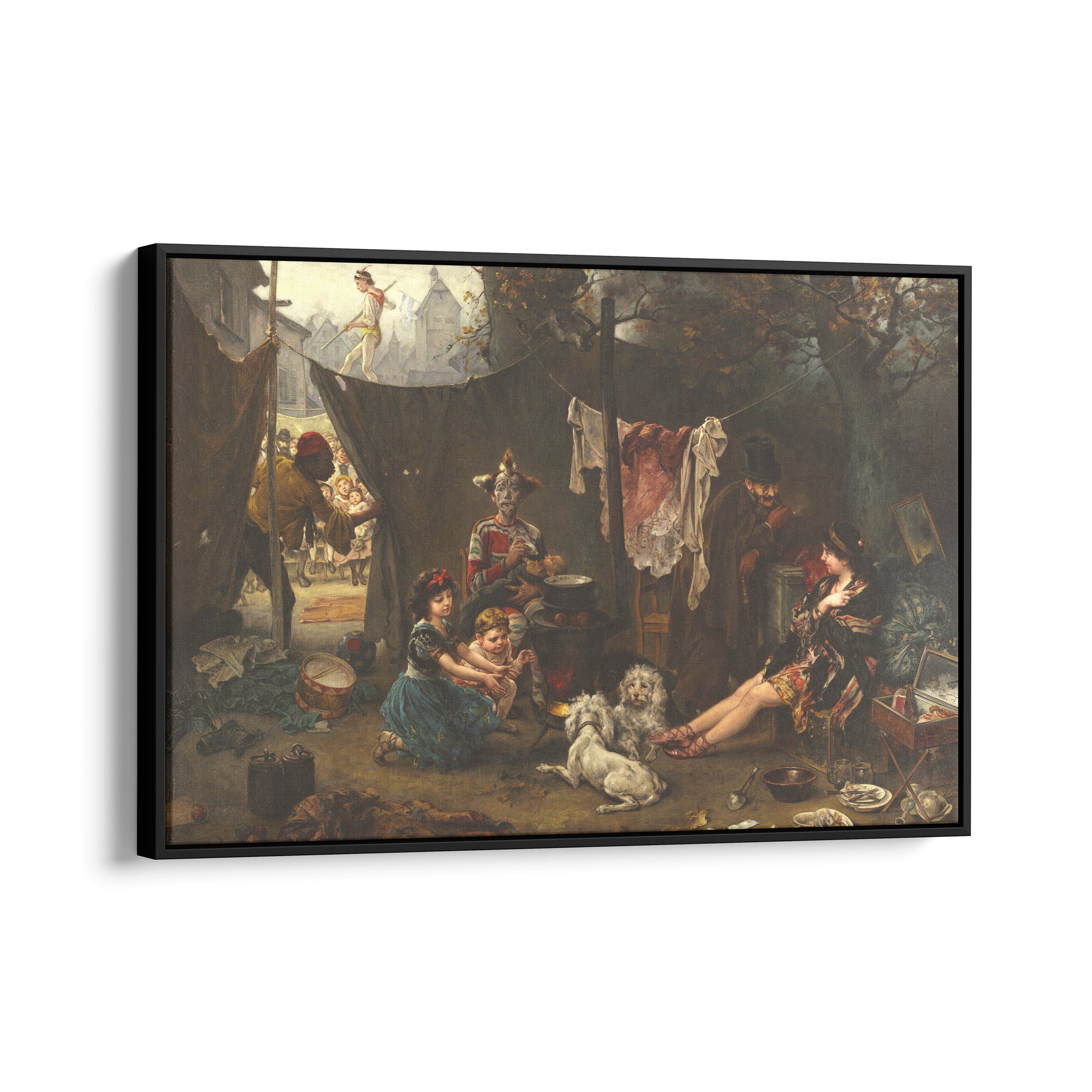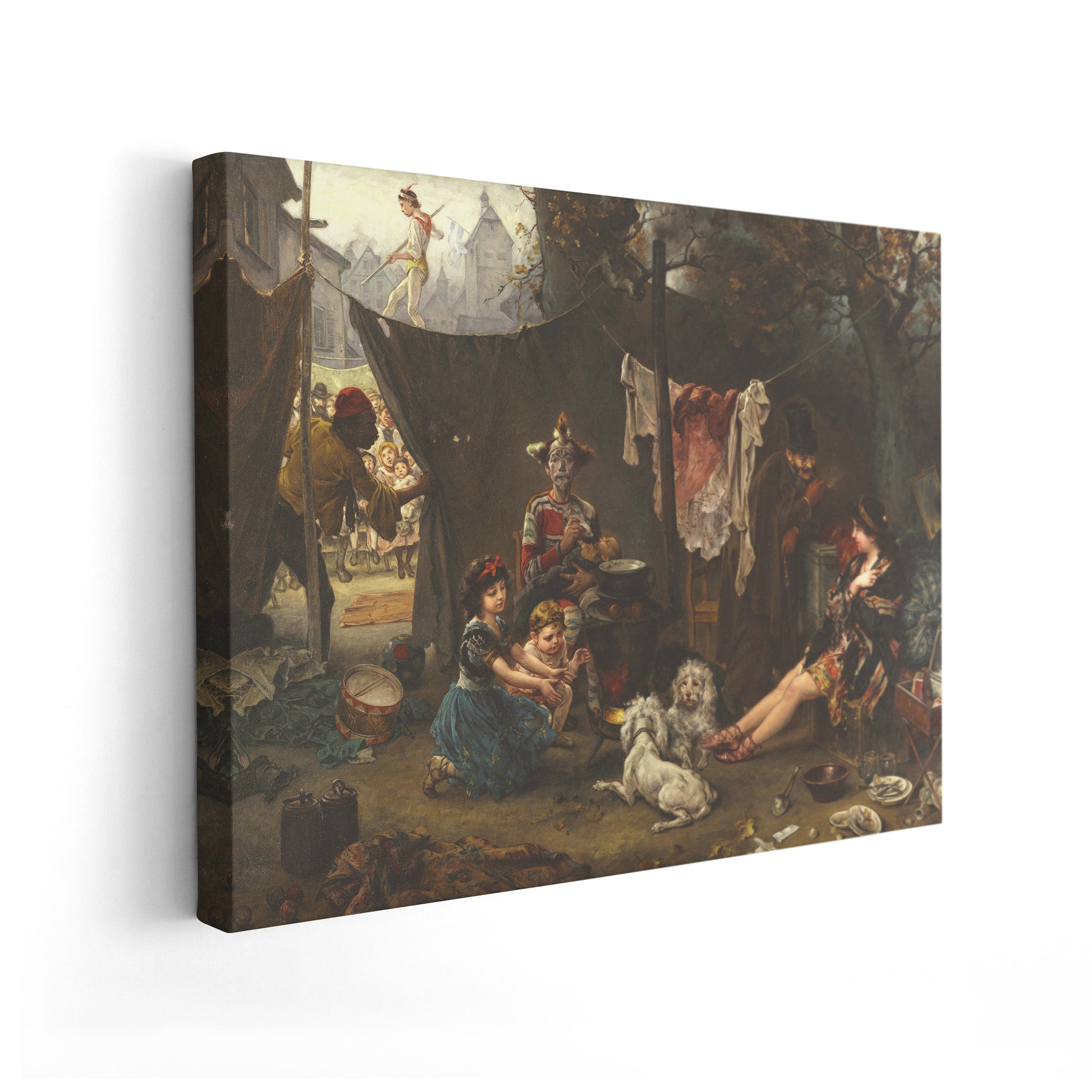 Behind the Scenes captures an intimate pre-performance moment that reveals the humanity behind theatrical spectacle. Set in a dim backstage space, the painting shows costumed entertainers preparing themselves—adjusting clothing, rehearsing movements, or exchanging glances—while the worn textures of the room contrast sharply with the glamour the audience will later see onstage. Ludwig Knaus, known for his sensitive genre scenes, uses warm light and precise detail to highlight the vulnerability and camaraderie of performers whose lives oscillate between illusion and reality. The composition emphasizes that the true drama often unfolds out of sight, where nervous anticipation, exhaustion, and quiet determination coexist. Through this backstage glimpse, Knaus invites the viewer to appreciate not just the artifice of performance but the authentic lives and emotions of those who create it.