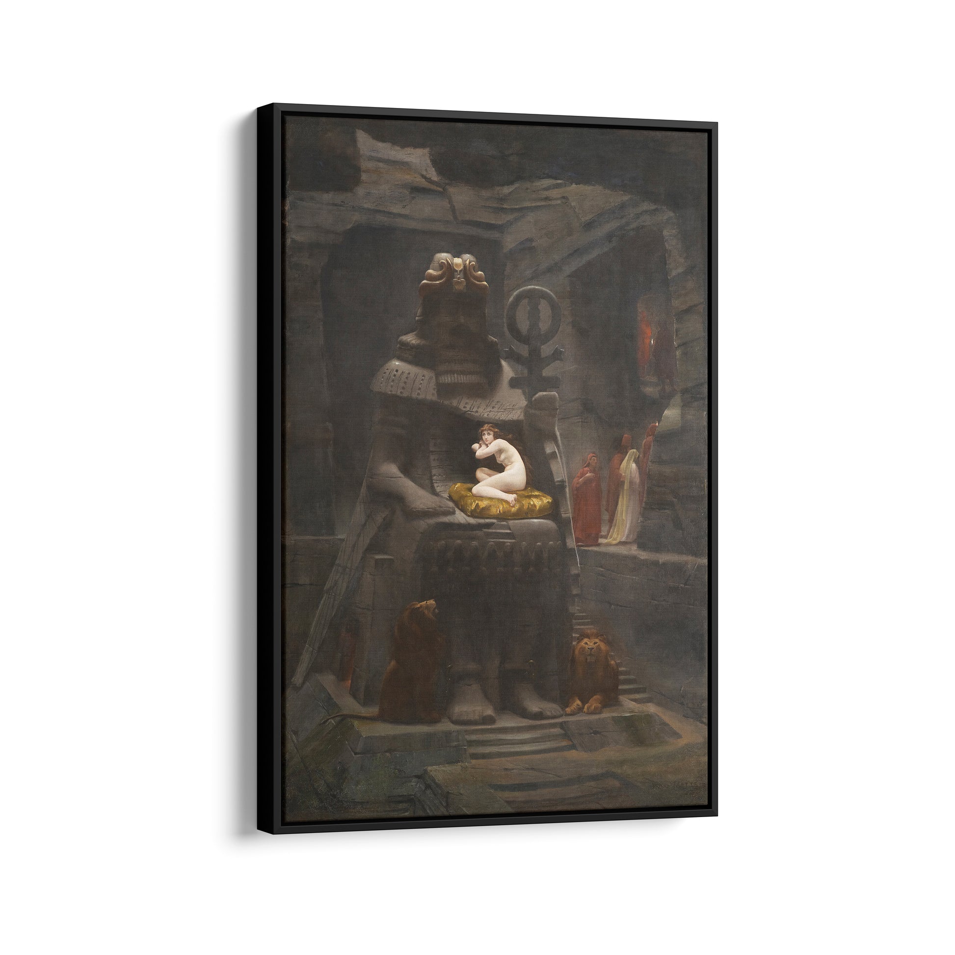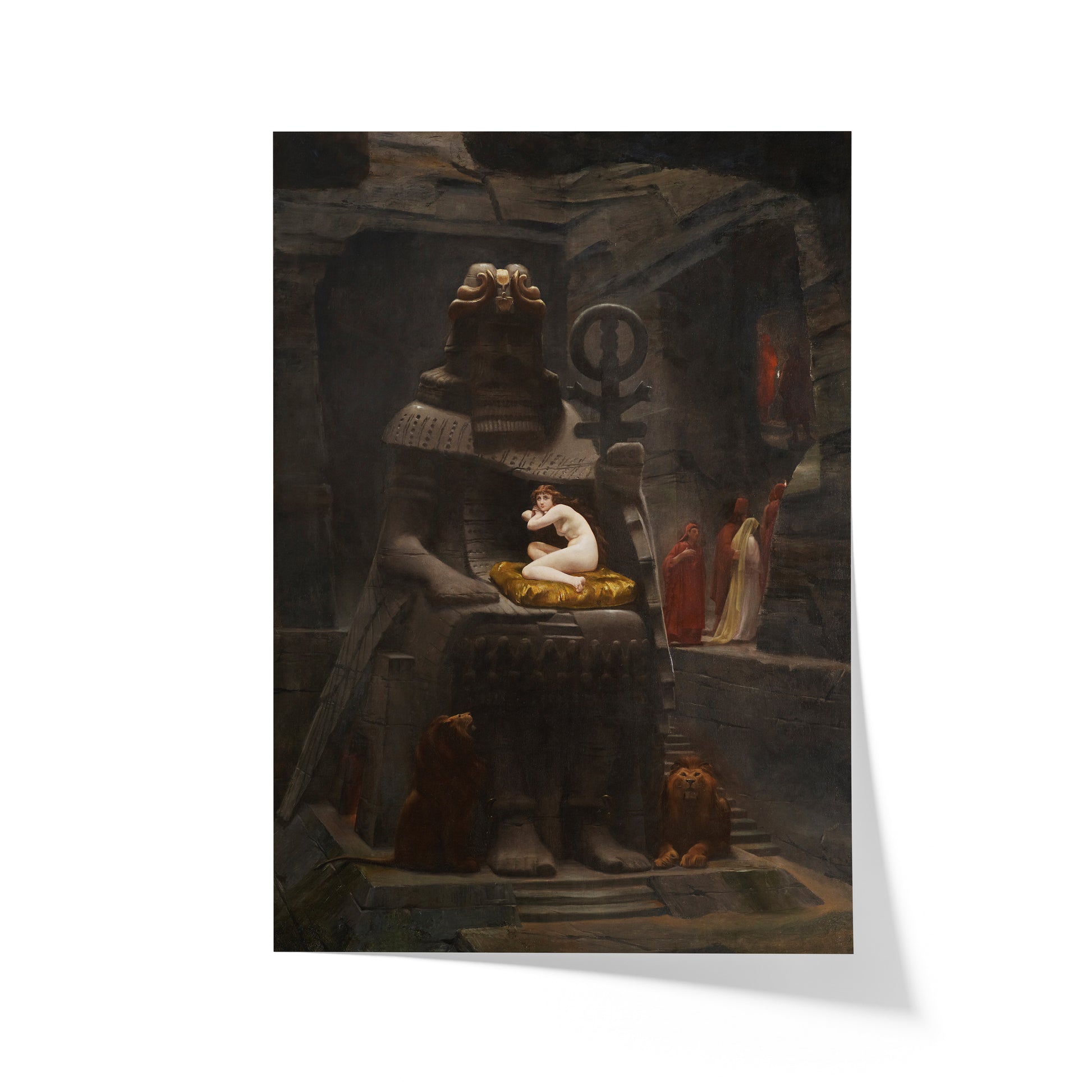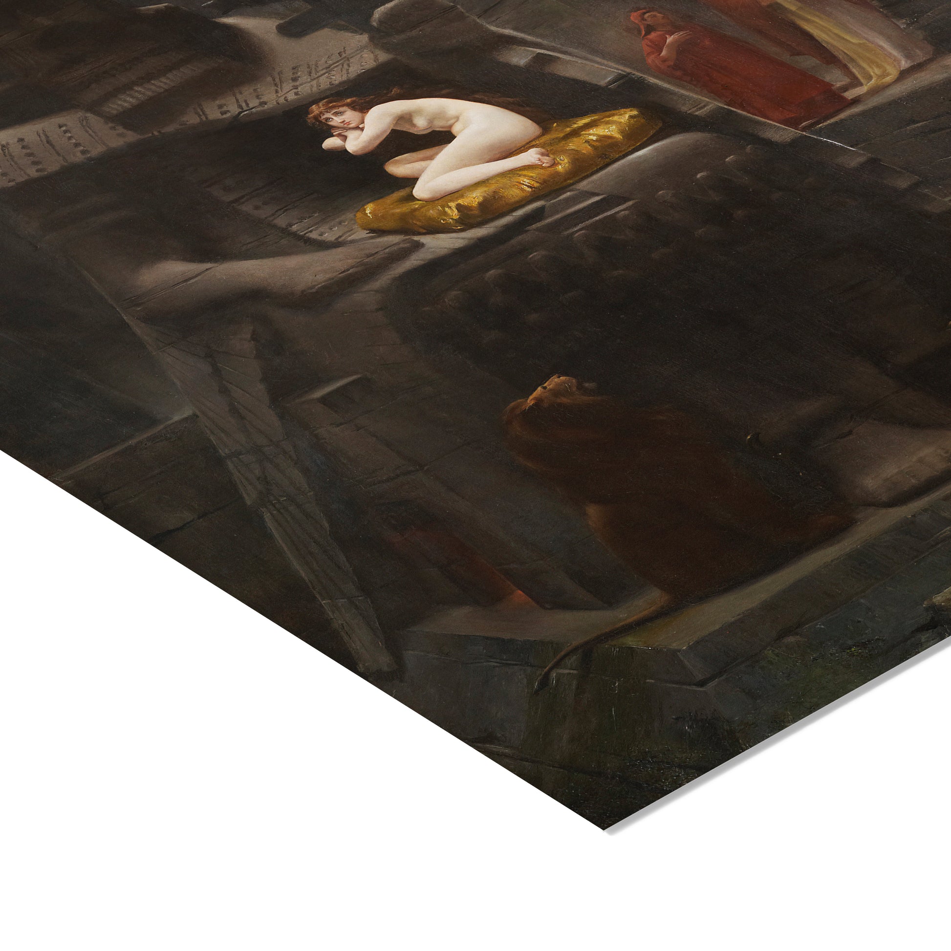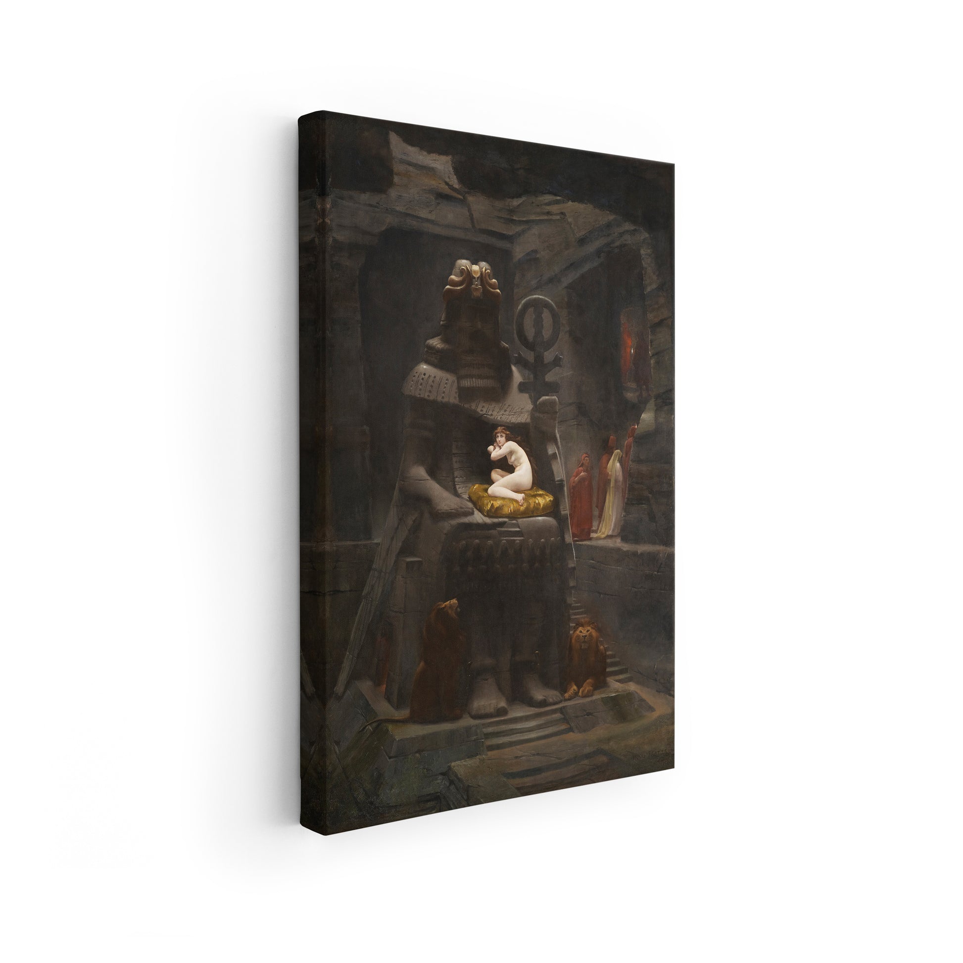 Henri-Paul Motte’s Bride of Belus (c. 1885) stages a dramatic reinterpretation of an ancient Babylonian ritual described by classical writers, where a woman was offered to the god Bel. Motte turns this fragmentary myth into an almost theatrical historical fantasy: a young woman stands elevated above a lavish temple interior, illuminated as the central sacrificial figure, while priests, soldiers, and worshippers surround her with solemn reverence. The painting blends archaeological imagination with 19th-century Orientalist aesthetics, using exaggerated scale, ornate architecture, and saturated color to evoke a distant and mysterious civilization. Far from depicting a documented event, Motte constructs a vision of ancient Babylon filtered through Victorian fascination with the exotic, highlighting both the grandeur and the brutality projected onto the ancient Near East.