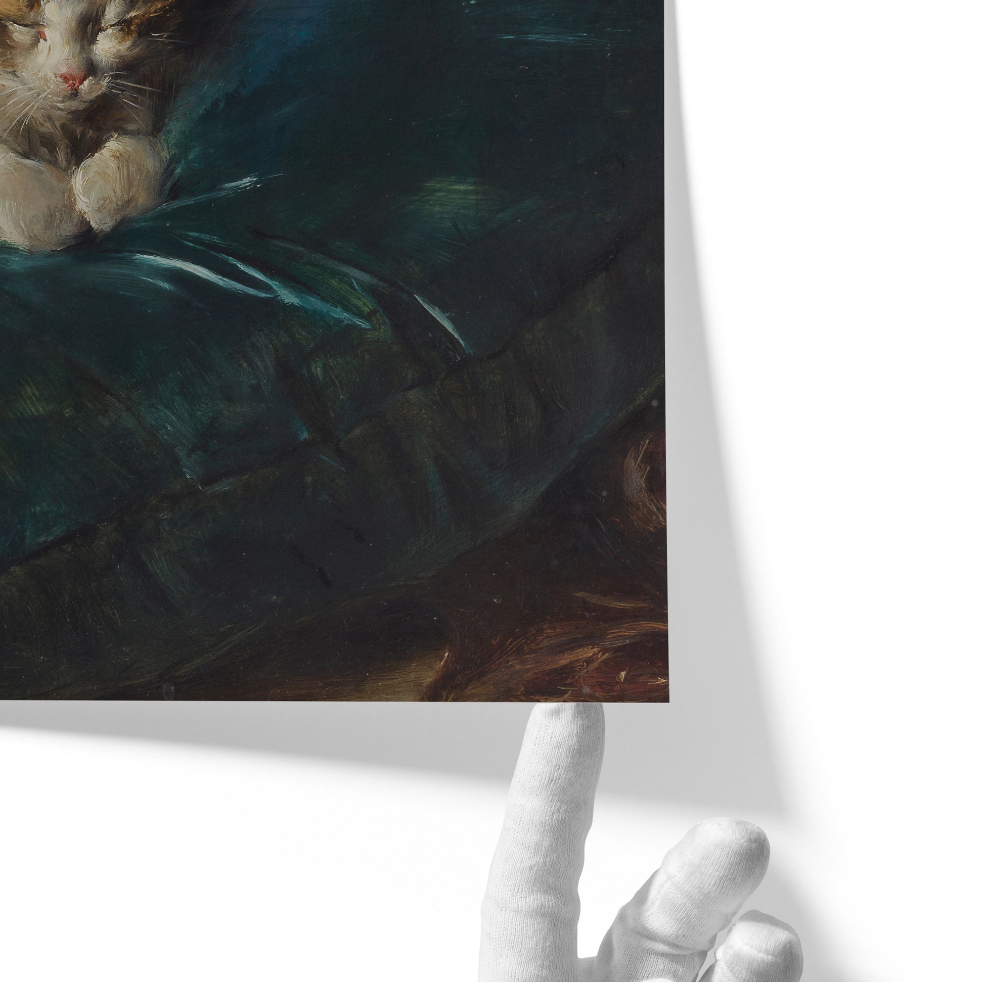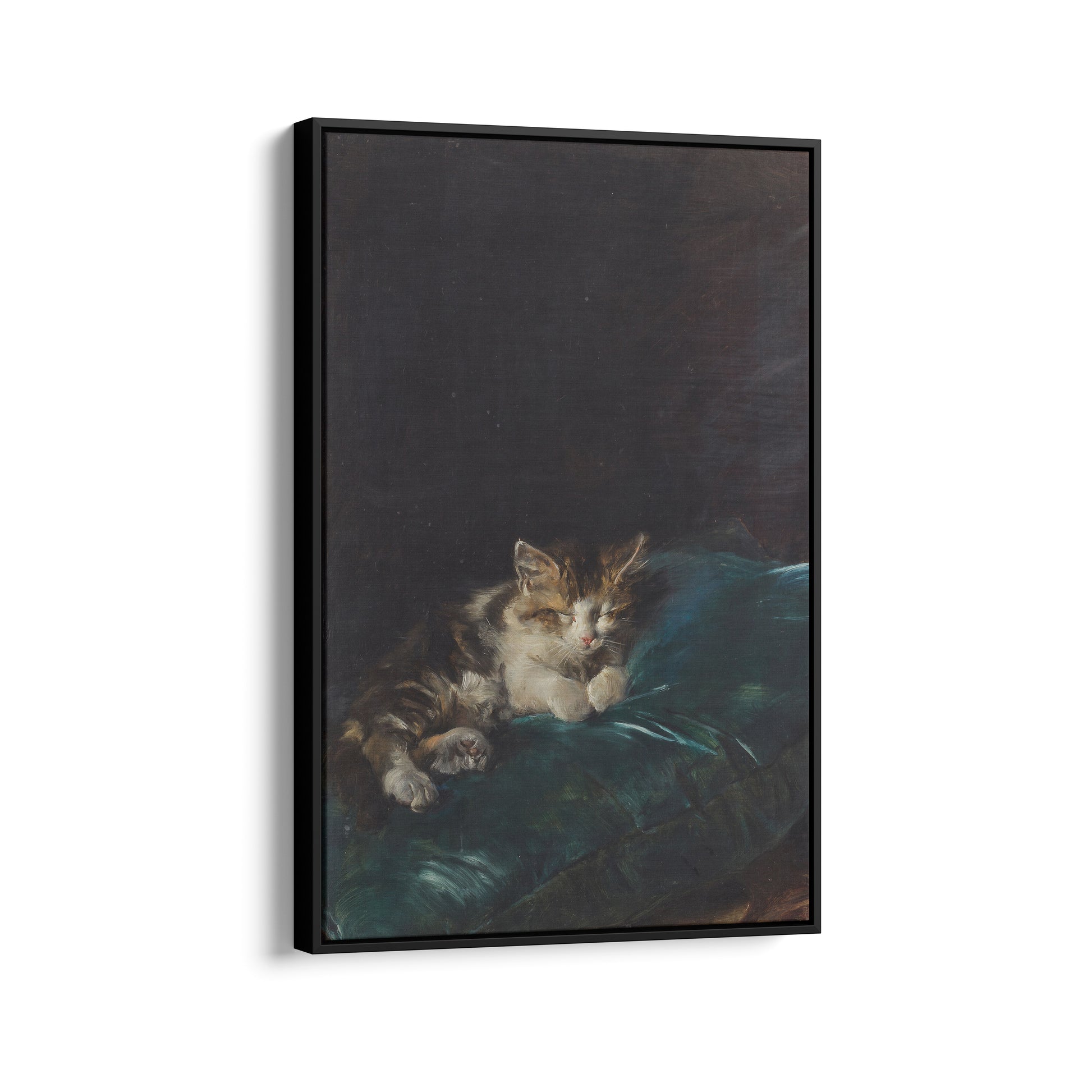 Francisco Domingo Marqués’s Cat Sleeping on a Cushion (1892) is a quietly enchanting example of 19th-century Spanish genre painting that elevates an ordinary domestic scene into a subtle study of texture, light, and calm presence; executed in oil on panel and signed by the artist, the composition centers on a peacefully resting cat curled atop a soft cushion, inviting viewers to linger on the contrast between the animal’s fur and the plush fabric, and suggesting Marqués’s sensitivity to the tactile qualities of his subjects and his ability to find dignity and tranquility in everyday life.