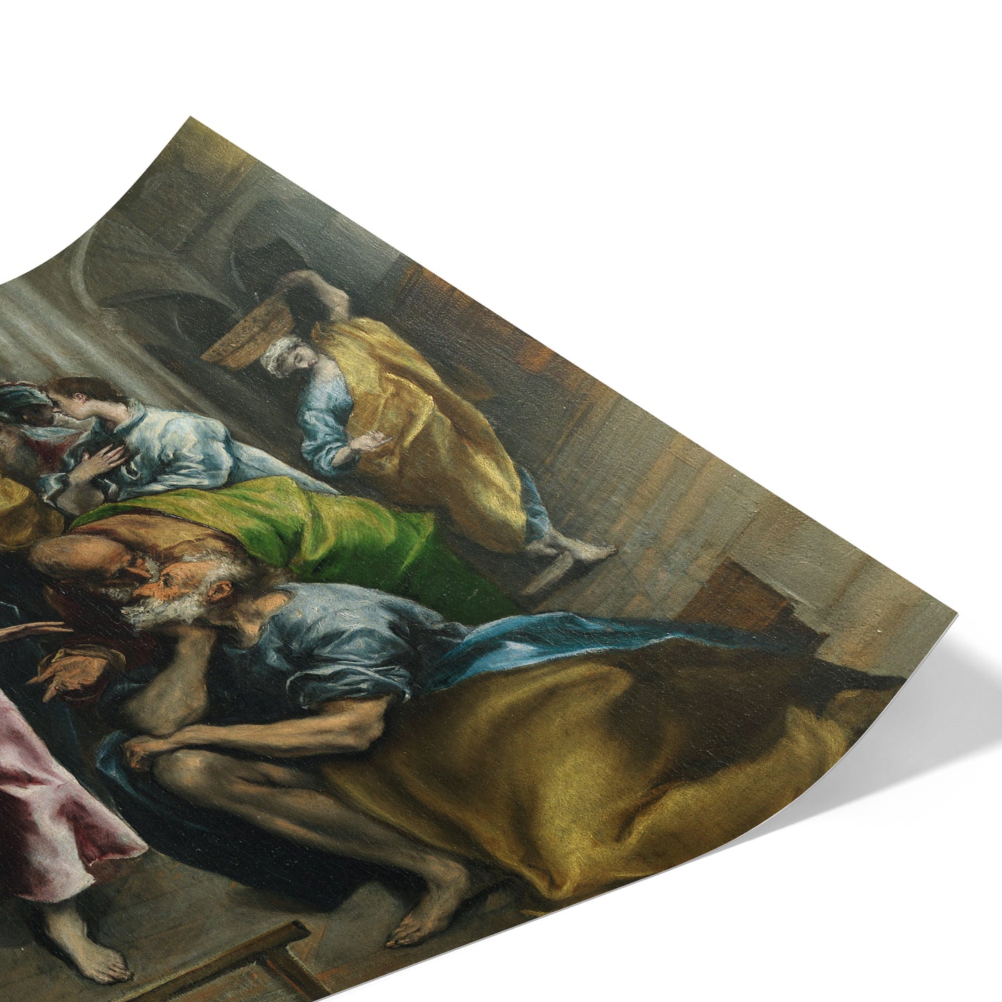 El Greco's Christ Driving the Money Changers from the Temple depicts the dramatic moment when Christ, overwhelmed with righteous anger, expels merchants and money changers from the sacred temple. The scene captures Christ in the act of raising his hand, a whip in his grasp, as the merchants flee in panic, their overturned tables and scattered belongings adding to the chaos. The painting emphasizes the tension between spiritual purity and material corruption, symbolized by the contrast between Christ’s calm determination and the frantic movements of those he confronts. Interestingly, there are several versions of this painting, each offering slight variations in composition and emphasis, showing El Greco’s ongoing engagement with this powerful theme. Despite its moral significance, the Church has not always embraced such depictions, as they present Christ in a state of visible anger, an emotion that some felt conflicted with the image of his divine compassion and serenity. This duality makes the painting a compelling exploration of justice and human fallibility.