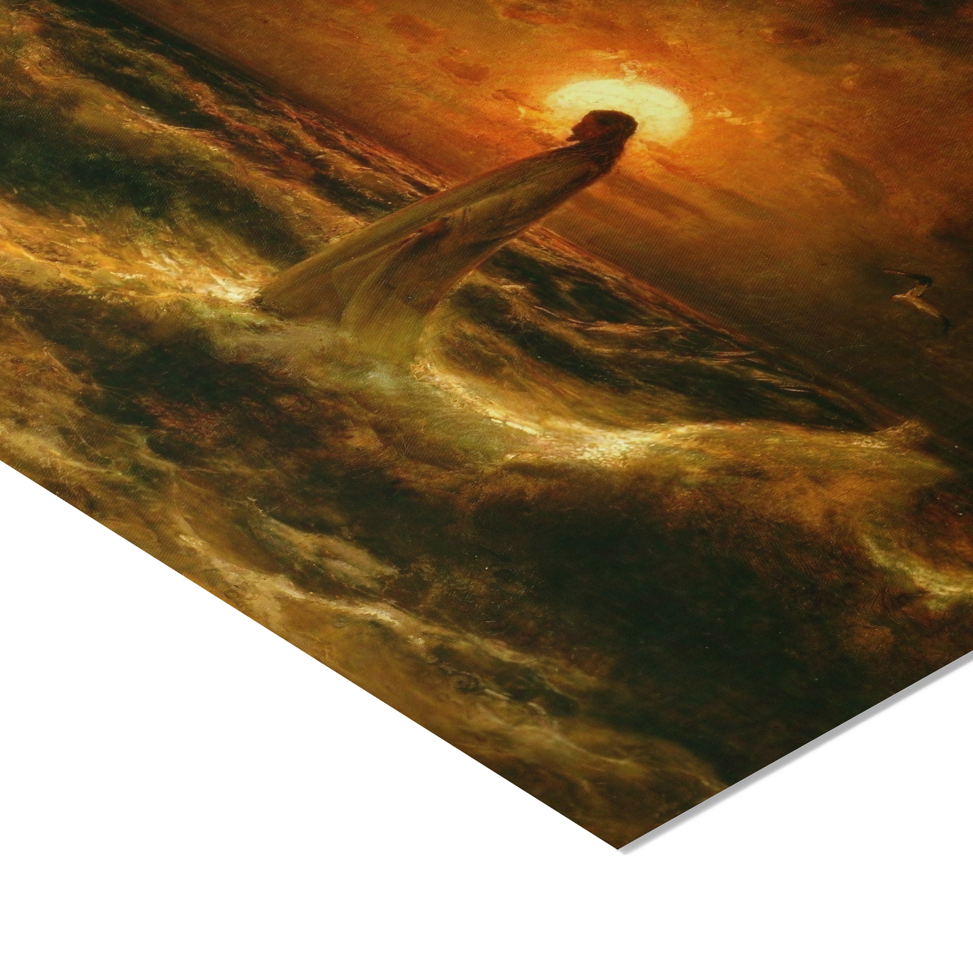 Julius Sergius von Klever’s Christ Walking on Water (c. 1880) transforms a biblical miracle into a dramatic study of atmosphere, mood, and divine presence. Instead of placing Christ at the center, Klever immerses him in a vast, stormy seascape where nature seems on the brink of chaos. The dark, rolling waves and the turbulent sky dominate the canvas, making Christ’s small, luminous figure feel both fragile and overwhelmingly powerful—an anchor of calm against the violence of the storm. The painting’s emotional force comes from this contrast: the world is in turmoil, yet Christ walks with quiet certainty, his glow subtly reflected in the water. By emphasizing scale and environment over narrative detail, Klever turns the scene into a meditation on faith—suggesting that the miraculous is not always loud or triumphant, but sometimes a quiet defiance of the darkness surrounding us.