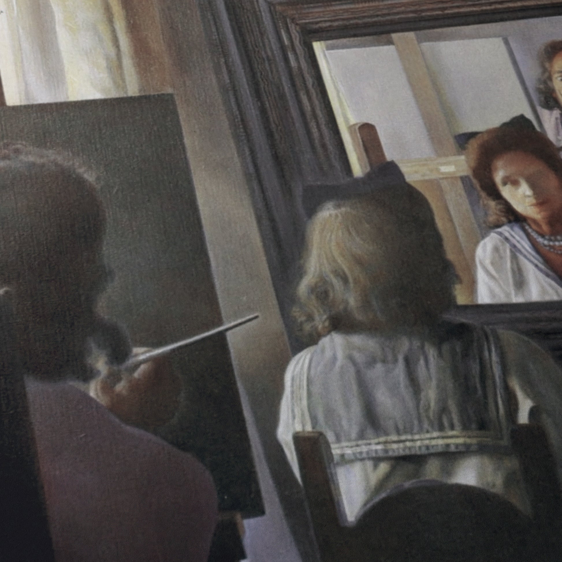 Dalí Seen from the Back Painting Gala from the Back Eternalised by Six Virtual Corneas Provisionally Reflected by Six Real Mirrors (1972–73) is one of Salvador Dalí’s most complex meditations on perception, identity, and infinity. In this painting, Dalí portrays himself from behind while painting Gala, also seen from behind, multiplying their images infinitely through the concept of six corneas and six mirrors. The work merges hyper-realistic detail with optical experimentation, creating a recursive effect that reflects Dalí’s fascination with physics, vision, and metaphysics during his later “nuclear mysticism” phase. By refusing a traditional frontal portrait and instead exploring reflection and perspective, Dalí underscores the act of seeing as central to both art and existence. The result is not just a portrait of the artist and his muse, but a philosophical statement about the nature of reality and the limits of perception.