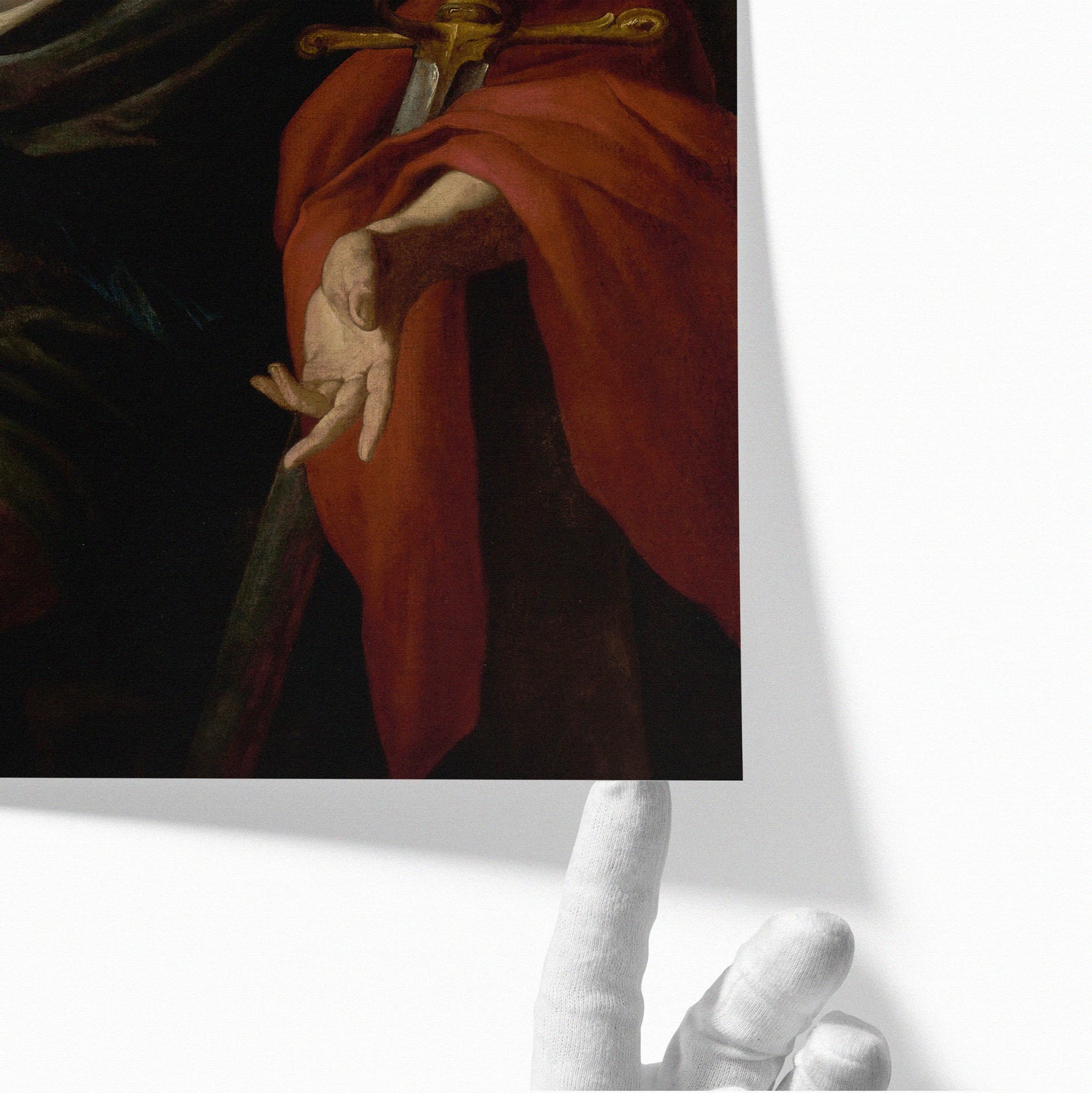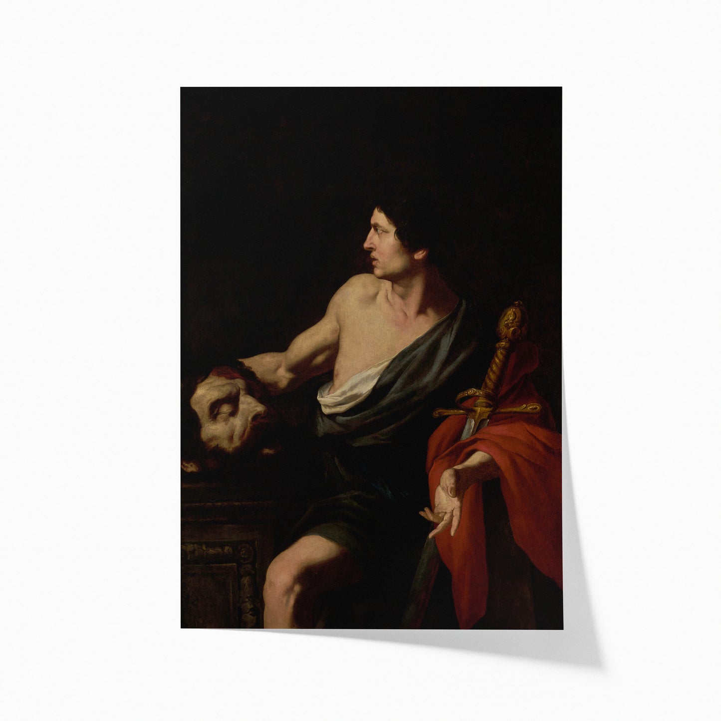 "David with the Head of Goliath" by Pietro Novelli, completed in the 17th century, is a powerful and emotive painting depicting the biblical scene of David triumphantly holding the severed head of the giant Goliath. Novelli captures the intense moment of victory and courage as David, a shepherd boy turned hero, gazes triumphantly at the viewer. The head of Goliath hangs limp in his hand, a stark reminder of the biblical tale of bravery and divine intervention. The painting is filled with dramatic contrasts of light and shadow, emphasizing the heroic stature of David against the defeated Goliath. Novelli's meticulous attention to detail, from the expression on David's face to the blood dripping from Goliath's head, adds to the intensity and realism of the scene. "David with the Head of Goliath" is a poignant portrayal of courage, faith, and the triumph of good over evil, inviting viewers to reflect on themes of heroism and divine providence.