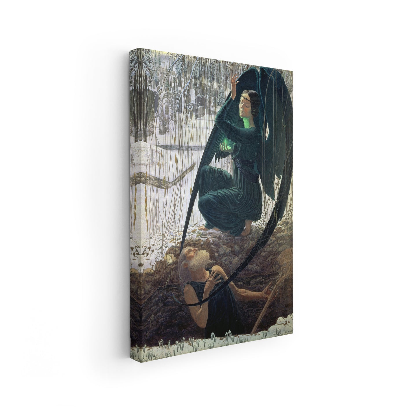 Carlos Schwabe’s Death and the Gravedigger (1890) is a hauntingly poetic exploration of mortality, labor, and the inevitability of death. In this Symbolist masterpiece, Schwabe juxtaposes the ethereal and the earthly: the gravedigger, weary and somber, represents the toil and inevitability of human mortality, while the spectral figure of Death looms beside him, adorned in flowing, angelic robes. Death is depicted not as a menacing force but as a serene and almost consoling presence, embodying the Symbolist fascination with death as a transition rather than an end. The muted, melancholic palette and the stark contrast between light and shadow emphasize the spiritual and existential undertones of the scene. Schwabe’s meticulous attention to detail, from the gravedigger’s tools to the haunting expression of Death, invites viewers to contemplate the cyclical relationship between life and death, labor and rest, and the fragility of human existence in the face of the eternal.