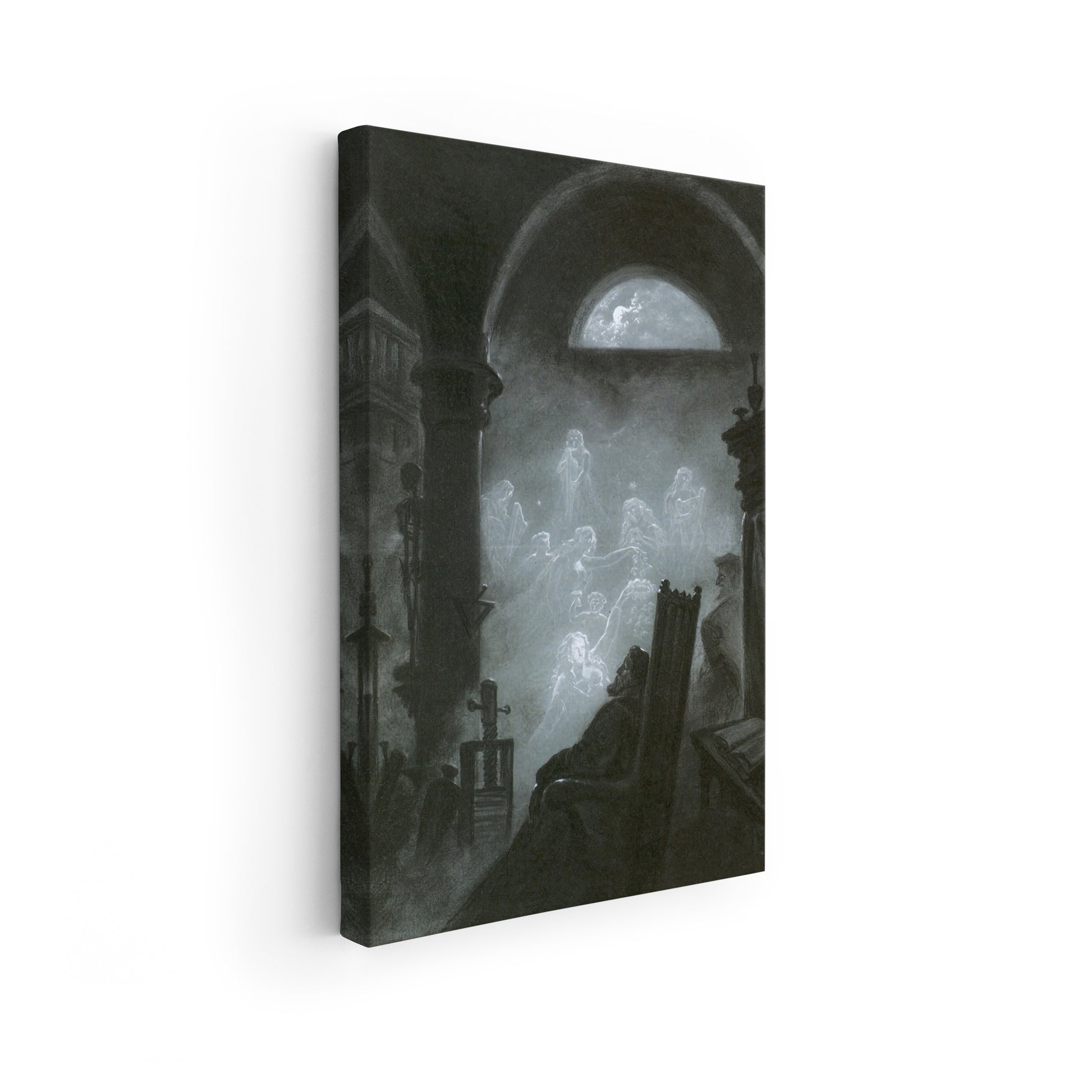 In Faust’s Dream (1852) by Carl Gustav Carus, the tortured scholar of Johann Wolfgang von Goethe’s legend is captured at the moment of haunting introspection and spectral encounter: Carus places Faust in a dimly lit chamber, the walls heavy with shadow and the large arched window beyond suggesting an indifferent cosmos, while faint ghost-like forms swirl around him in the half-light, evoking Mephistopheles’s realm of temptation and the inner abyss of Faust’s longing. The minimal palette and the technique of body-colour on charcoal heighten the dream-state, dissolving the boundary between reality and vision, showing not just a theatrical scene but the Romantic preoccupation with the sublime, the inner self, and the metaphysical search for meaning. Through the isolation of the figure and the restless apparition of the phantoms, Carus visualises the conflict between knowledge and experience, mortality and transcendence — a moment of crisis that is also an invitation to the viewer to consider their own internal “dream”-world of ambition and despair.
