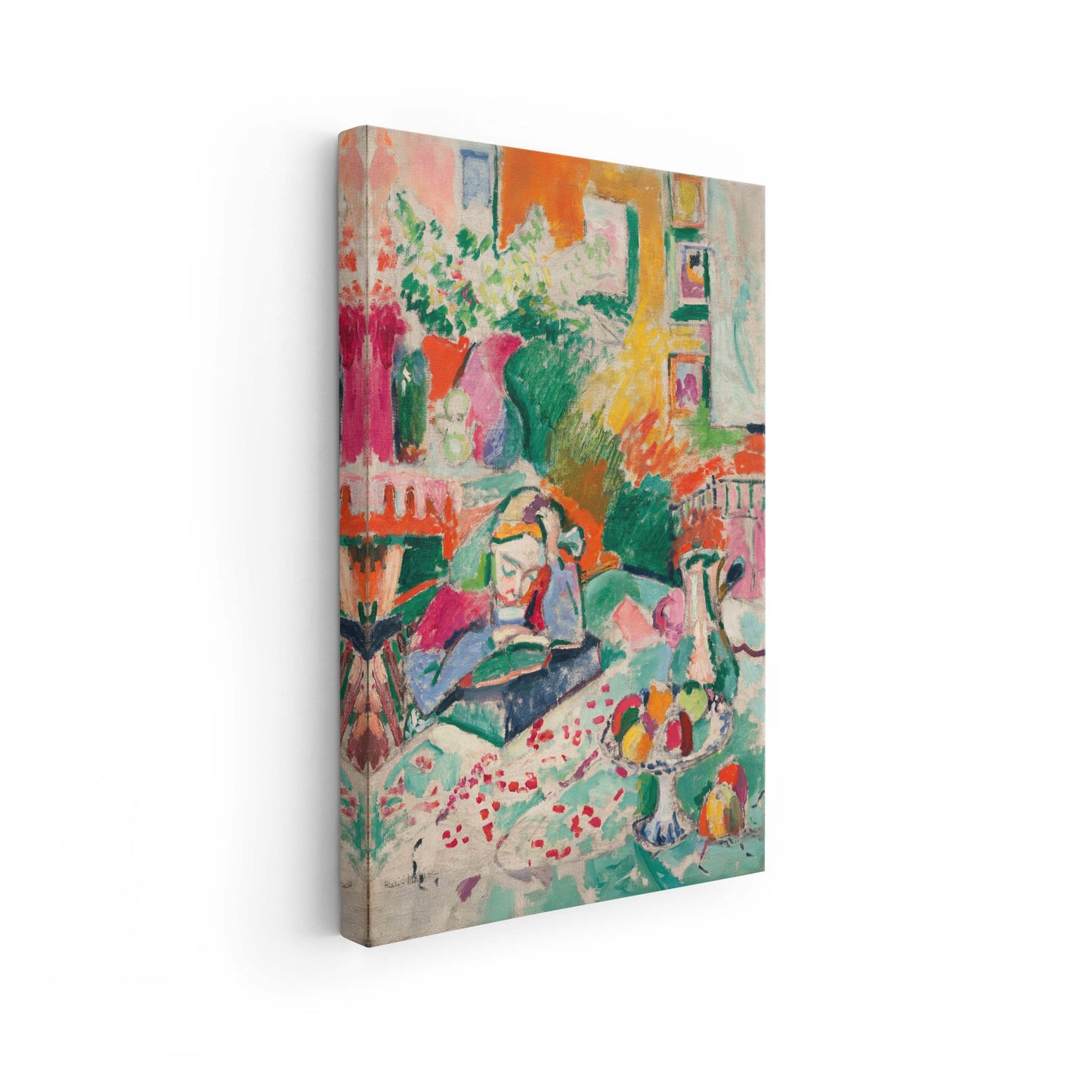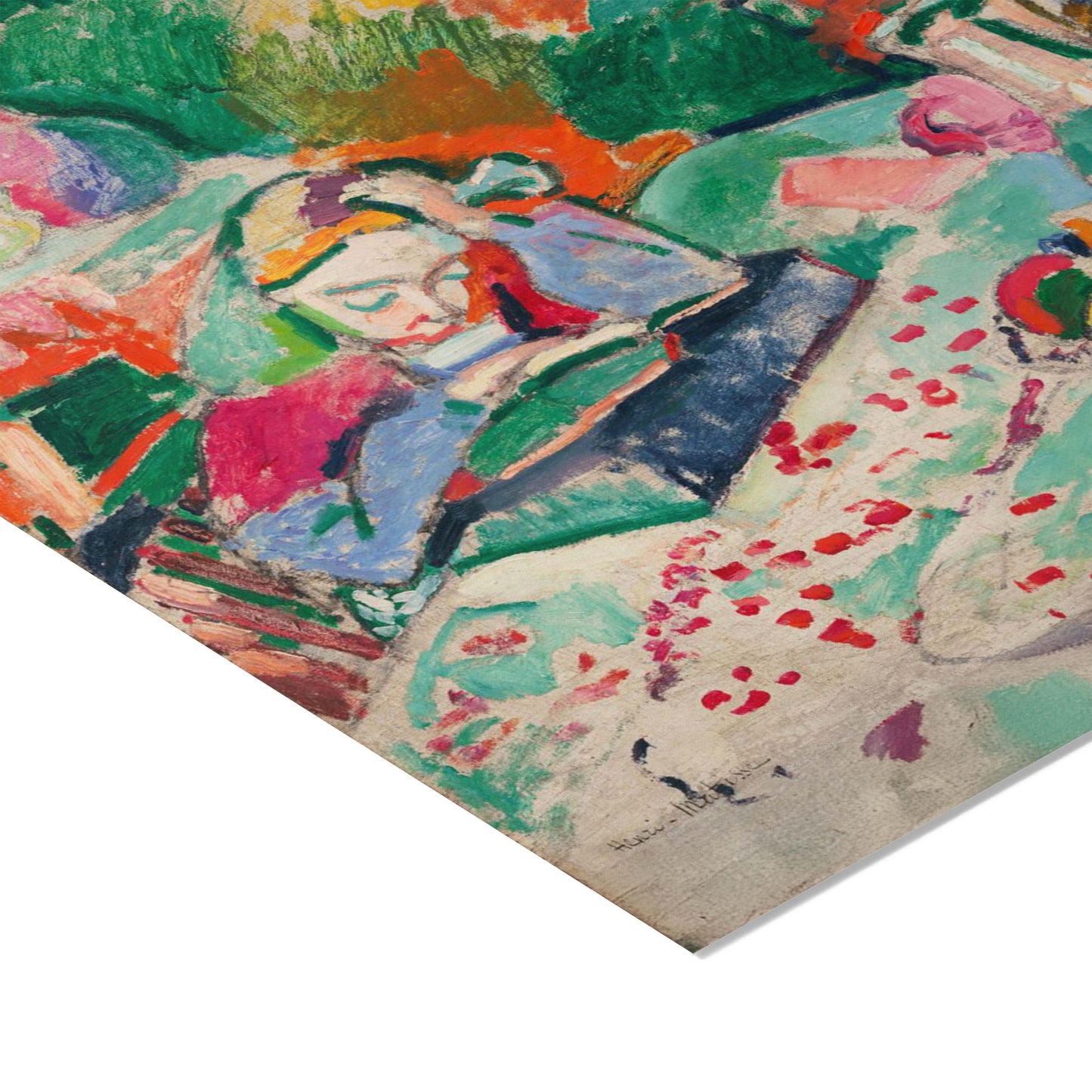 The painting is a vivid celebration of color, with intense reds, yellows, and blues dominating the composition. Matisse’s use of color is more symbolic than realistic, as he sought to express emotion and mood through his palette. The relaxed posture of the girl contrasts with the energetic patterns around her, creating a balance between calm and dynamism. This work reflects Matisse’s innovative approach to color and composition, marking a significant period in his artistic development.
