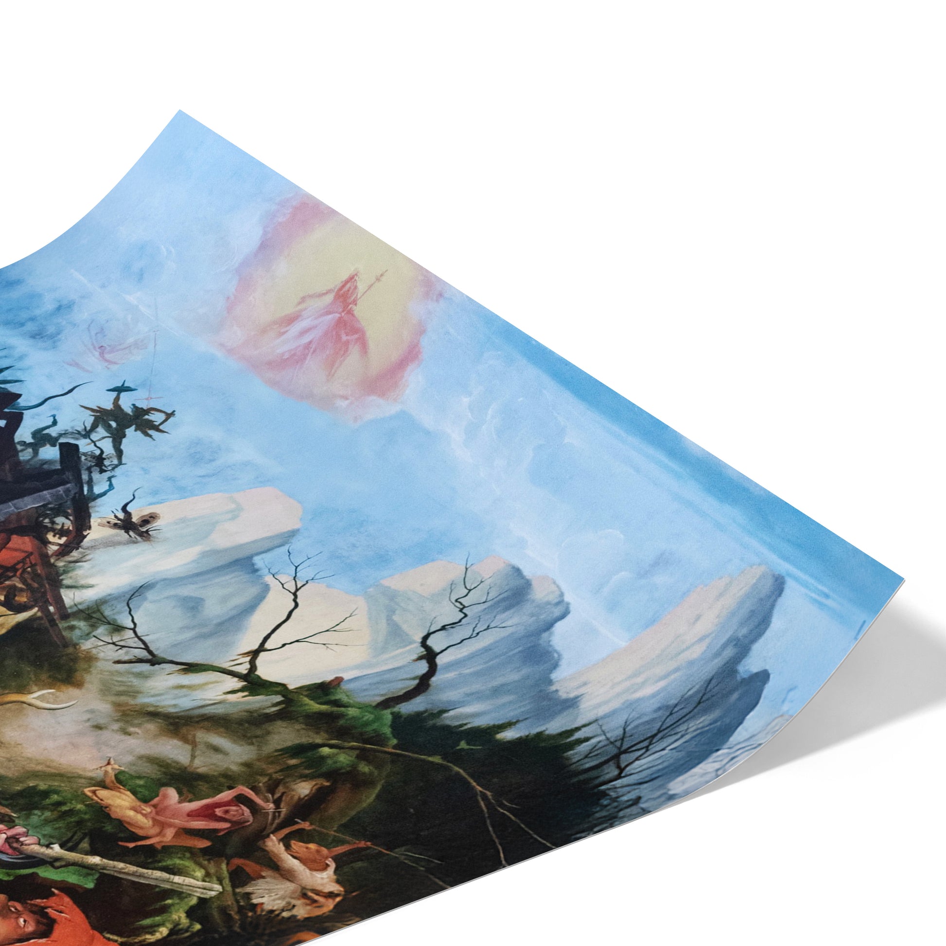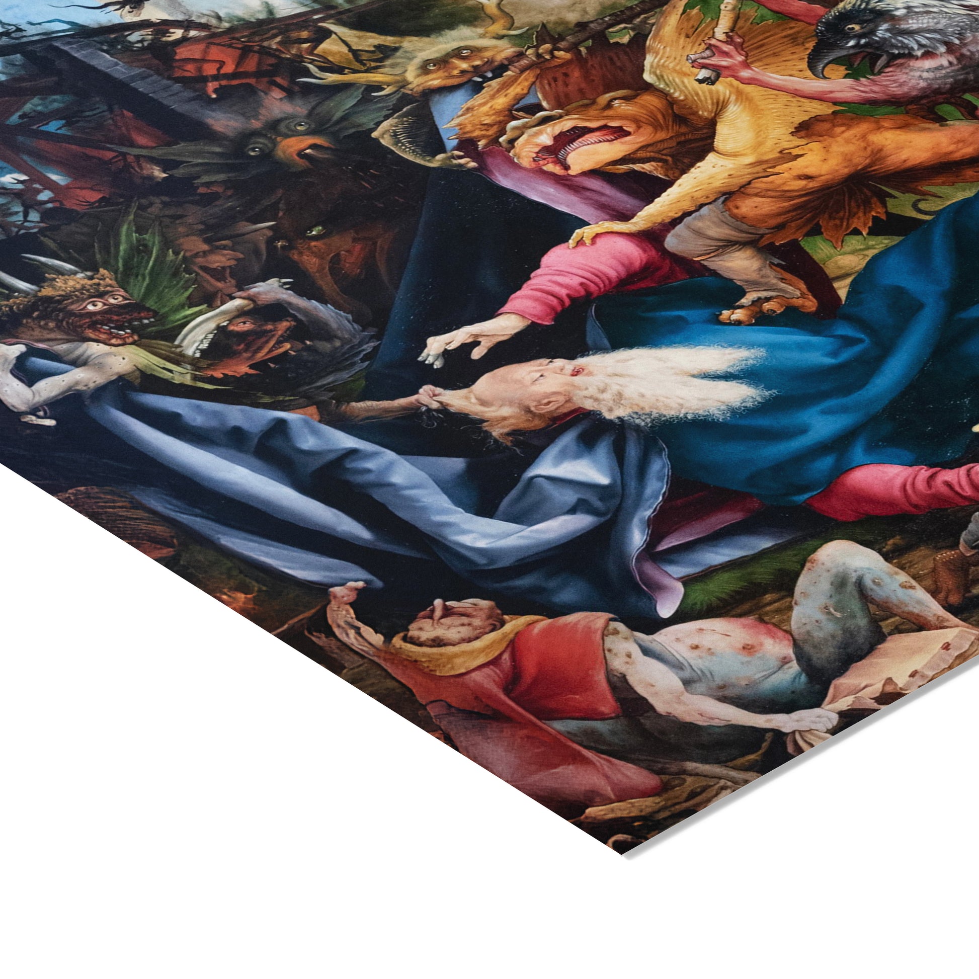 The right panel of the Isenheim Altarpiece’s third view shows The Temptation of Saint Anthony, one of Matthias Grünewald’s most chaotic and visionary compositions. Here, Saint Anthony is violently attacked by grotesque demons that twist, crawl, and swarm around him in a frenzy of color and movement. Each creature embodies disease, decay, and madness — one even bears the same sores that cover Christ’s body in the Crucifixion panel. The scene reflects both the physical torment of the patients who viewed the altarpiece and the spiritual trials of faith itself. Amid the chaos, Saint Anthony remains steadfast, his calm expression contrasting with the monstrous forms that surround him. Grünewald’s use of vivid hues and distorted figures transforms the panel into a hallucinatory vision of suffering and endurance, where horror becomes a pathway to transcendence.