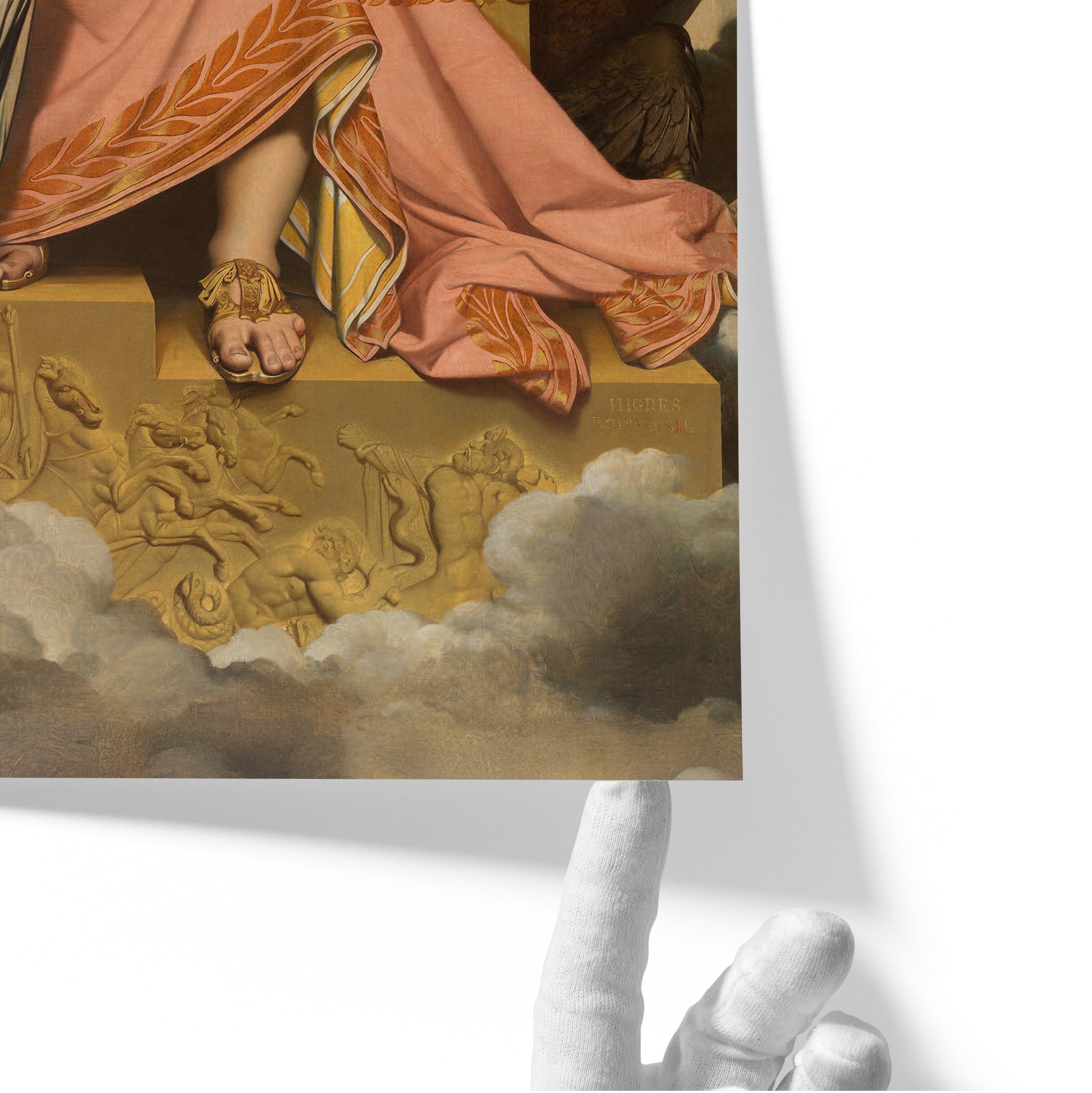 Jean-Auguste-Dominique Ingres’ Jupiter and Thetis (1811) is a masterclass in power imbalance, using scale, posture, and atmosphere to narrate a clash between divine authority and desperate supplication. Jupiter sits monumental and immovable, his body rendered with cold, idealized perfection that evokes classical sculpture, while Thetis leans toward him with a serpentine, almost liquid grace, her gesture both pleading and intimate. Ingres exaggerates their proportions to make Jupiter overwhelming and Thetis fragile, turning the scene into a visual argument about dominance and persuasion. The darkness surrounding Jupiter contrasts with the luminous skin of Thetis, creating a tension between immovable will and emotional vulnerability. The result is a painting that feels theatrical and psychological at the same time—a moment where myth becomes a vehicle for exploring desire, hierarchy, and the limits of influence.