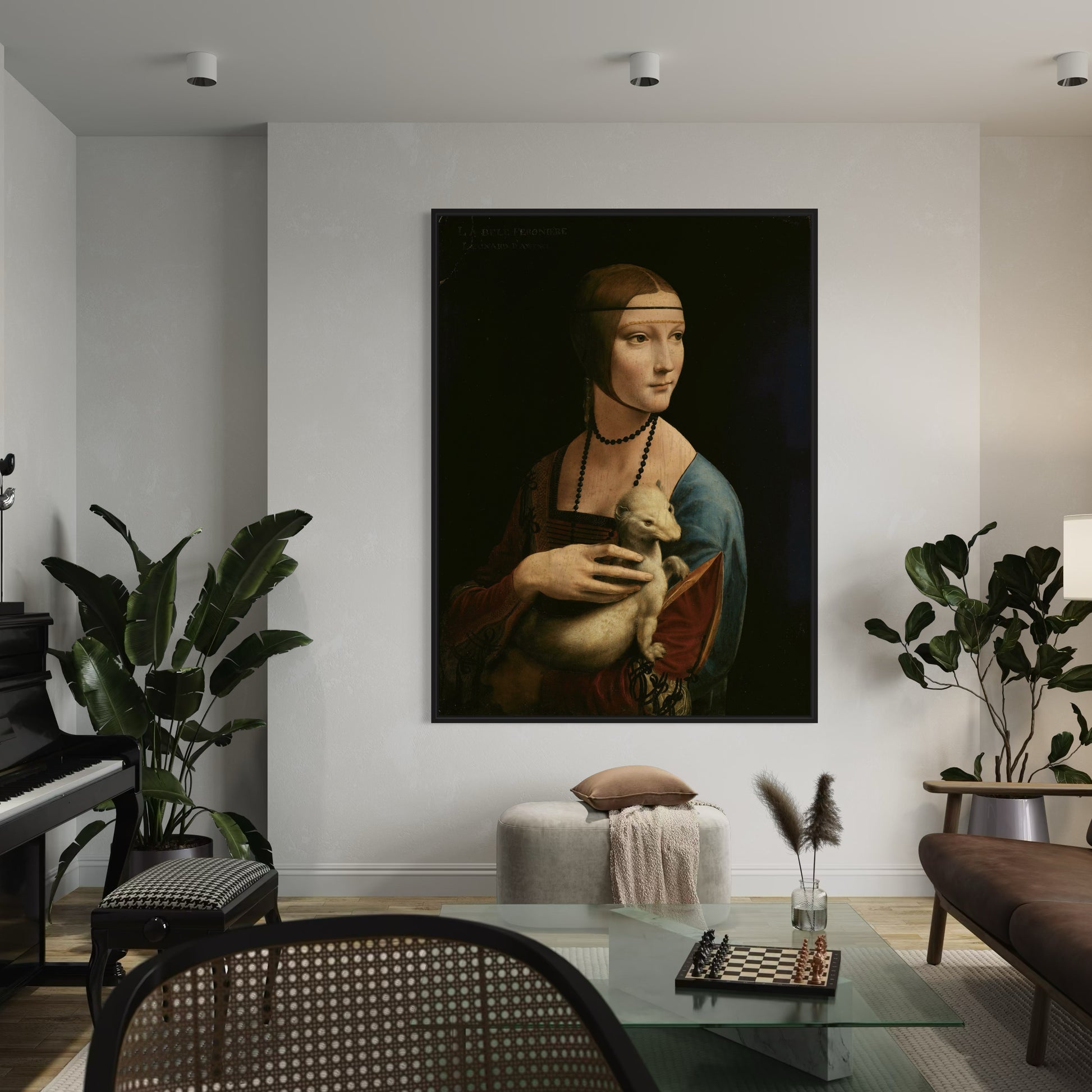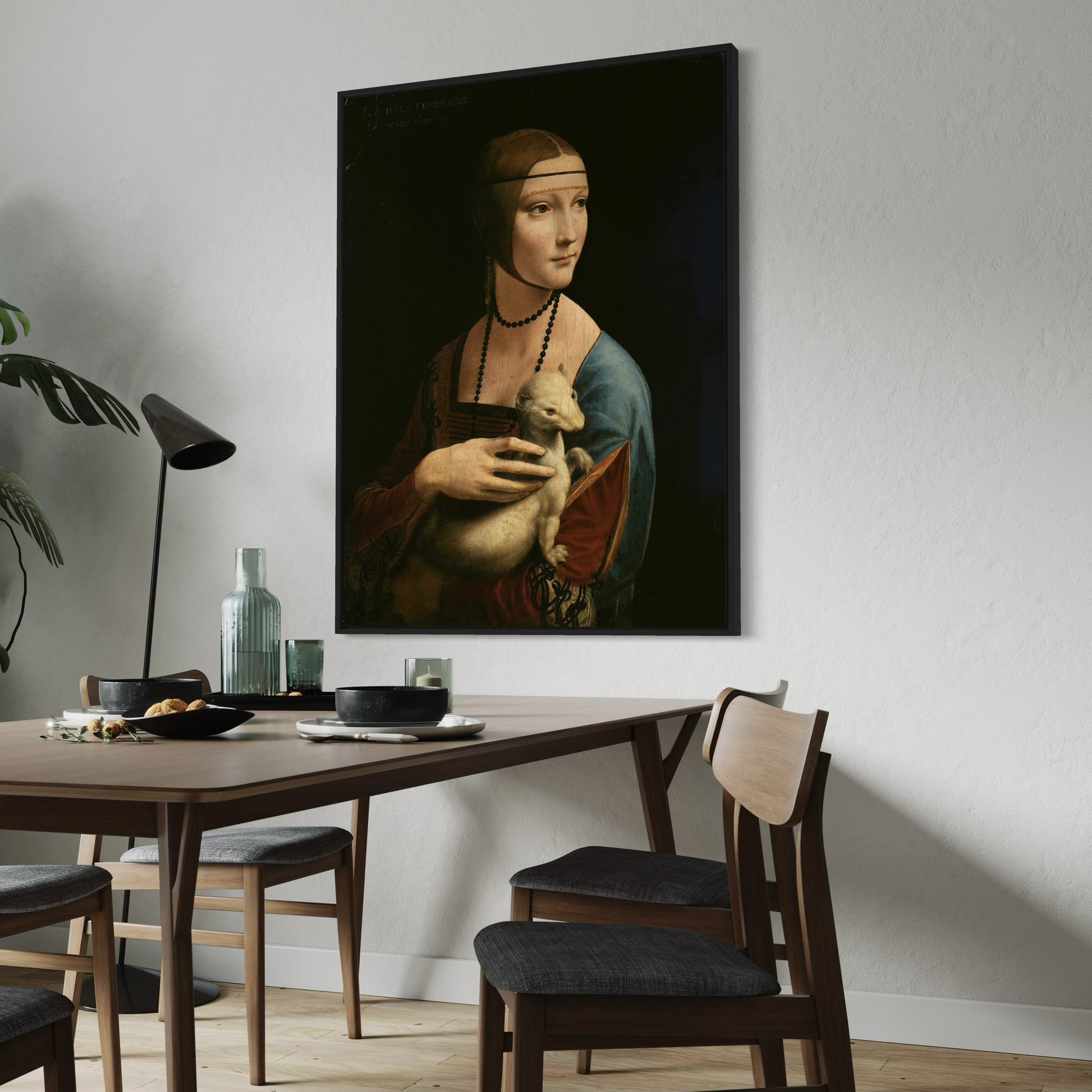 "Lady with an Ermine" is a renowned portrait painted by Leonardo da Vinci circa 1489–1490. This masterpiece portrays Cecilia Gallerani, a young noblewoman from Milan, holding an ermine, which was a symbol of purity and erudition during the Renaissance. Leonardo's attention to detail and mastery of light and shadow are evident in this painting, as seen in the delicate rendering of the lady's features and the soft texture of the ermine's fur. The composition exudes elegance and grace, with the lady depicted in three-quarter profile, her gaze directed off to the side. "Lady with an Ermine" is celebrated for its psychological depth and subtle expression, capturing the enigmatic allure of its subject. Through this portrait, Leonardo showcases his unparalleled skill in capturing the essence of his subjects and conveying their inner thoughts and emotions.