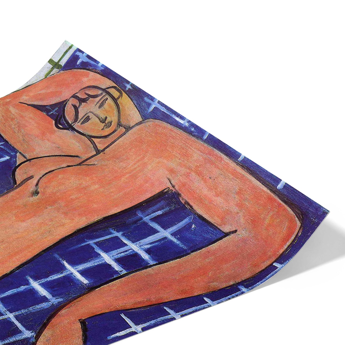In this painting, Matisse presents a bold, simplified portrayal of the female nude, characterized by flowing lines and vibrant colors. The figure, depicted reclining on a draped surface, is rendered with smooth, curving shapes and vivid hues, which contrast with the more subdued background. The composition is both dynamic and serene, reflecting Matisse's interest in exploring the harmony between form and color.