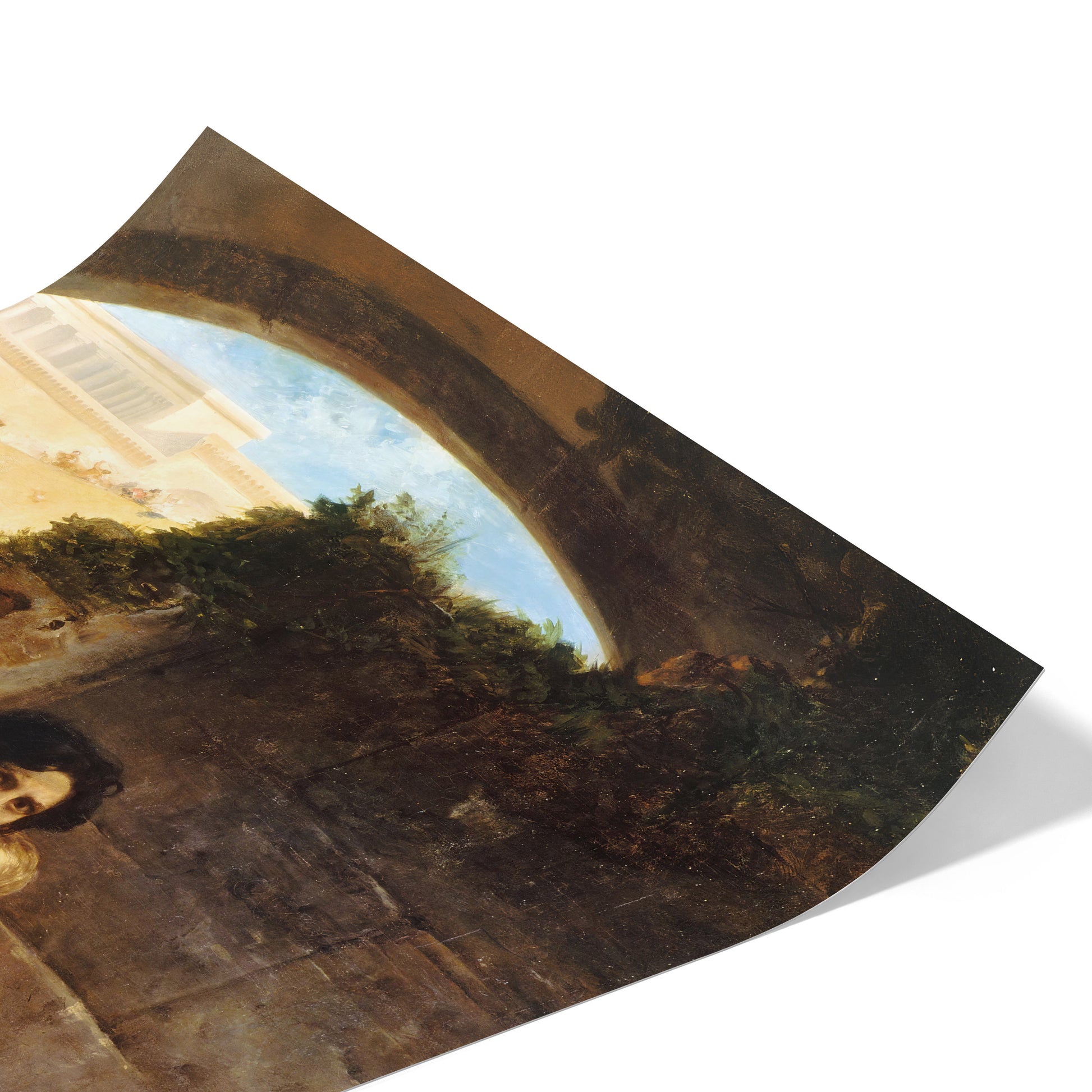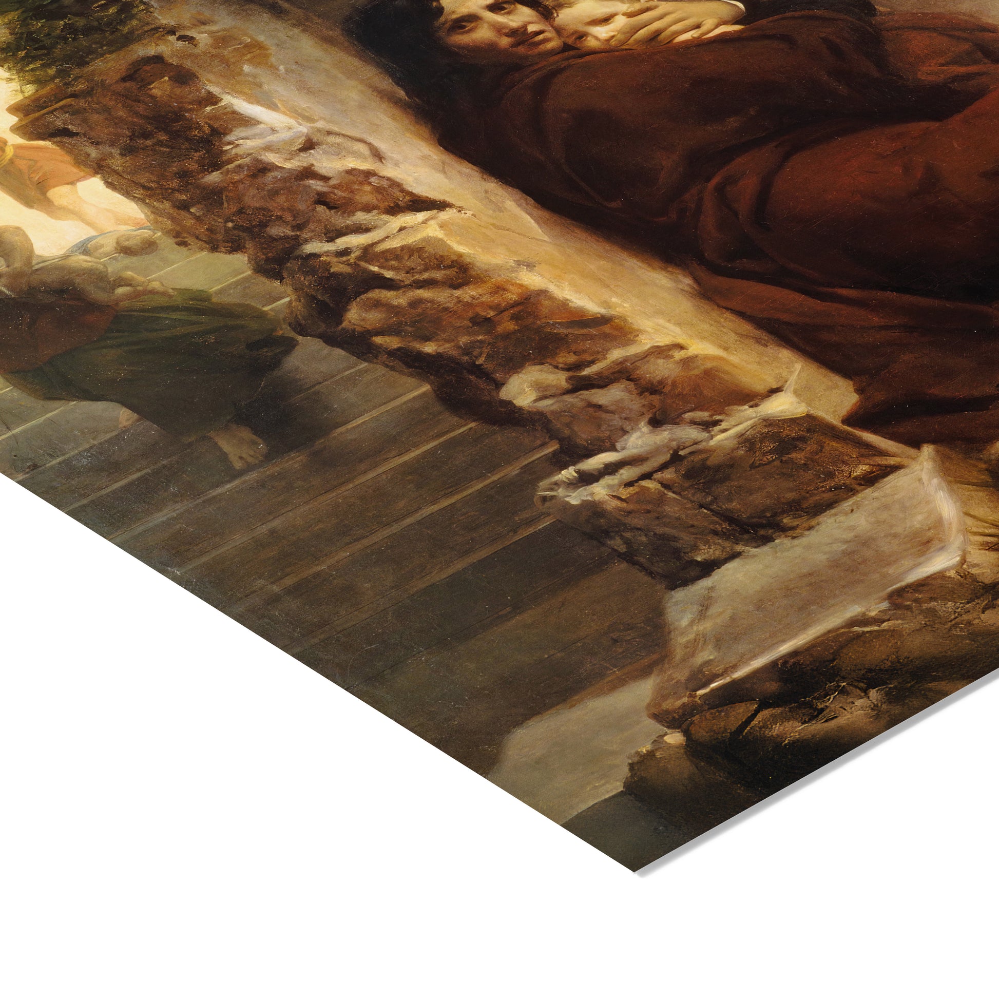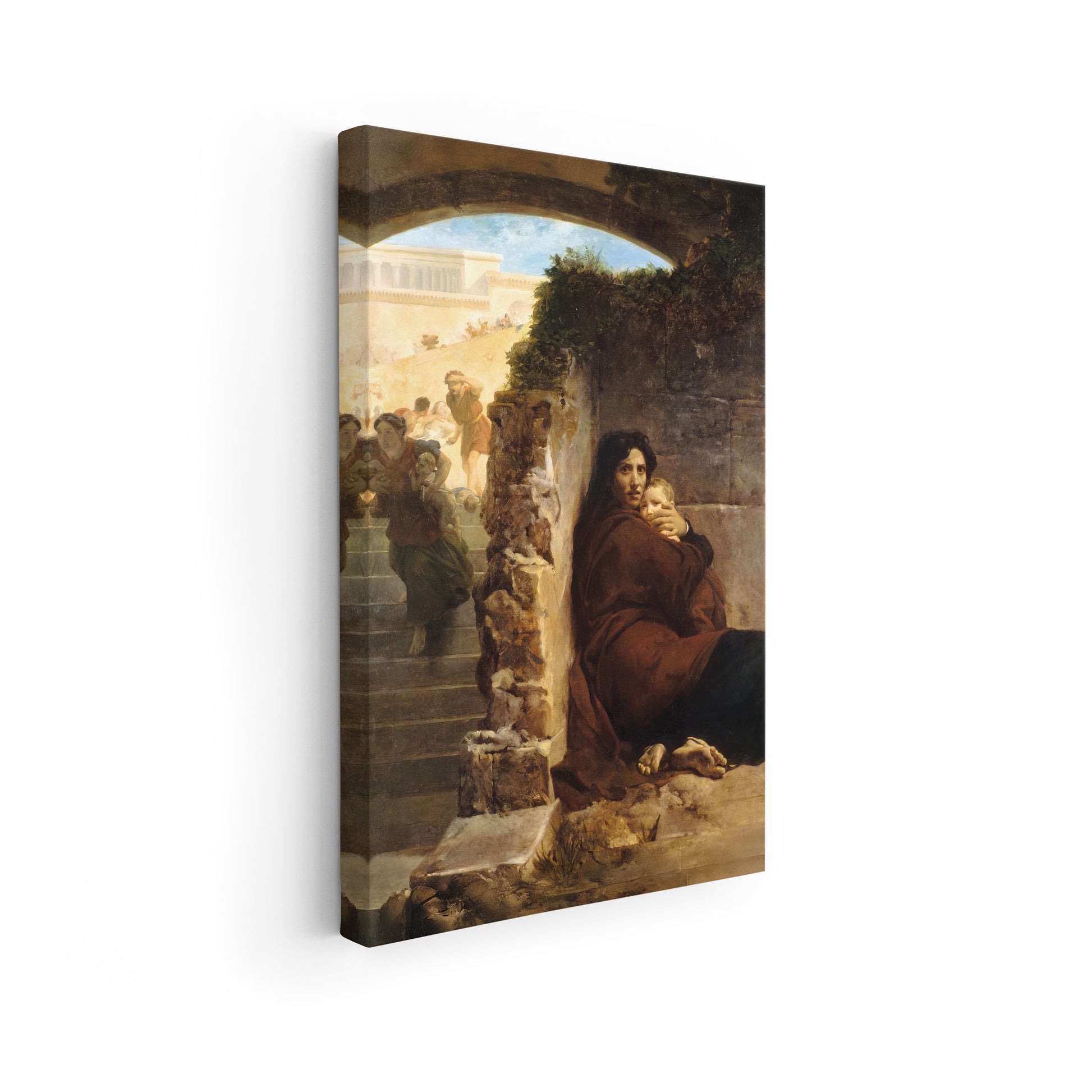 In Massacre of the Innocents (1824), Léon Cogniet transforms one of the most brutal biblical episodes into an intimate and silent tragedy. Instead of depicting soldiers or overt violence, he focuses on a single mother hiding with her child, pressed against a cold wall as she muffles his cries. Her wide, terrified eyes capture the horror of a massacre we cannot see but can deeply feel. In the background, other women flee in panic, their shadows merging into chaos, yet the composition remains eerily quiet. Cogniet’s decision to exclude blood and action makes the scene far more powerful—the true violence lies in the mother’s fear and helplessness. Through minimalism and emotion, the artist redefines biblical storytelling, transforming collective suffering into a single, unforgettable moment of maternal love and despair.