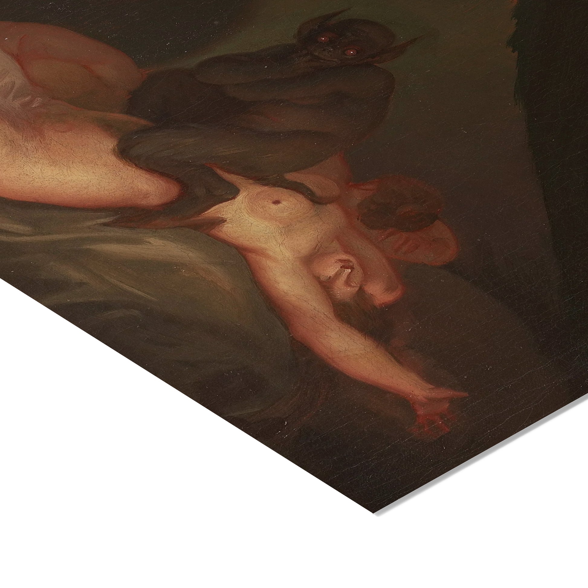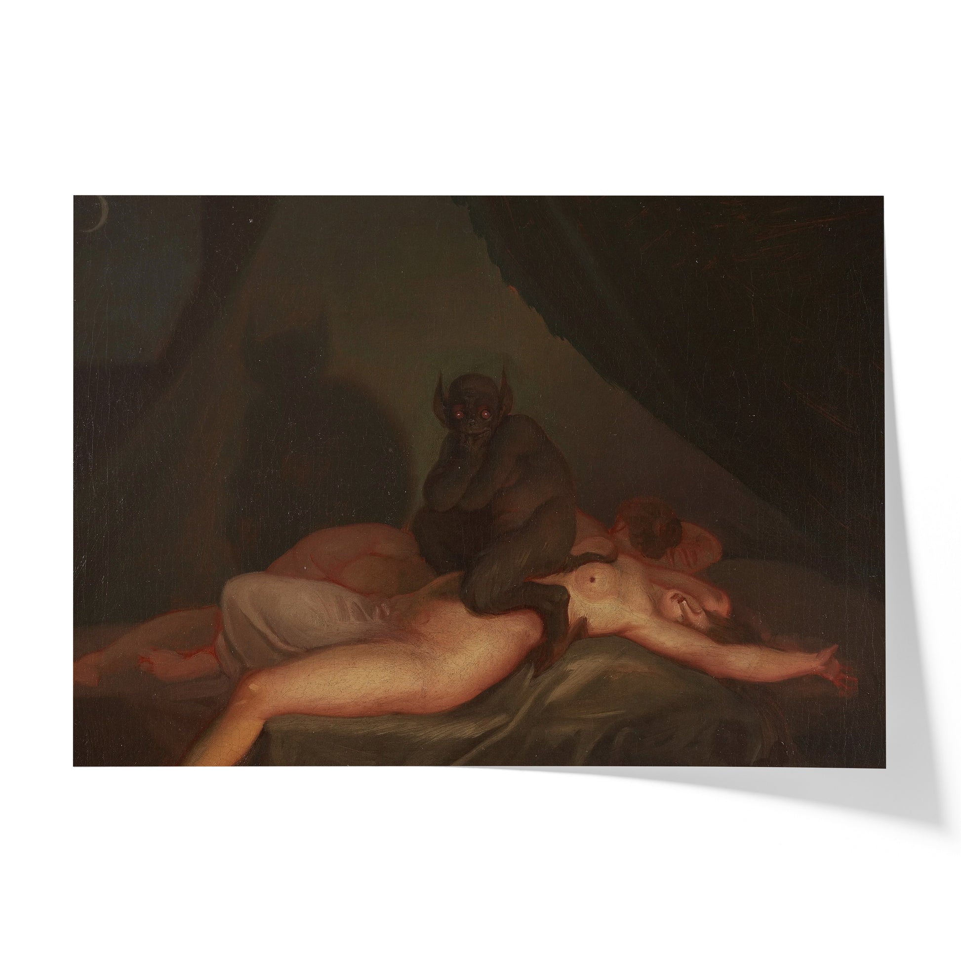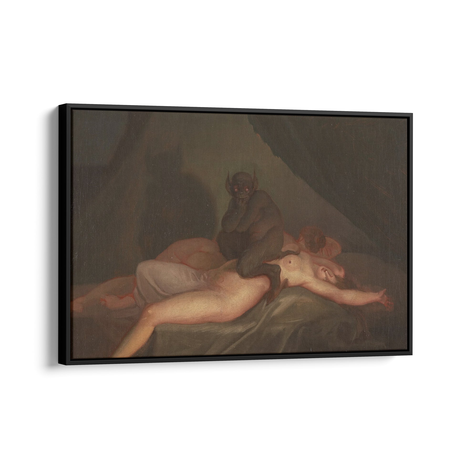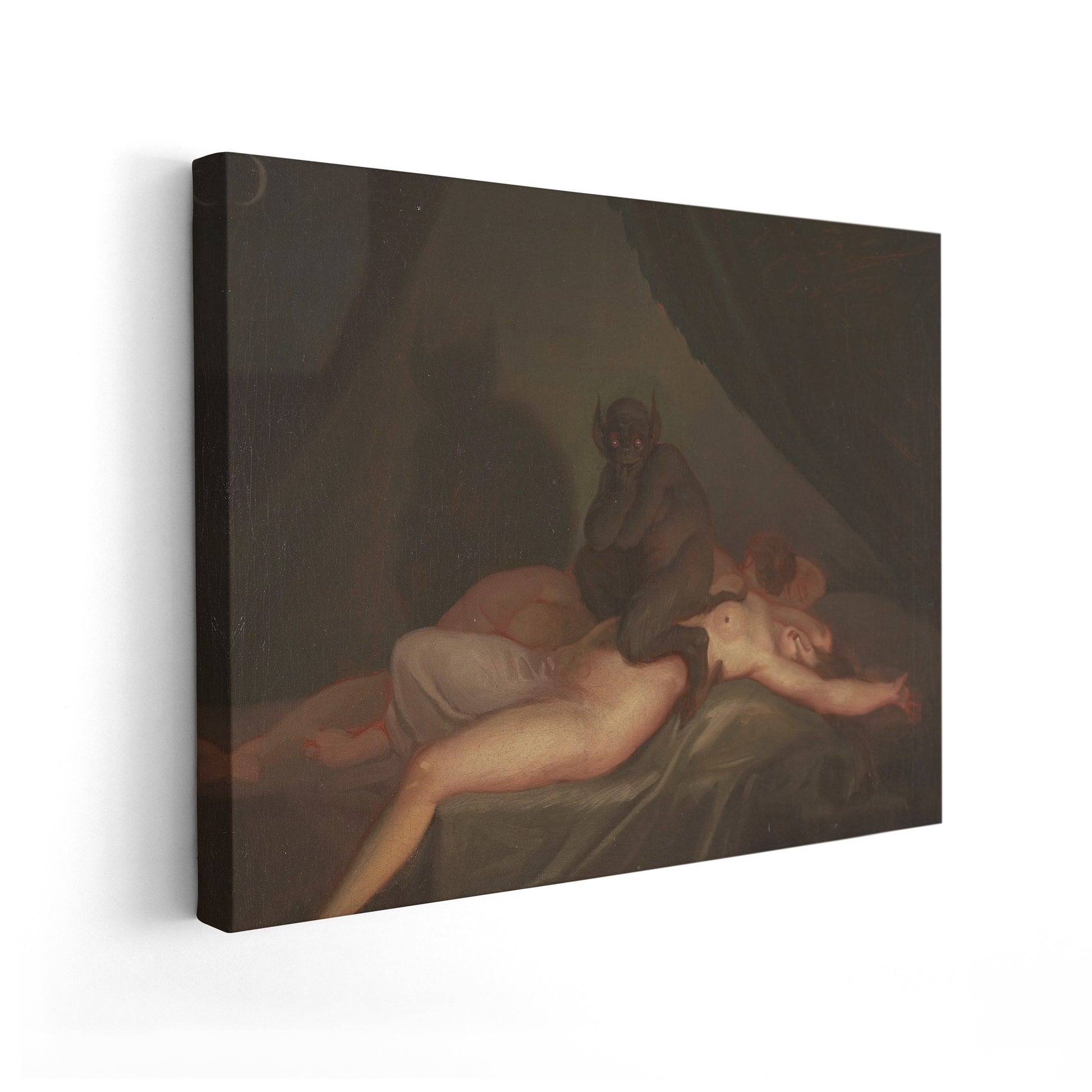 Nicolai Abildgaard's "Nightmare" (1800) is an evocative portrayal of terror and the supernatural. The painting captures a tormented figure, likely in the throes of a nightmare, as a menacing creature looms over them. Abildgaard uses stark contrasts between light and shadow to heighten the sense of dread, while the contorted posture of the sleeping figure conveys intense fear. The spectral quality of the scene, combined with the creature's grotesque appearance, emphasizes the theme of the nightmare as an inescapable, haunting experience, showcasing Abildgaard's mastery in depicting psychological horror.