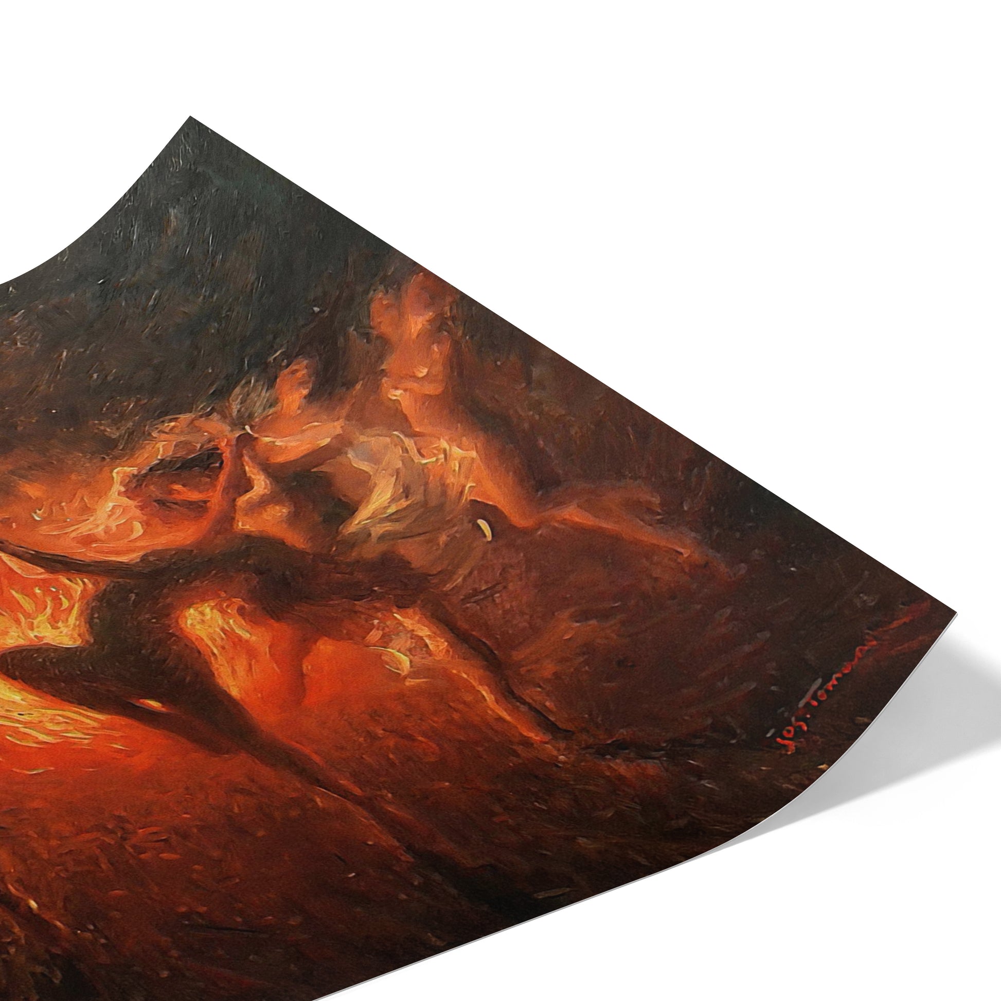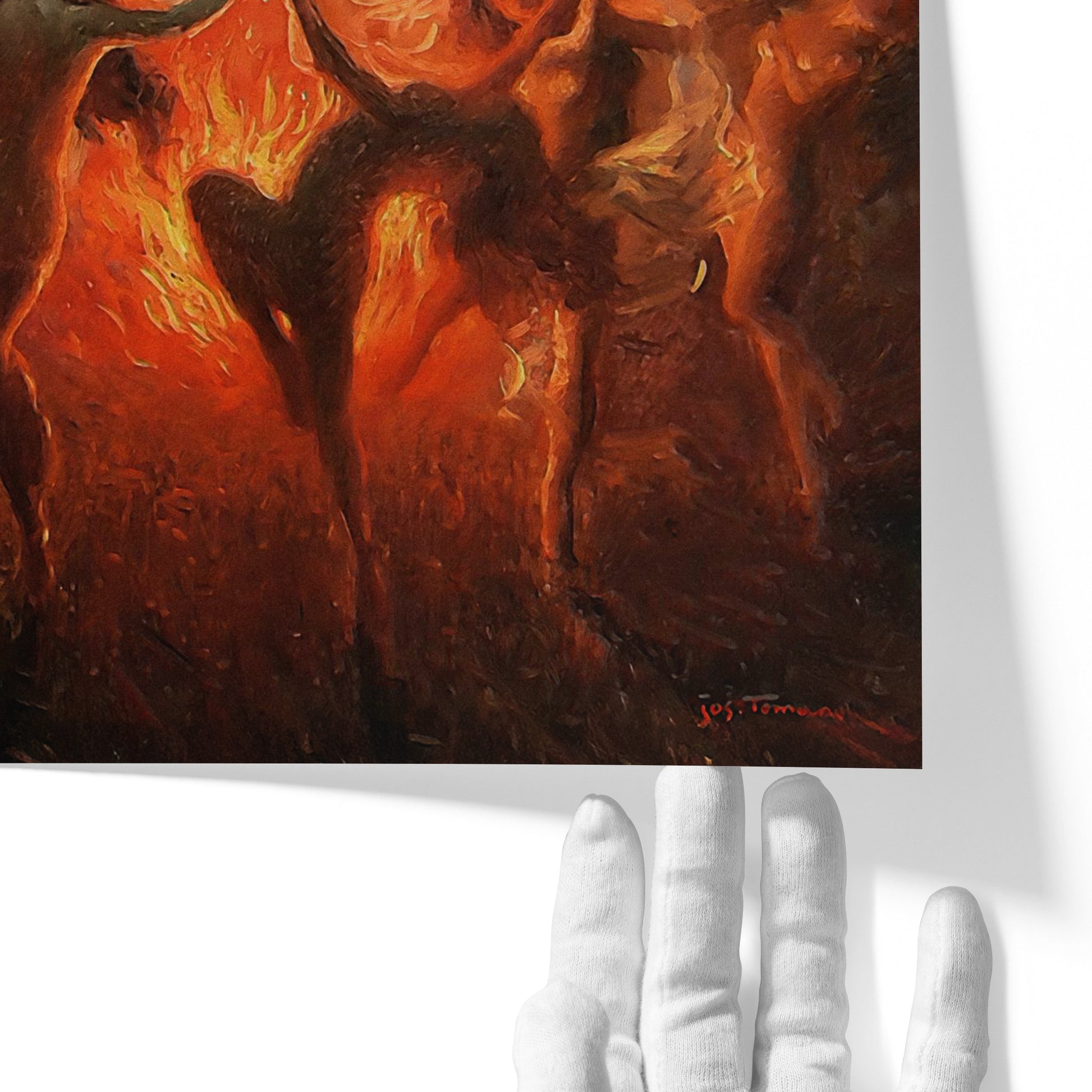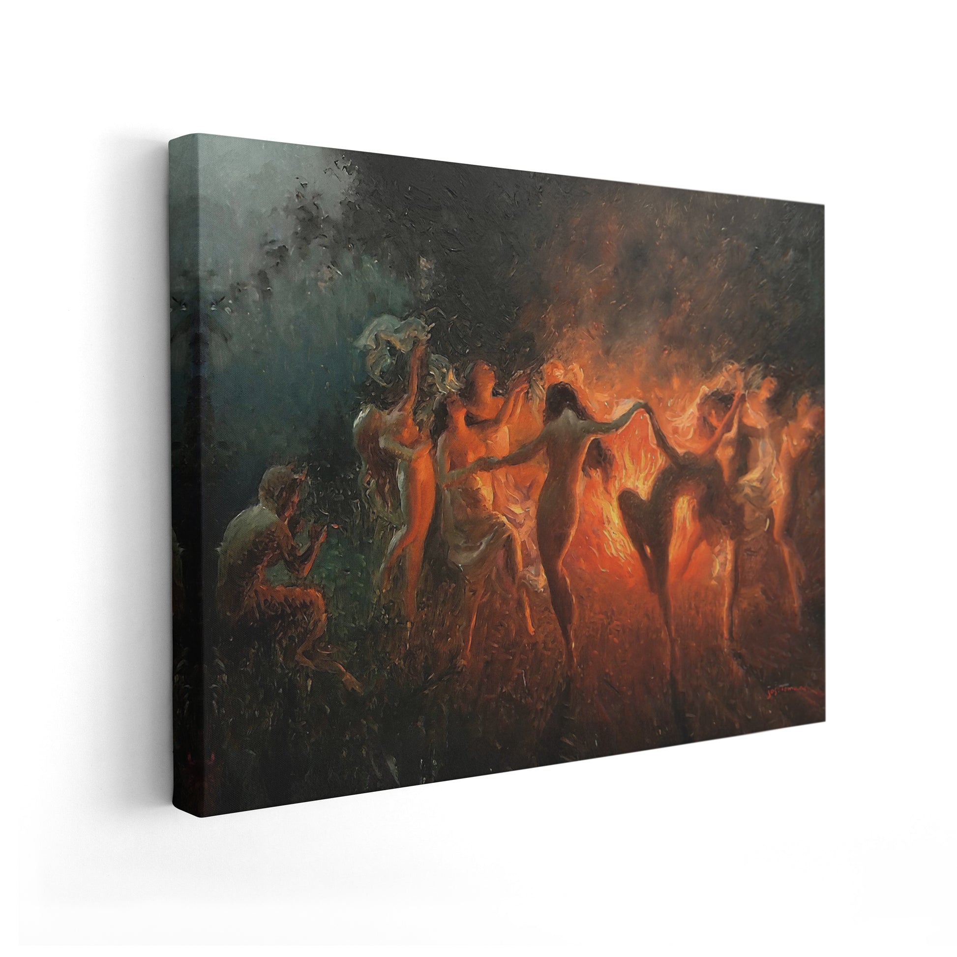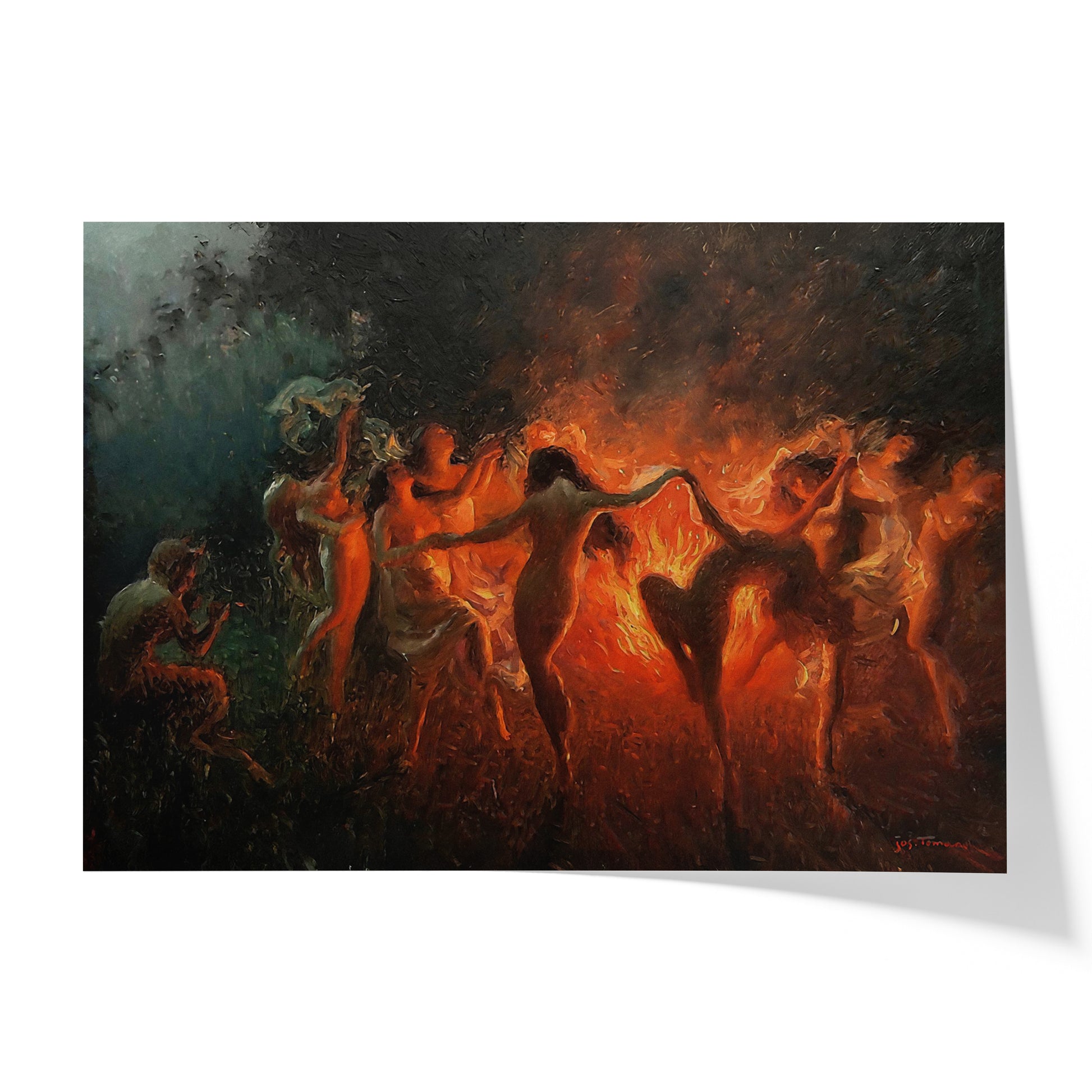 In Nymphs Dancing to Pan’s Flute, Joseph Tomanek invites the viewer into a symbolic vision of unrestrained nature and ancient ritual. The painting is not merely a depiction of myth, but a meditation on the primal forces that exist beyond the boundaries of society. The nymphs, embodiments of natural beauty and freedom, dance in abandon around a fire that symbolizes transformation and desire. At the edge of the scene, Pan plays his flute—an instrument tied to instinct and fertility—guiding the ritual with an unseen but deeply felt rhythm. The interplay of shadow and firelight heightens the painting’s dreamlike atmosphere, turning the moment into an expression of ecstatic communion between the human form, the natural world, and the divine.