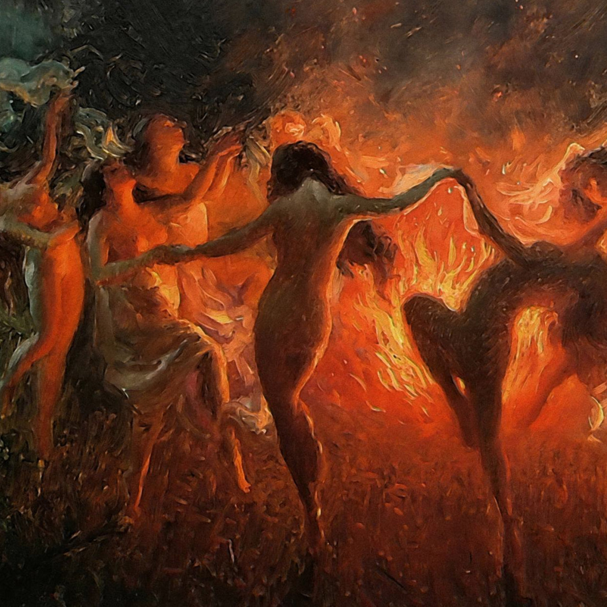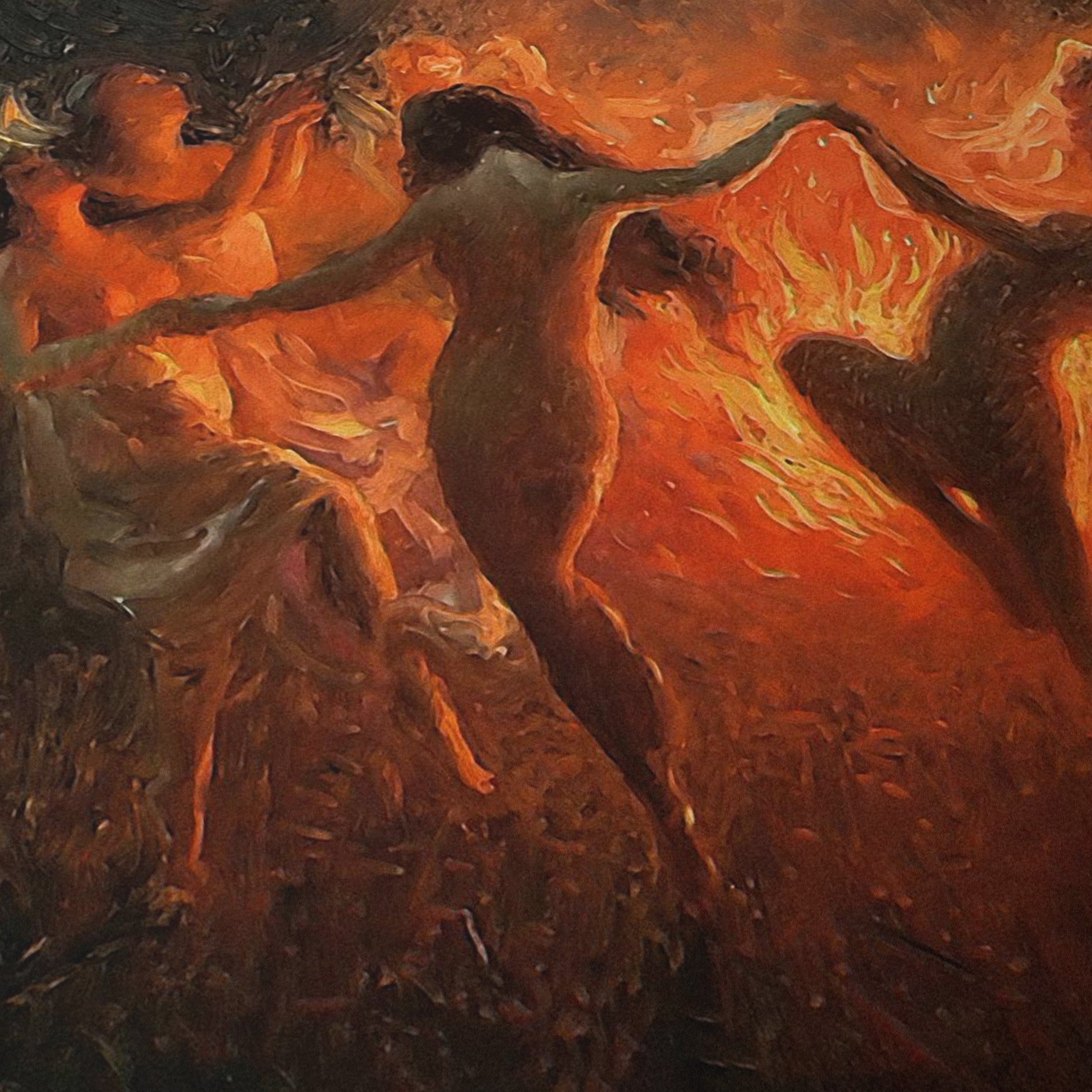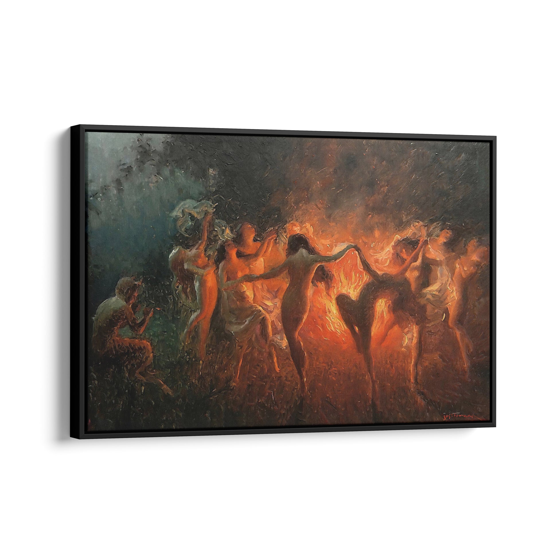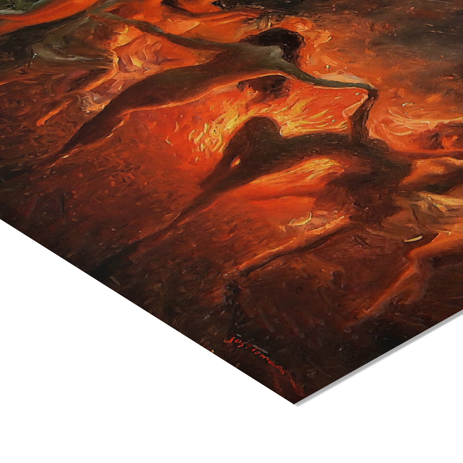 In Nymphs Dancing to Pan’s Flute, Joseph Tomanek invites the viewer into a symbolic vision of unrestrained nature and ancient ritual. The painting is not merely a depiction of myth, but a meditation on the primal forces that exist beyond the boundaries of society. The nymphs, embodiments of natural beauty and freedom, dance in abandon around a fire that symbolizes transformation and desire. At the edge of the scene, Pan plays his flute—an instrument tied to instinct and fertility—guiding the ritual with an unseen but deeply felt rhythm. The interplay of shadow and firelight heightens the painting’s dreamlike atmosphere, turning the moment into an expression of ecstatic communion between the human form, the natural world, and the divine.