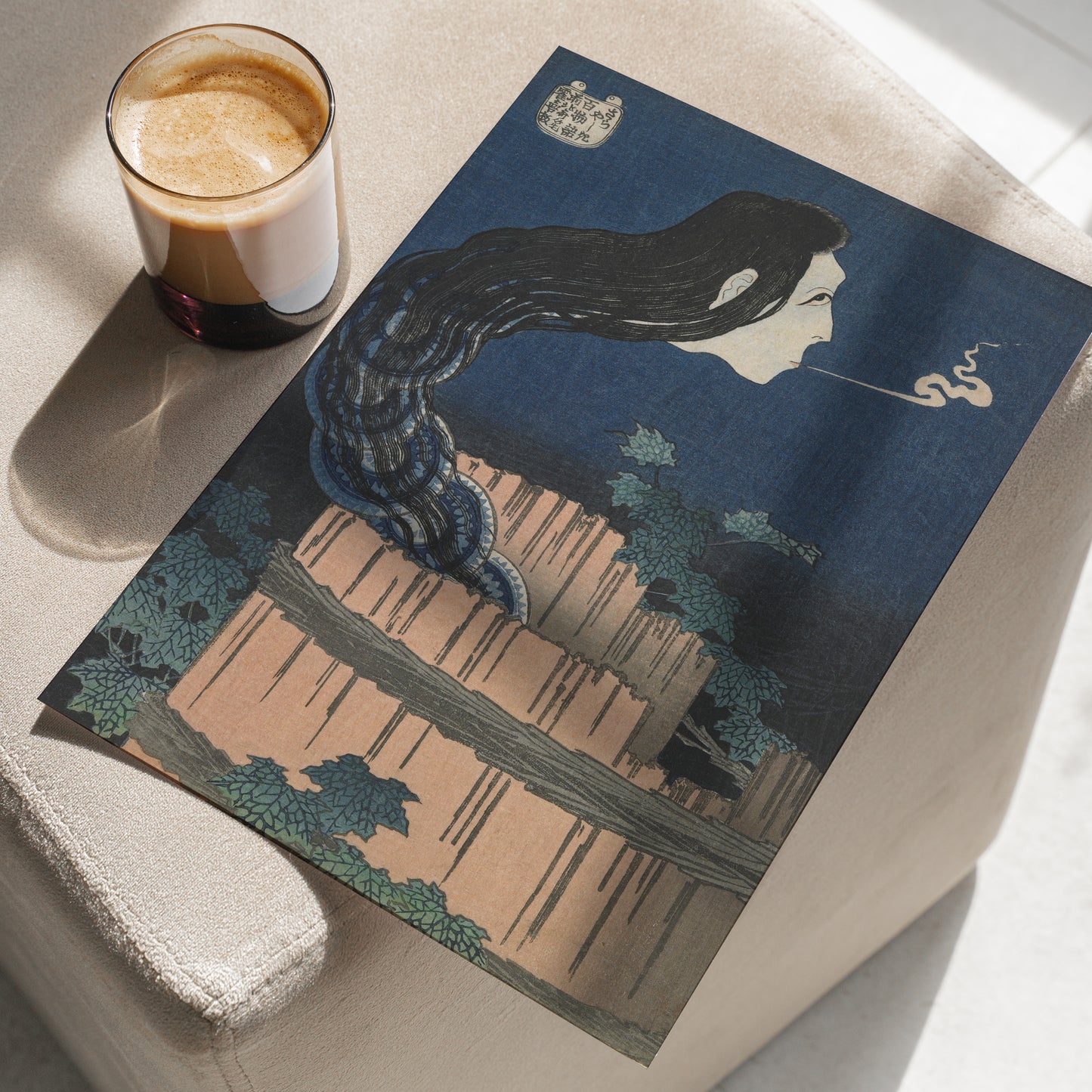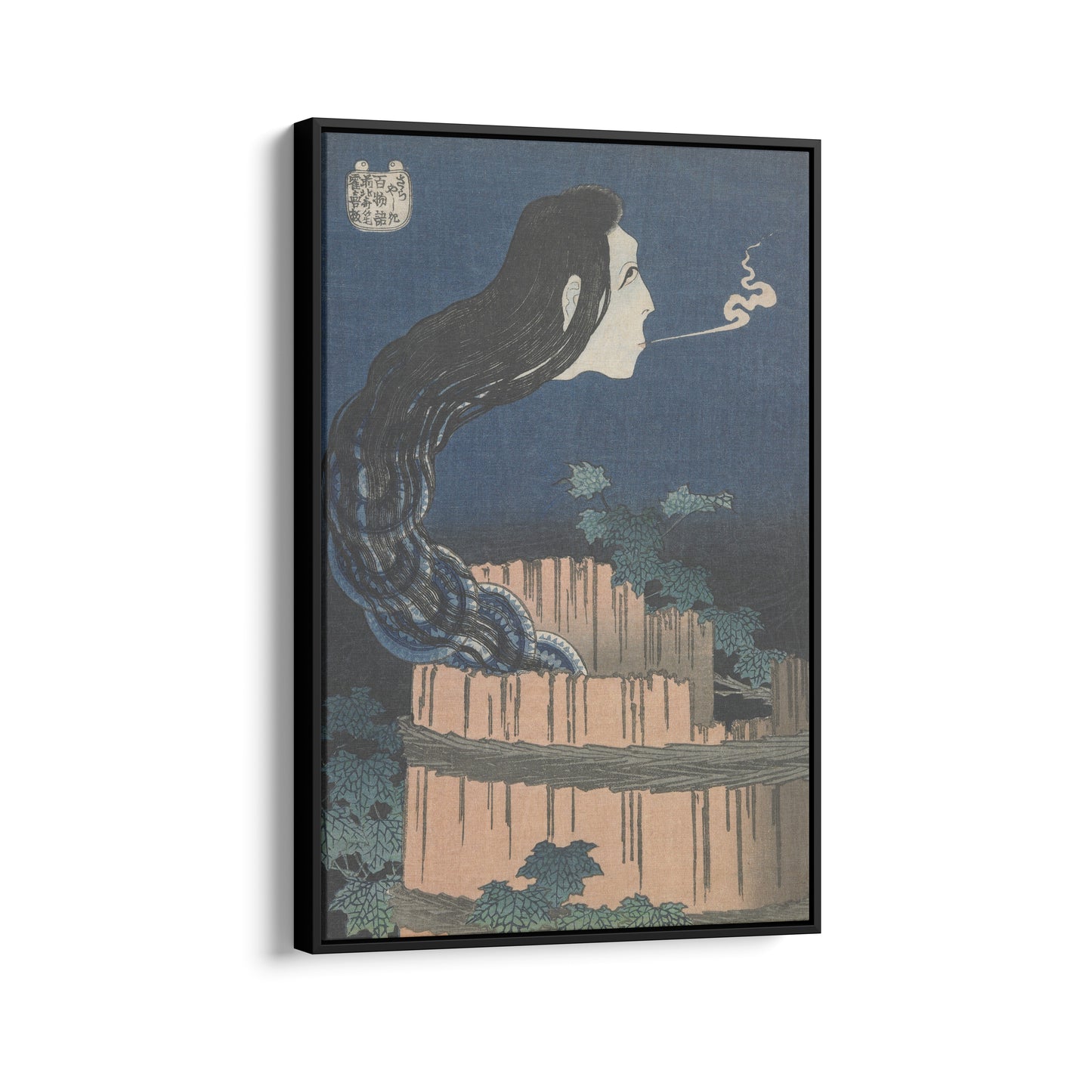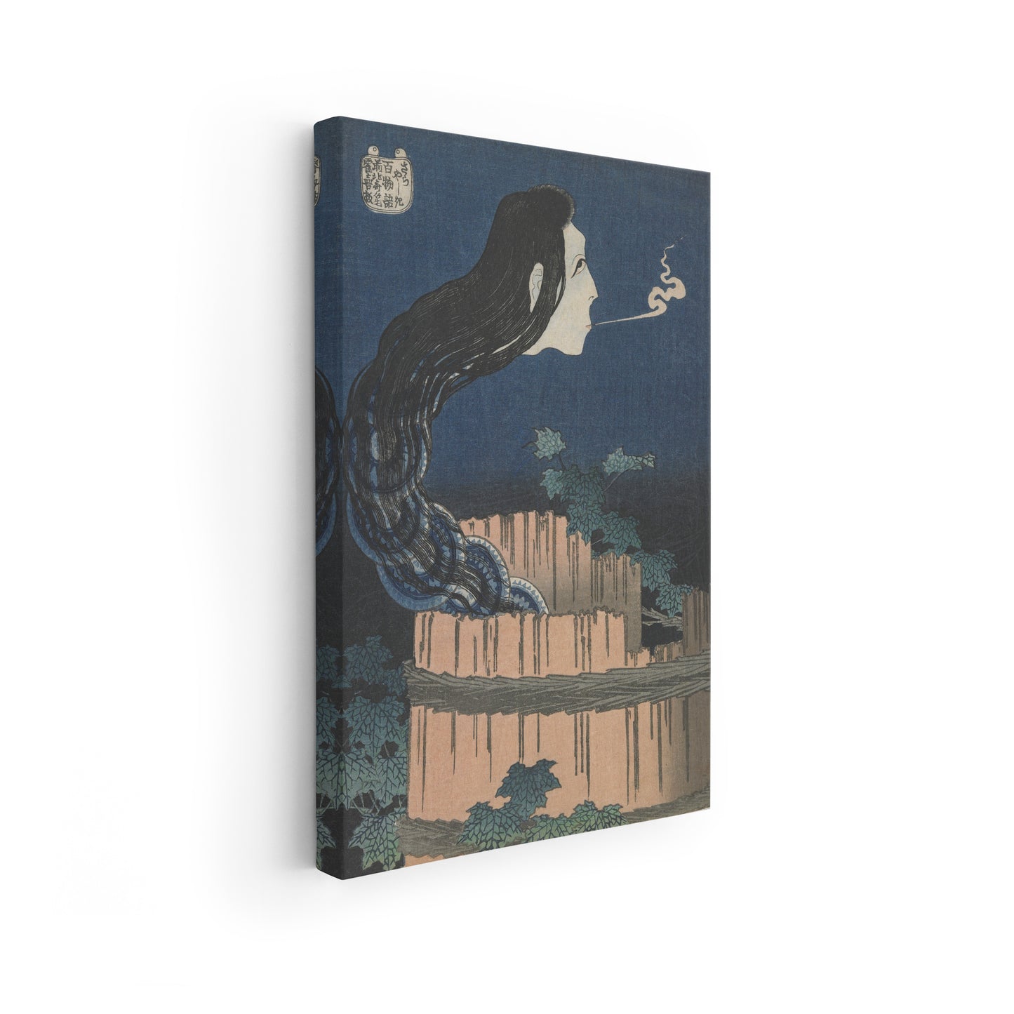 "One Hundred Ghost Tales: Sarayashiki," created by Katsushika Hokusai in 1831-1832, is a compelling woodblock print that depicts the chilling legend of Okiku, a maid who was wrongfully accused of breaking a precious plate. Hokusai masterfully captures the eerie moment when Okiku’s spirit emerges from a well, her ghostly figure rendered in delicate, flowing lines that contrast with the dark, ominous background. The expression of sorrow and vengeance on her face, combined with the detailed, atmospheric setting, evokes a powerful sense of supernatural terror. This print is part of Hokusai's series exploring ghost stories and is a striking example of his ability to blend narrative depth with haunting visual imagery.