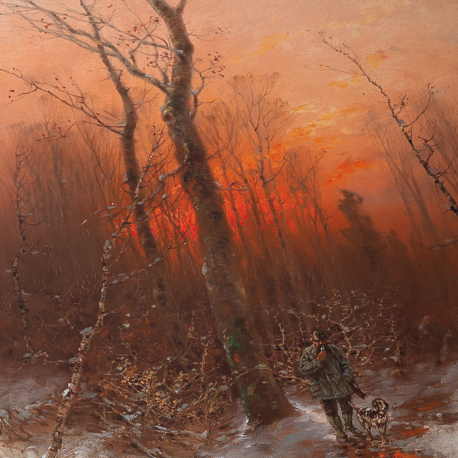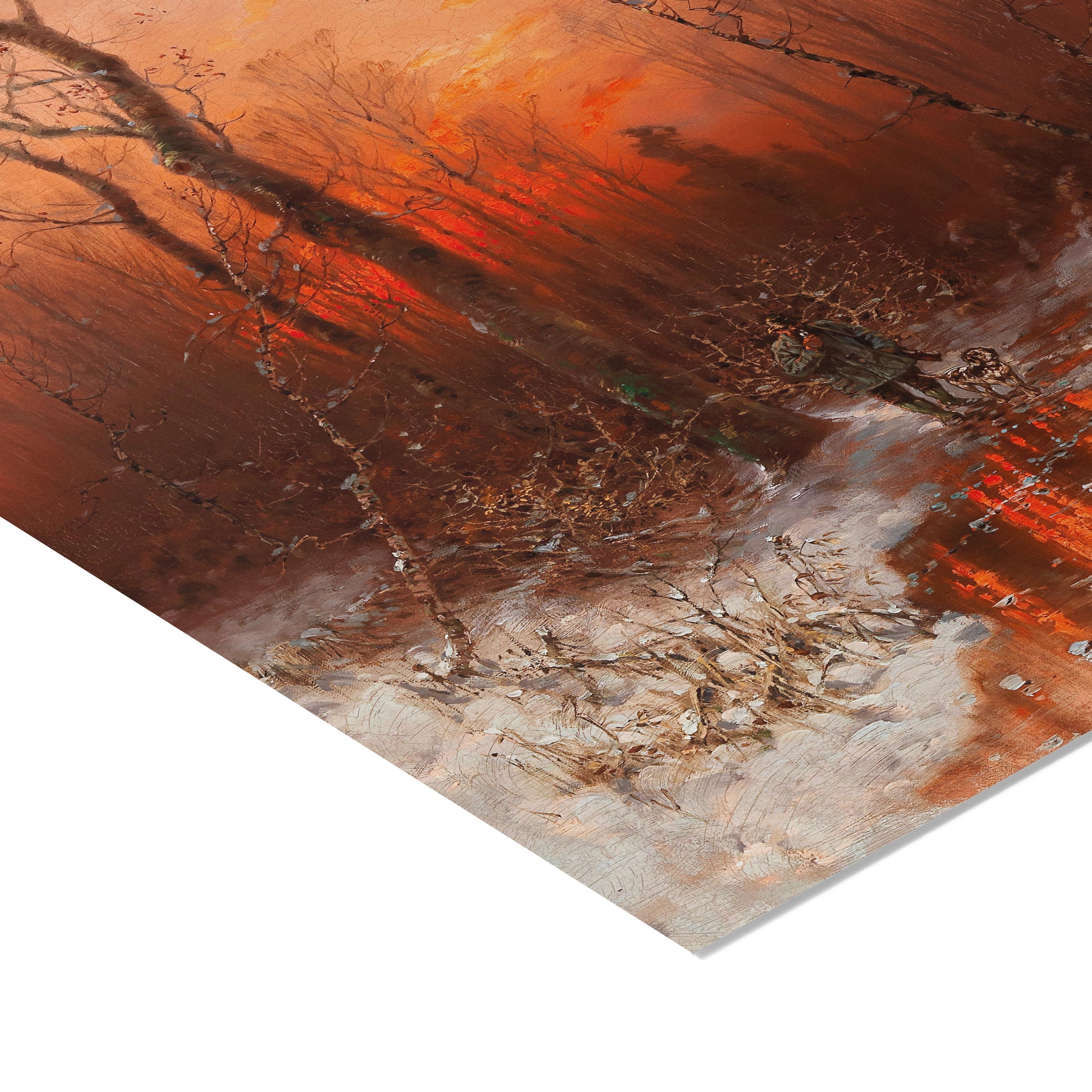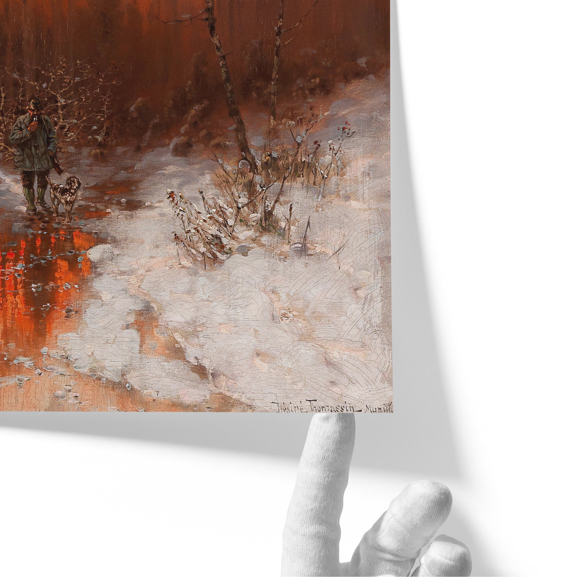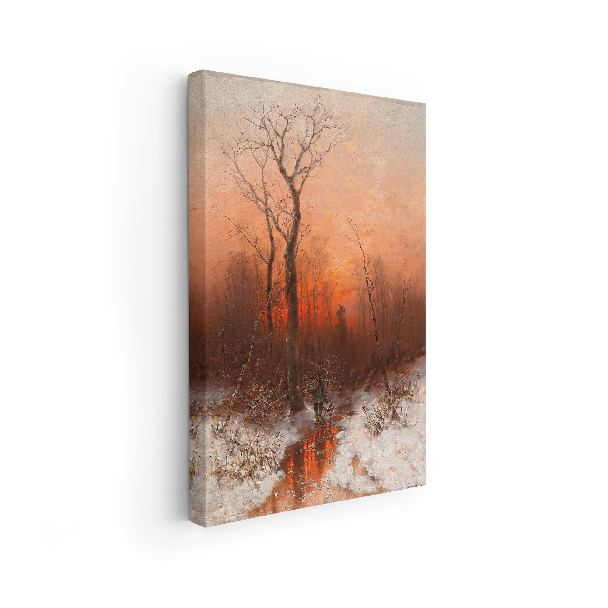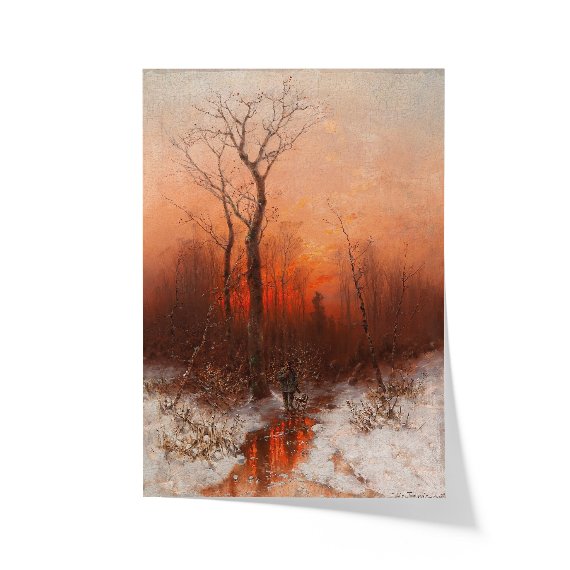 Returning Home at Sunset (1894) by Désiré Thomassin is a quietly evocative winter landscape that captures the serene transition between day and night as a solitary figure and his dog make their way home along a snow-covered path under a glowing dusk sky. Through the warm red and orange hues of the sunset contrasted with the cool tones of the snow and water, Thomassin creates a compelling mood of peaceful solitude and reflection, where the stillness of the environment mirrors the introspective journey of the figure returning from the day’s labors. The interplay of light and color not only highlights the natural beauty of the scene but also imbues the composition with a subtle emotional depth, suggesting endurance, quiet resilience, and the universal pull of home at day’s end.