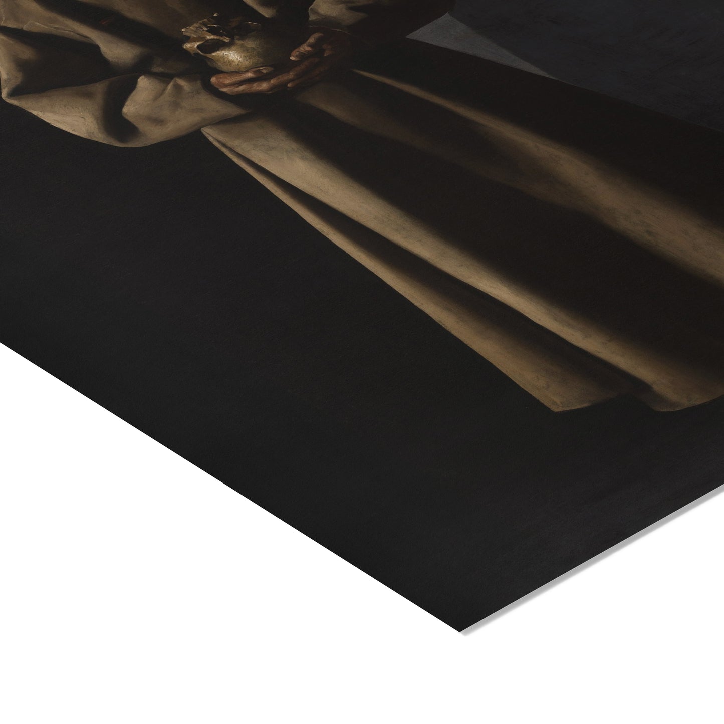 In Saint Francis of Assisi in His Tomb (1630–34), Francisco de Zurbarán presents a hauntingly austere vision of the saint that reflects both spiritual contemplation and the inevitability of death. Cloaked in a simple brown habit, Saint Francis is shown with his face partially shadowed, holding a skull—an unmistakable symbol of memento mori. The dark, undefined background swallows the space around him, isolating the figure in silence and shadow. This composition strips away all worldly distractions, focusing the viewer entirely on the themes of mortality, humility, and divine introspection. Zurbarán’s mastery of chiaroscuro heightens the tension between light and darkness, suggesting the tension between earthly existence and eternal life. Through this minimalistic yet deeply emotional portrayal, the painting becomes not just a depiction of a saint, but a spiritual meditation on the human condition.