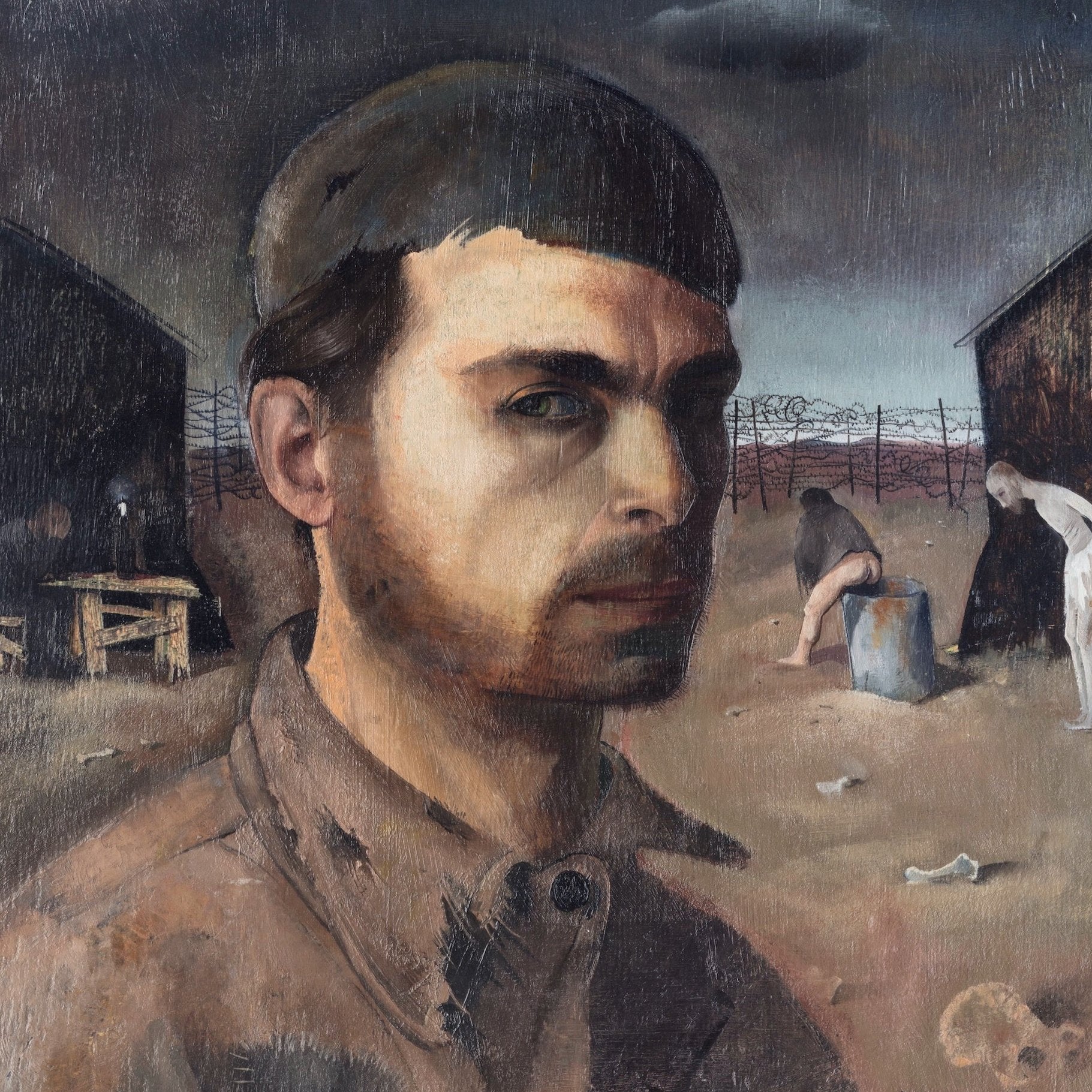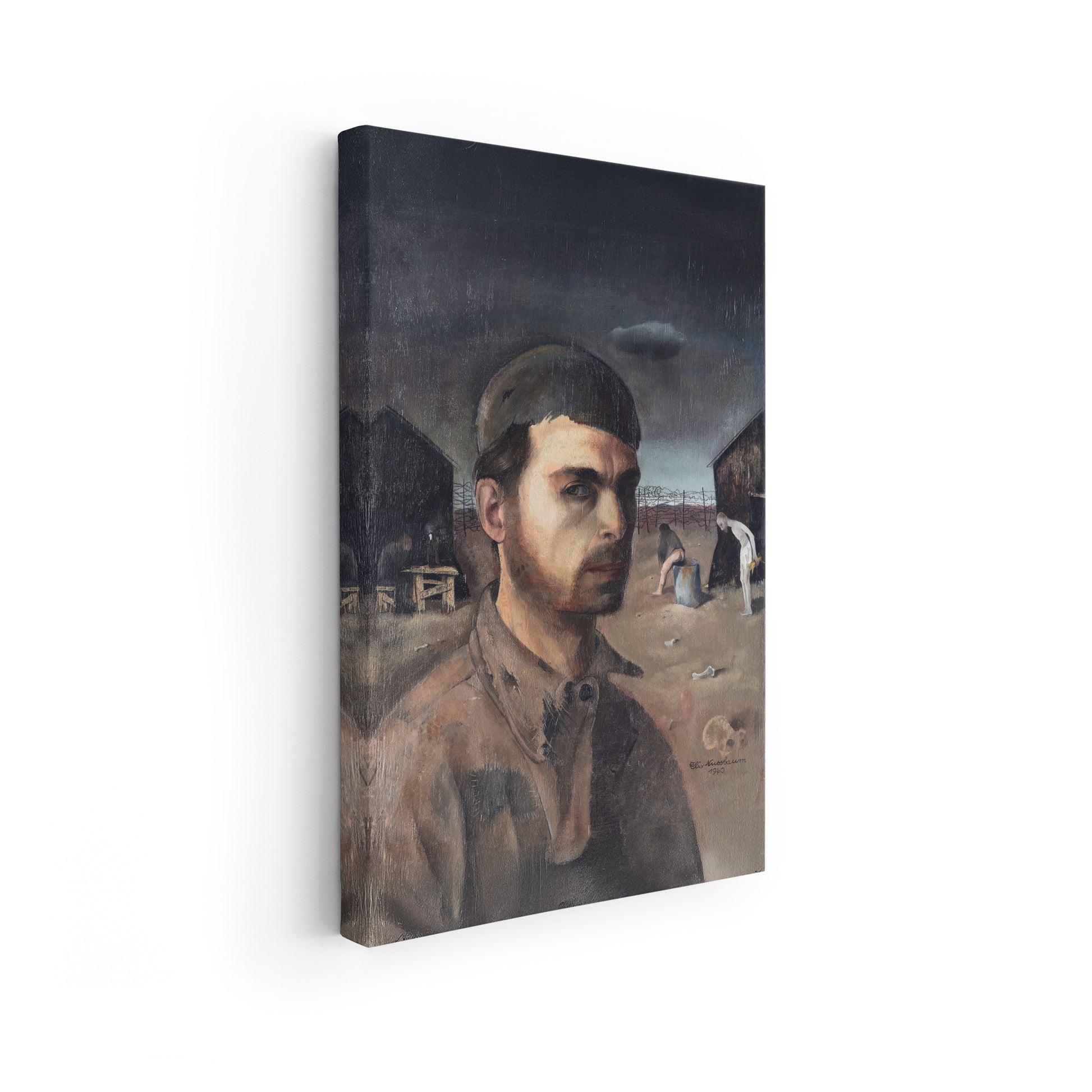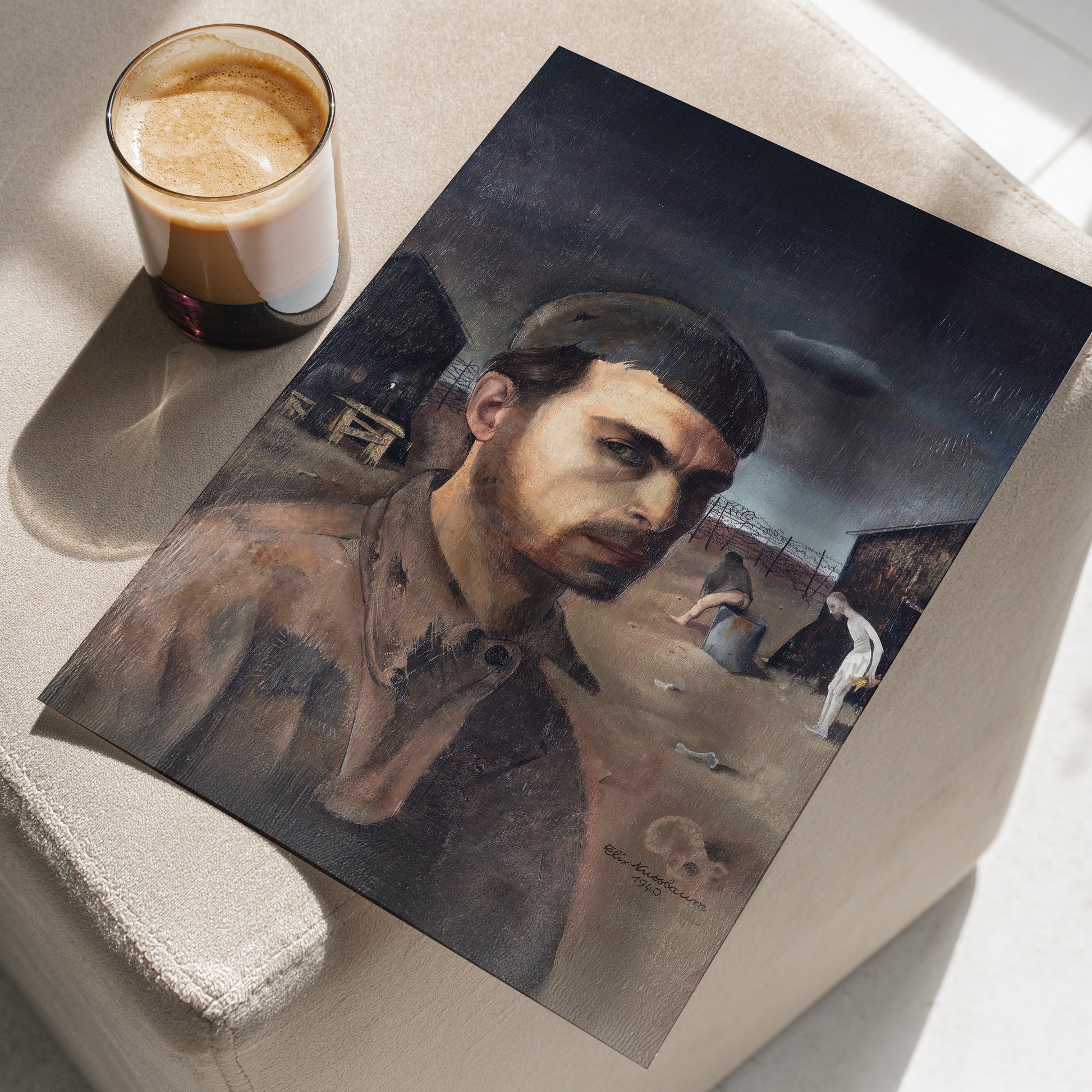 Felix Nussbaum’s "Self-Portrait in the Camp" (1940) is a haunting depiction of the artist's experience as a persecuted Jewish man in Nazi-occupied Europe. In this stark and raw portrayal, Nussbaum presents himself against the bleak backdrop of a concentration camp, with his gaunt face and hollow eyes reflecting the fear, isolation, and despair he felt. The artist's tattered clothing and the barren, oppressive environment around him emphasize the dehumanization and suffering of those imprisoned. His direct gaze, however, confronts the viewer with a quiet defiance, as though bearing witness to the atrocities around him while refusing to be entirely consumed by them. The muted palette of greys and browns mirrors the desolate emotional landscape, and the sharp, angular lines of the composition create a sense of entrapment. Nussbaum’s self-portrait transcends the personal and becomes a powerful symbol of resilience in the face of overwhelming oppression.