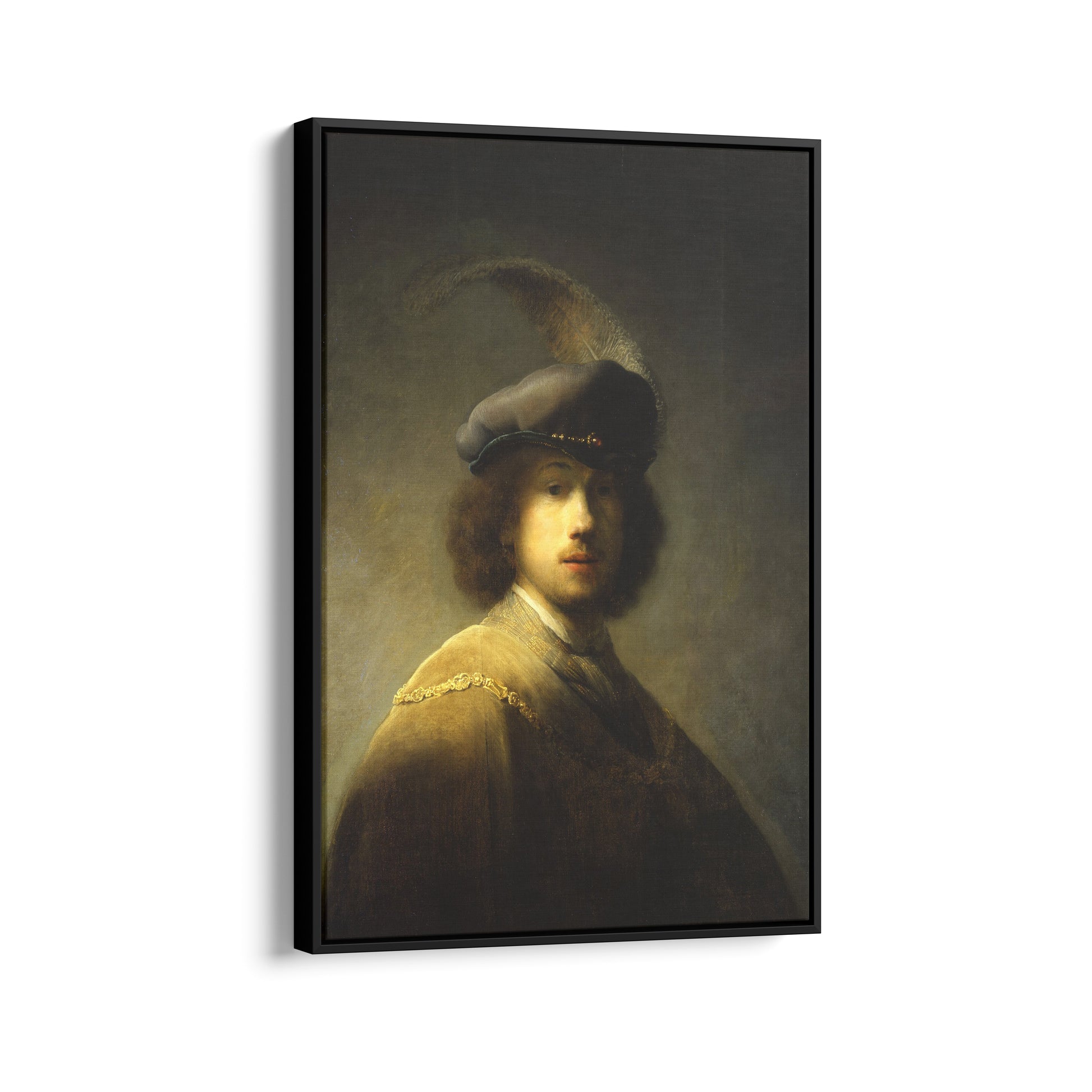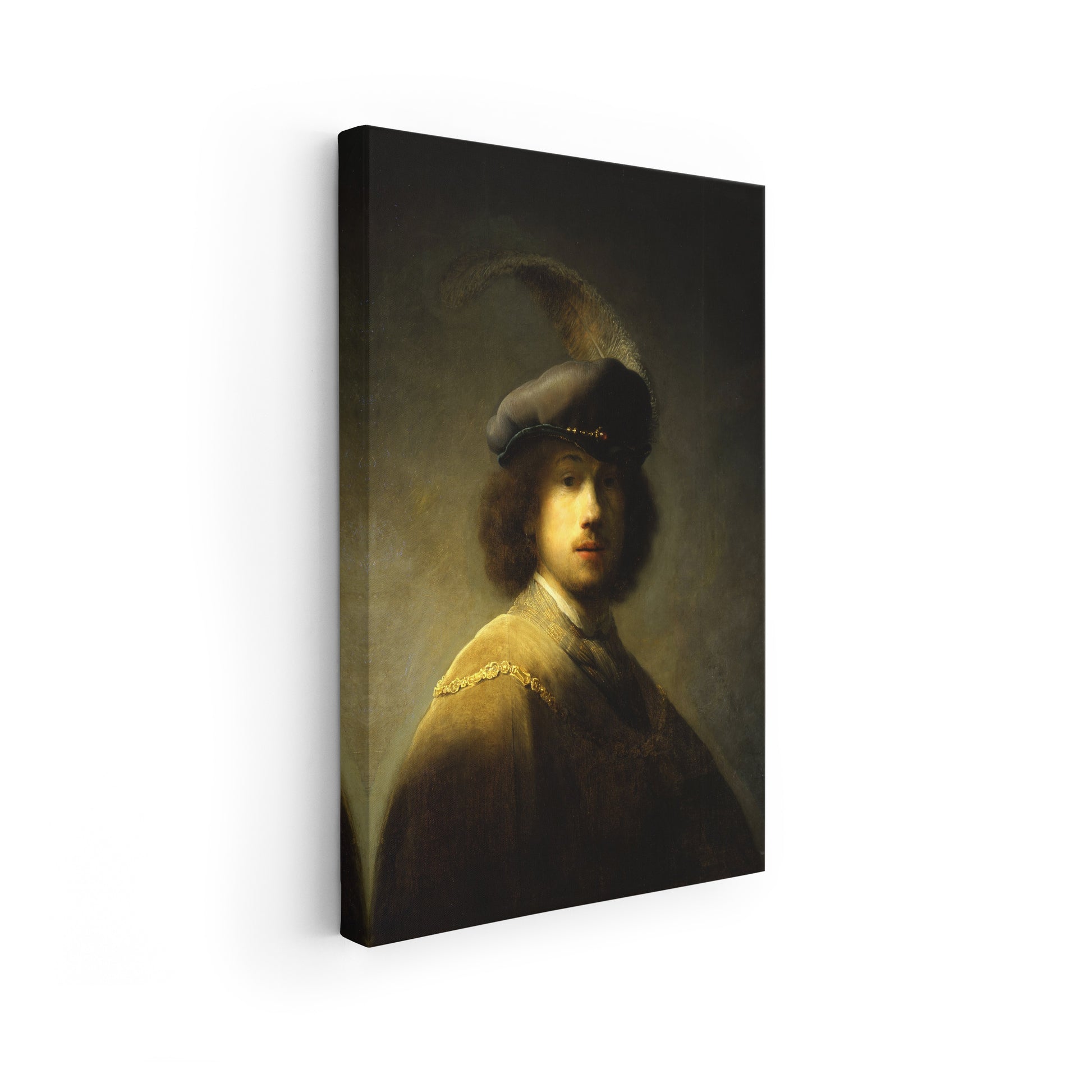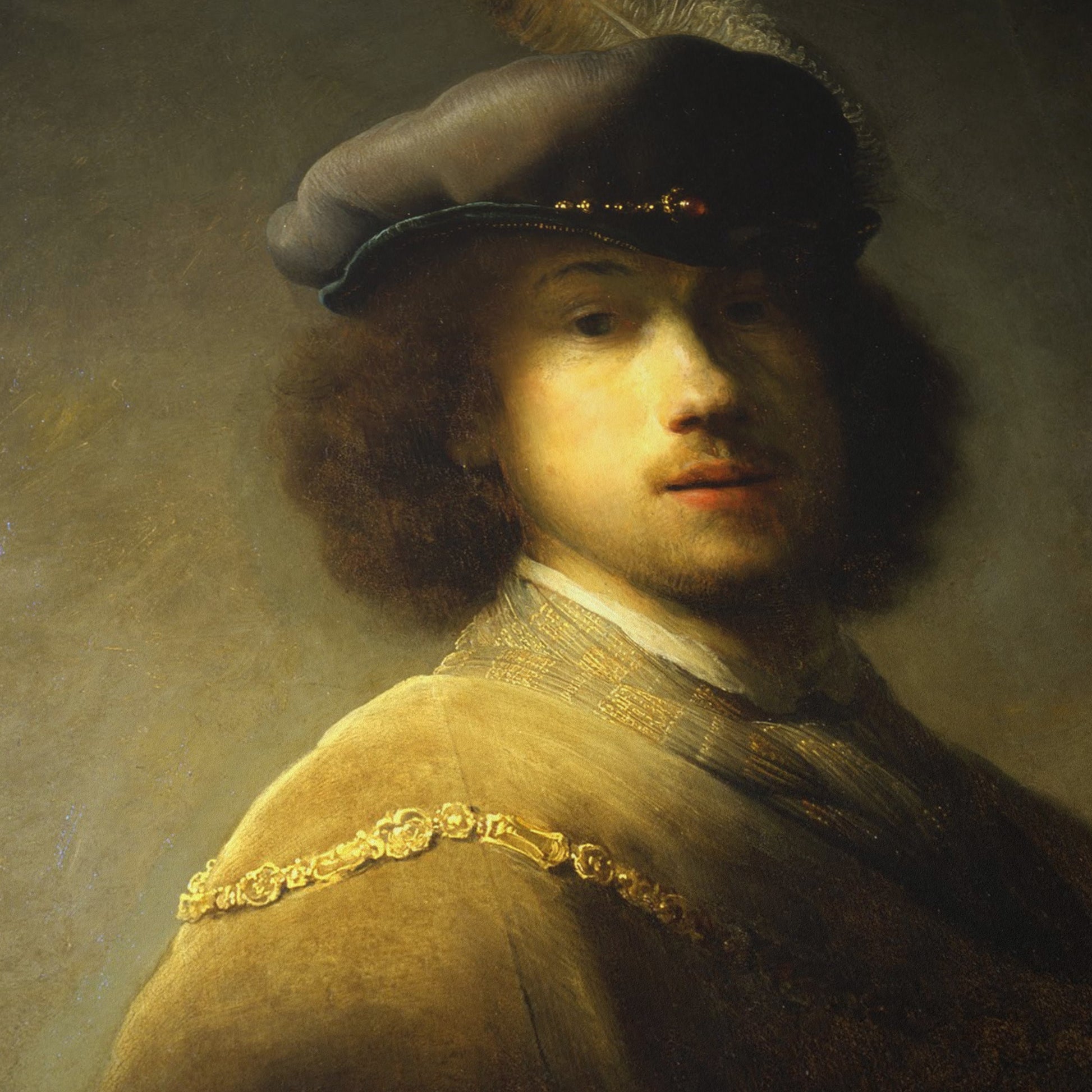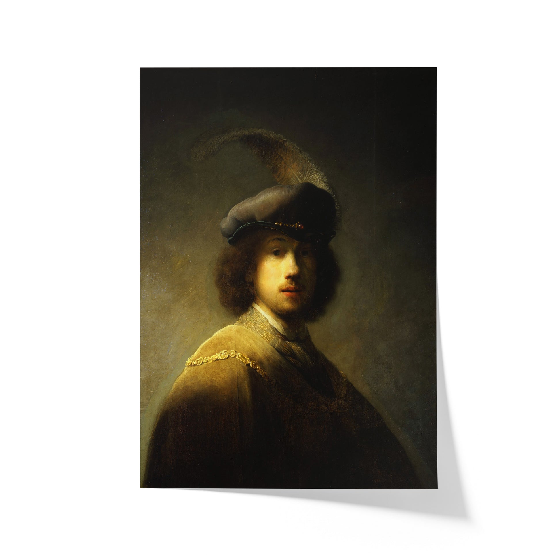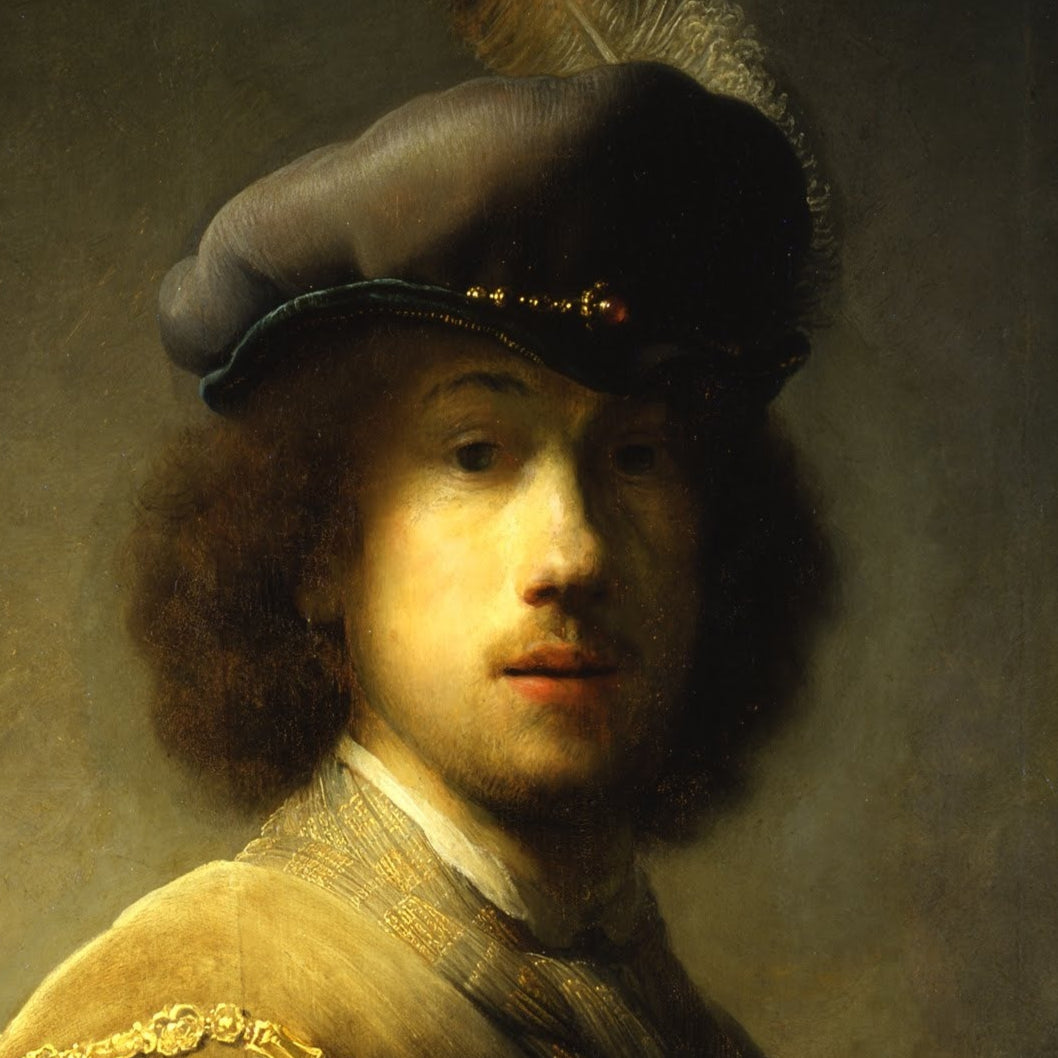 In this early work, Rembrandt portrays himself not as a humble student, but as a figure of flair and theatricality. Donning a lavish plumed beret and a costume reminiscent of historical or aristocratic garb, he adopts the persona of a dashing cavalier. The light grazes his cheek and curls, casting much of his face in partial shadow—creating a sense of mystery and depth that would become a hallmark of his mature style.