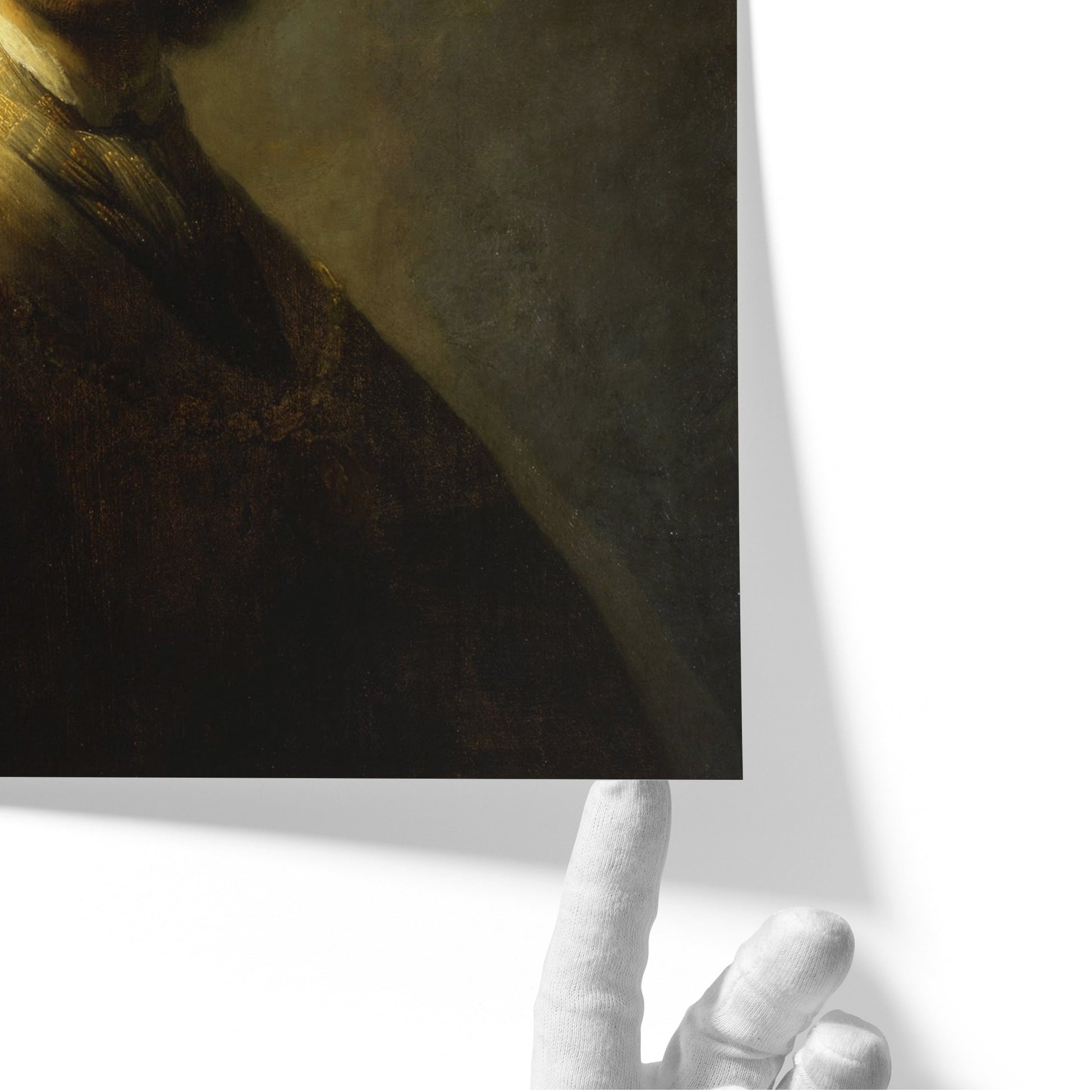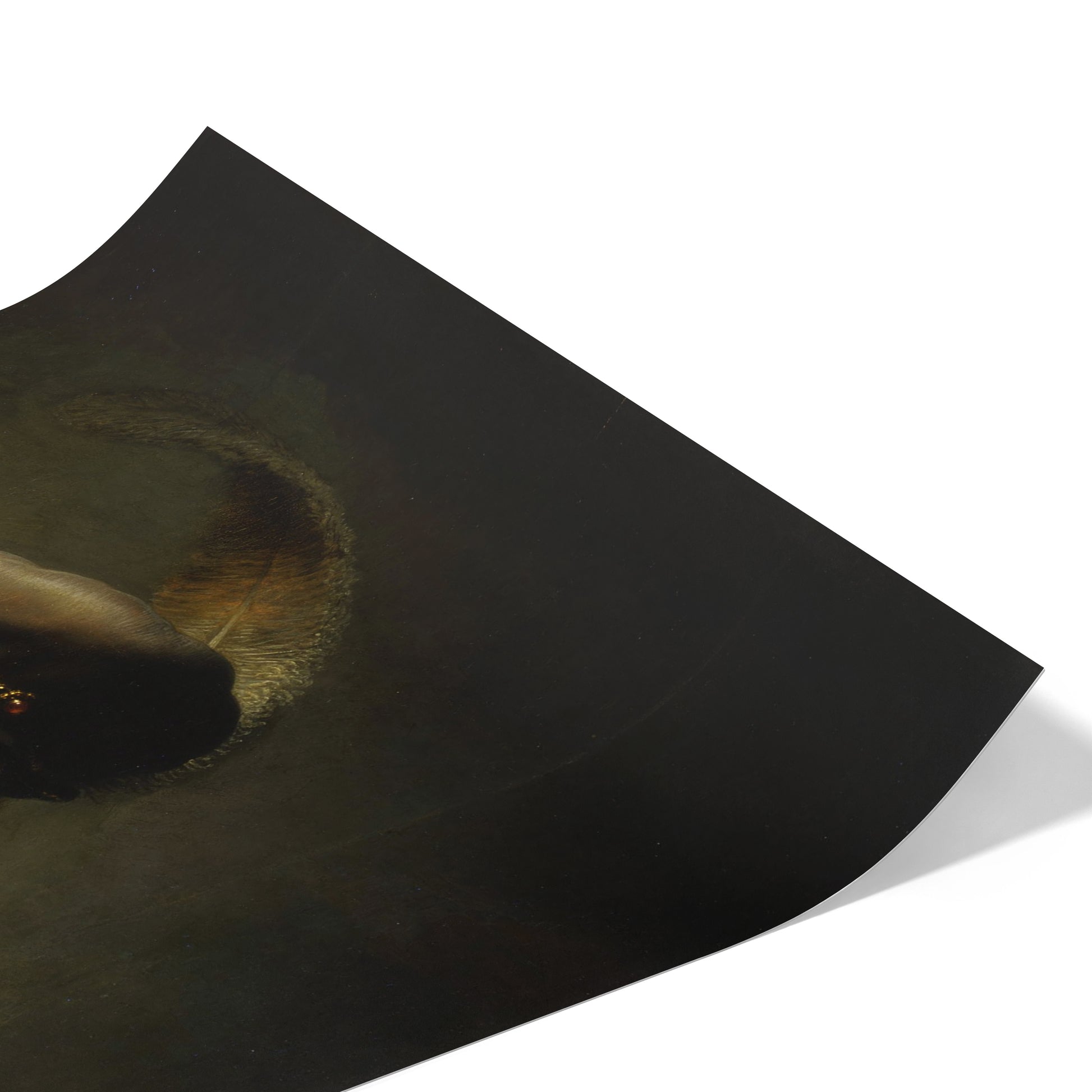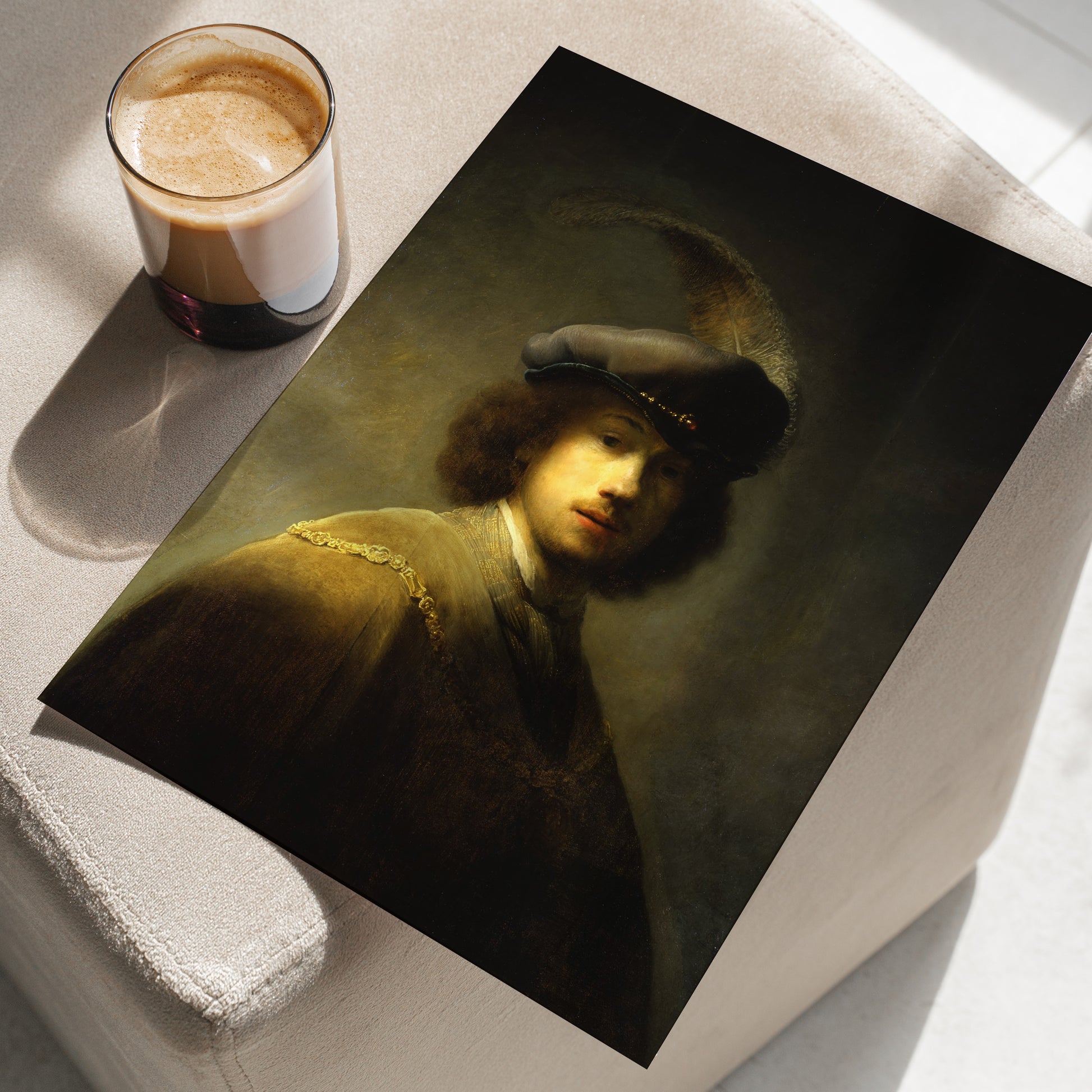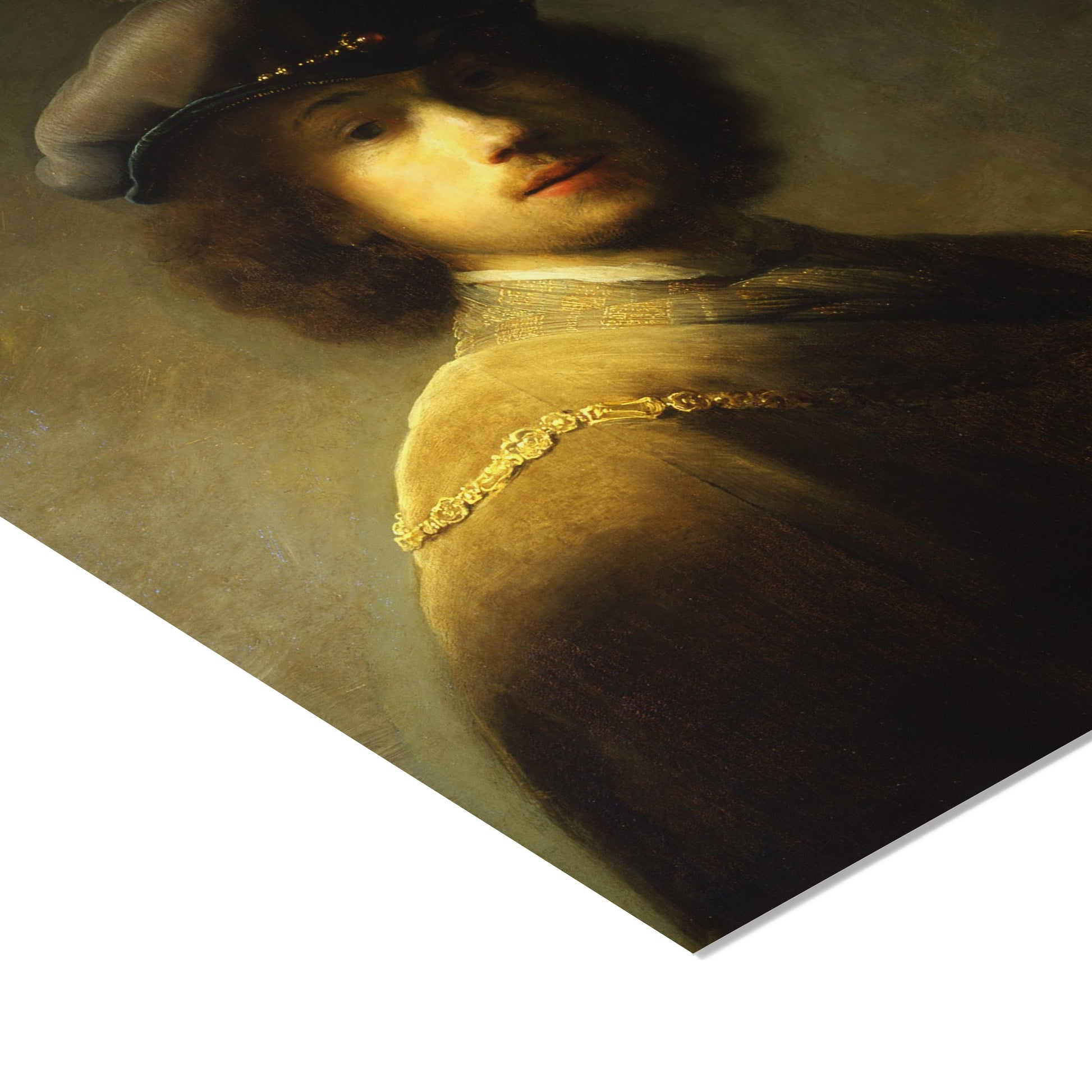 In this early work, Rembrandt portrays himself not as a humble student, but as a figure of flair and theatricality. Donning a lavish plumed beret and a costume reminiscent of historical or aristocratic garb, he adopts the persona of a dashing cavalier. The light grazes his cheek and curls, casting much of his face in partial shadow—creating a sense of mystery and depth that would become a hallmark of his mature style.