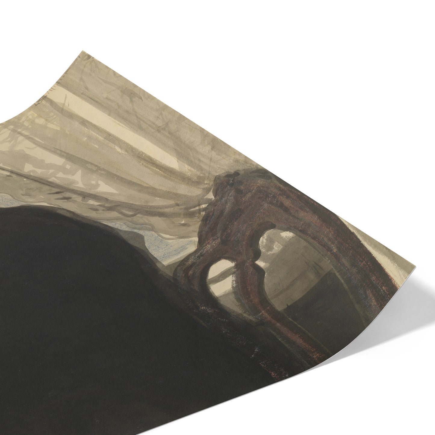 "Silhouette of the Painter" (1907) by Léon Spilliaert is a haunting self-portrait that captures the Belgian artist’s fascination with shadow, solitude, and introspection. The painting features the silhouette of Spilliaert himself, standing before a large, empty canvas in a dimly lit room. The figure’s form is starkly outlined against a minimal, almost oppressive background, evoking a sense of isolation and existential contemplation. Spilliaert’s use of dark tones and sharp contrasts creates an atmosphere of introspection, emphasizing the internal struggles of the artist. The work reflects Spilliaert’s preoccupation with melancholy and the solitary nature of creation, typical of his symbolist style.