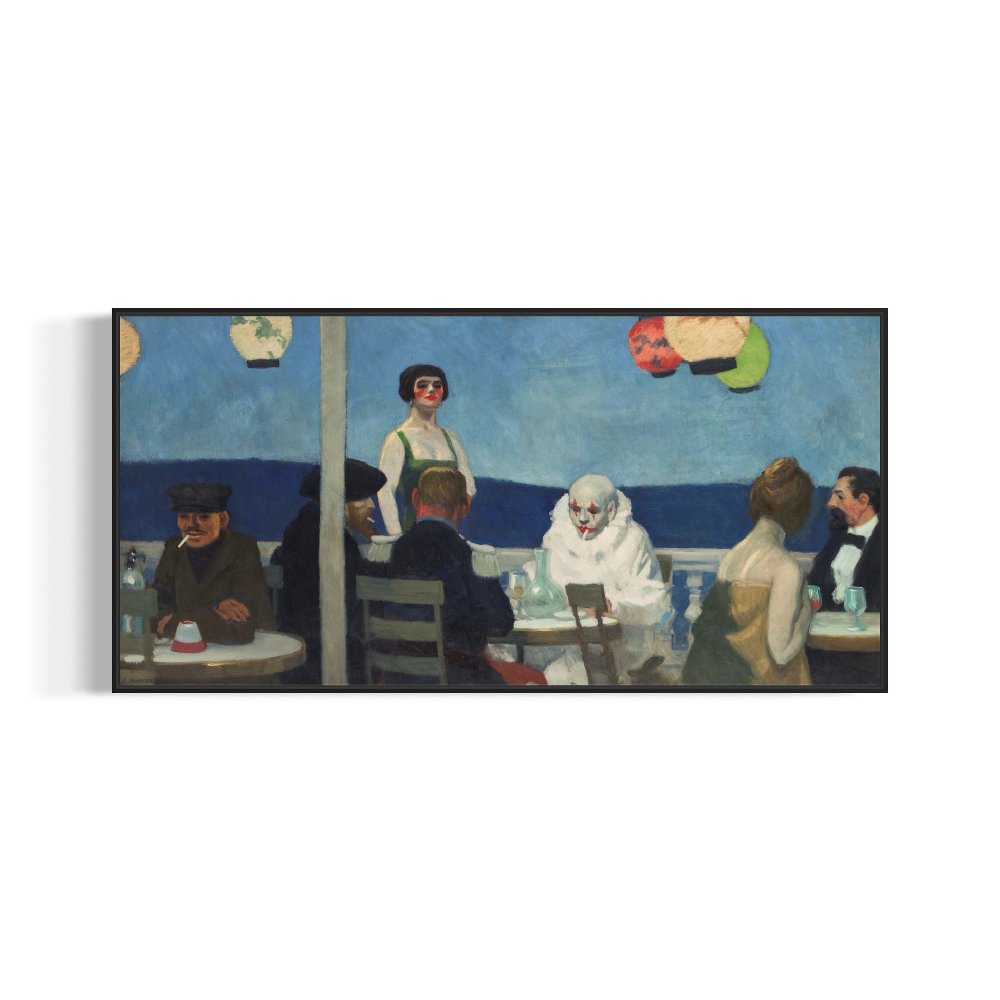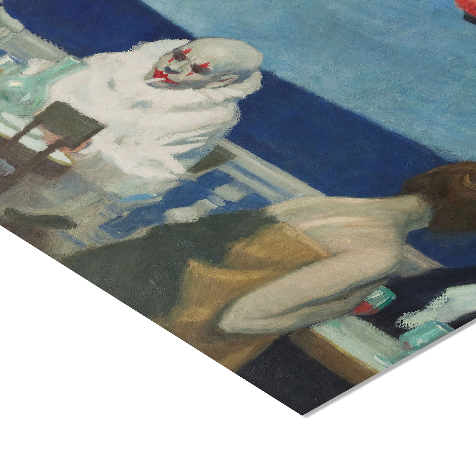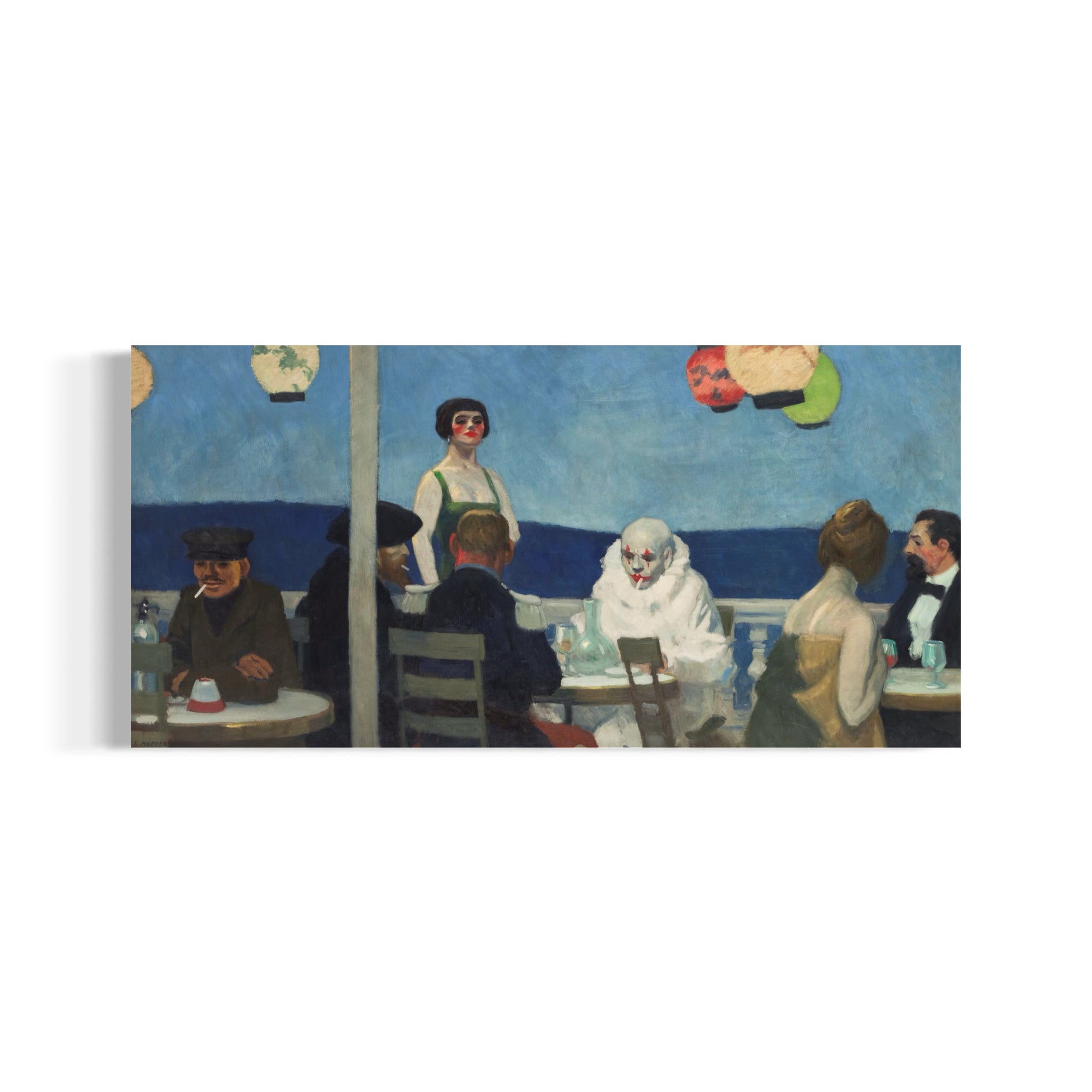 "Soir Bleu" painted by Edward Hopper in 1914, depicts a melancholic evening scene set in a Parisian café. The painting captures a diverse group of patrons seated around a table, including a clown in full costume, which adds an element of surrealism to the otherwise realistic depiction. Hopper's use of subdued colors and dramatic lighting creates a somber mood, highlighting themes of isolation and existential ennui. The detailed expressions and postures of the figures convey a sense of detachment and introspection, emphasizing the loneliness that can exist even in social settings. This early work reflects Hopper's burgeoning interest in portraying the complexities of human emotions and urban life.