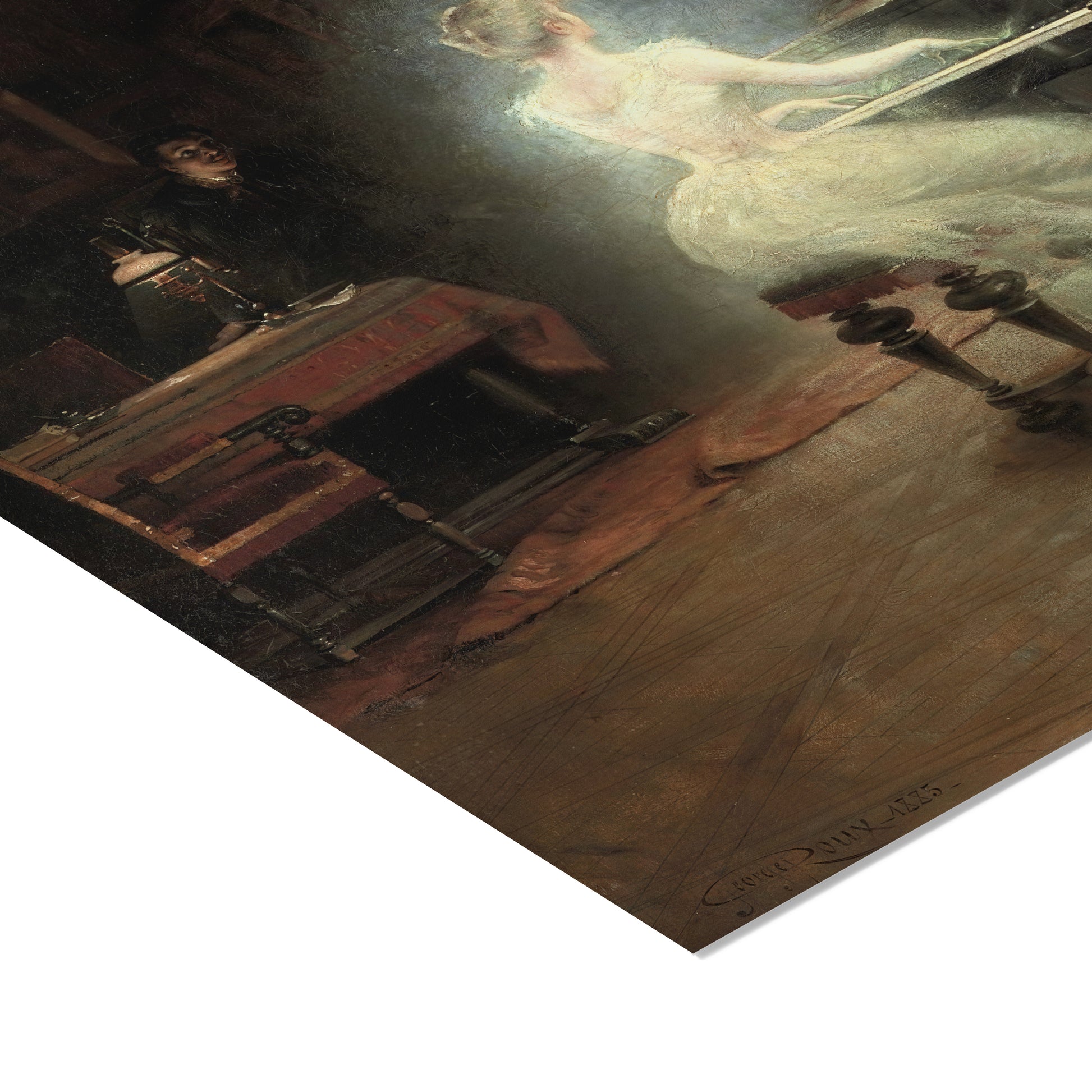 Georges Roux’s Spirit (1885) is a poignant meditation on memory and the supernatural, capturing the emotional weight of loss through a delicate visual language. The painting depicts a ghostly woman glowing softly at a piano, observed by a silent man enveloped in shadow—suggesting a moment suspended between reality and recollection. Roux uses contrast between light and darkness to emphasize the apparition’s ethereal presence, blurring her edges to evoke impermanence. Rooted in Symbolist ideals, the work prioritizes emotional resonance over realism, inviting viewers to interpret the scene as a visual expression of grief, longing, or unresolved love. Through restrained composition and atmosphere, Spirit speaks to the enduring presence of the past in the lives of the living.
