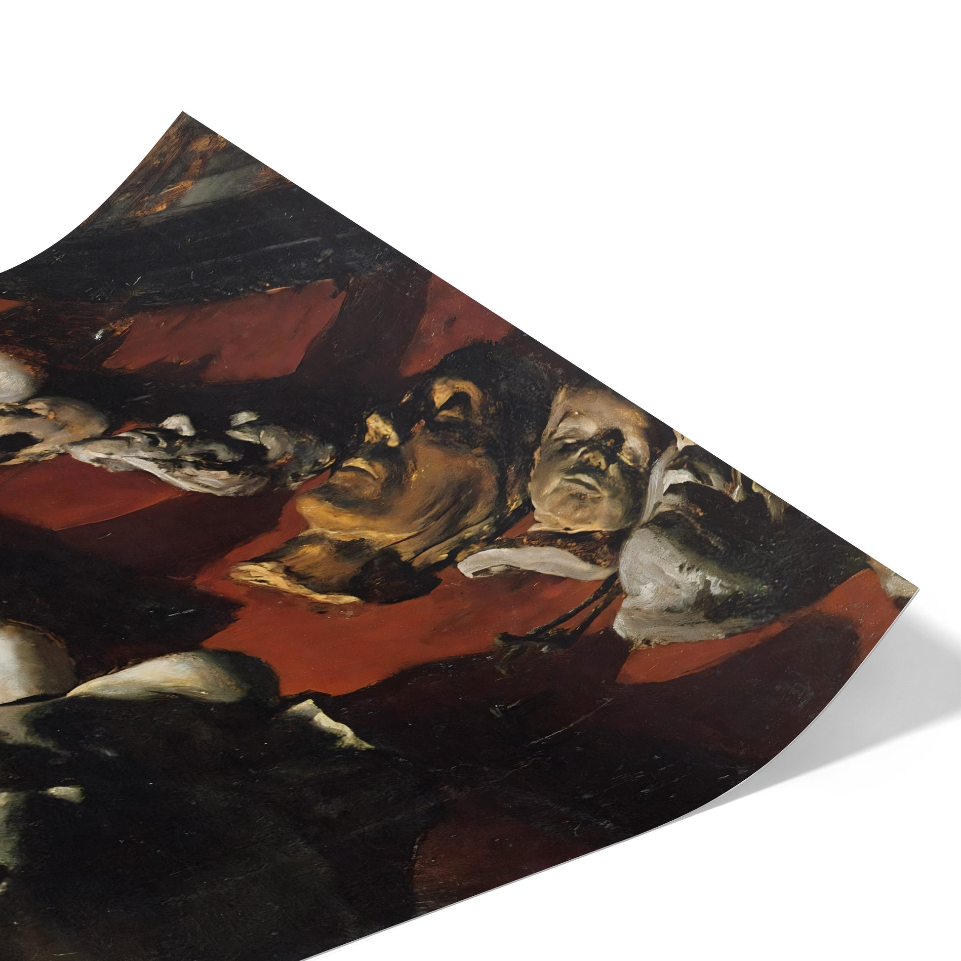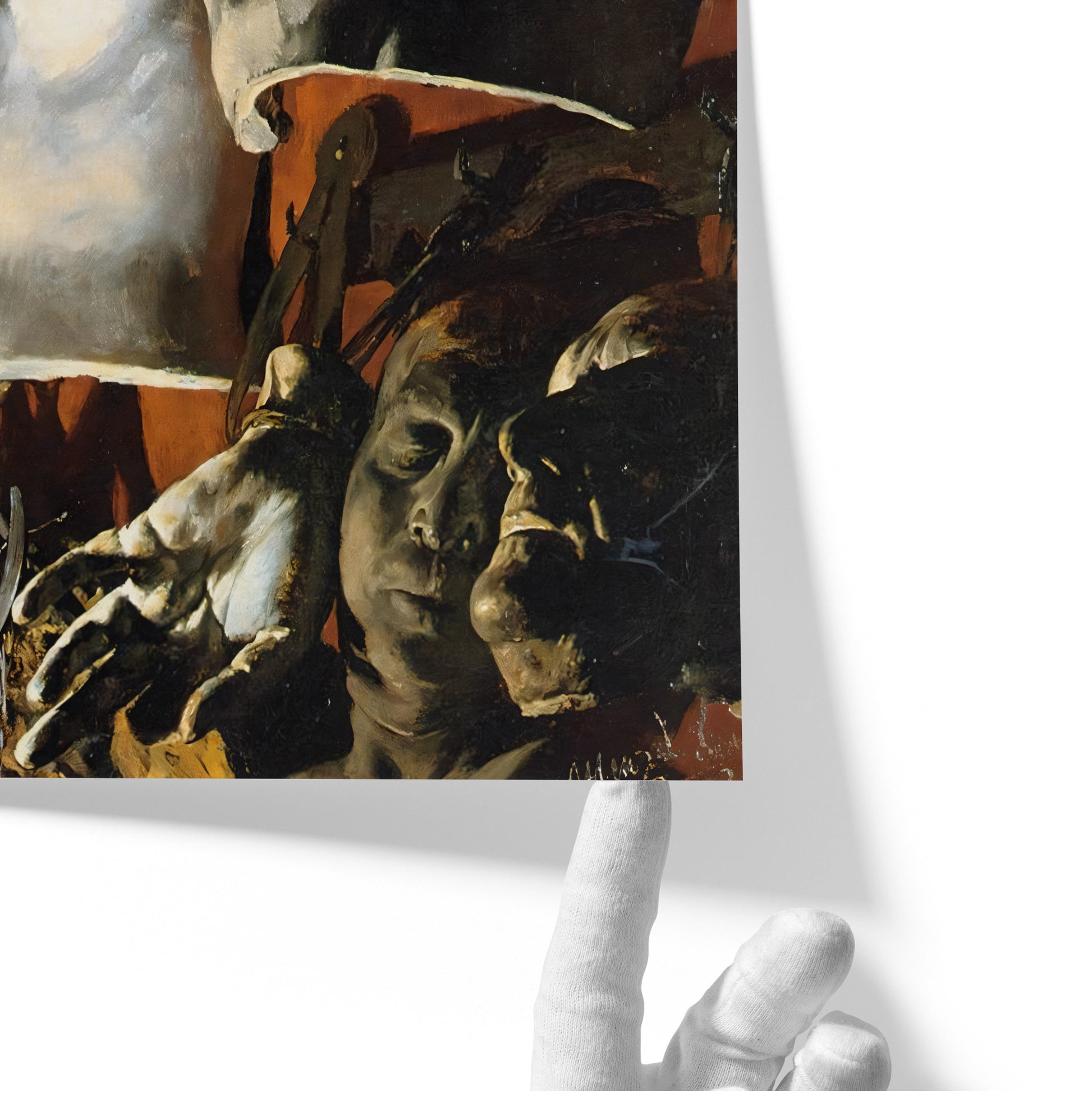 Adolph Menzel’s Studio Wall (1872) presents a haunting glimpse into the artist’s workspace, where the wall is crowded not with sketches or paintings but with masks, busts, and dismembered anatomical casts of hands, feet, and limbs. These objects, used as study tools for mastering the human form, are rendered with Menzel’s typical precision, their textures and details captured so vividly that they seem suspended between lifeless plaster and unsettling vitality. The absence of a central figure or narrative gives the work an eerie stillness, turning the studio itself into both a laboratory of artistic inquiry and a theater of silent presences. What might have been a mundane record of practice materials becomes instead a meditation on the uncanny nature of representation, the boundary between art and science, and the disquiet that arises from fragments of humanity displayed without wholeness.