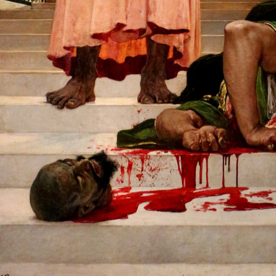 Henri Regnault’s Summary Execution under the Moorish Kings of Granada (1870) is a striking example of 19th-century French Orientalism, combining fascination with exotic settings and a taste for theatrical violence. The canvas shows an executioner calmly cleaning his curved scimitar after a decapitation, while the victim’s body and blood stain the marble steps of an Alhambra-inspired interior. By choosing a low viewpoint, Regnault forces the viewer to look up at the almost life-size figure, giving him an imposing presence. The contrast between the ornate Moorish architecture and the brutal act heightens the sense of shock, while details like the vivid red of the blood against the green of the robes underline his mastery of realism. The painting is not just a display of technical skill but also a reflection of the 19th-century European fascination with an imagined, often violent “Orient,” making it both unsettling and captivating.
