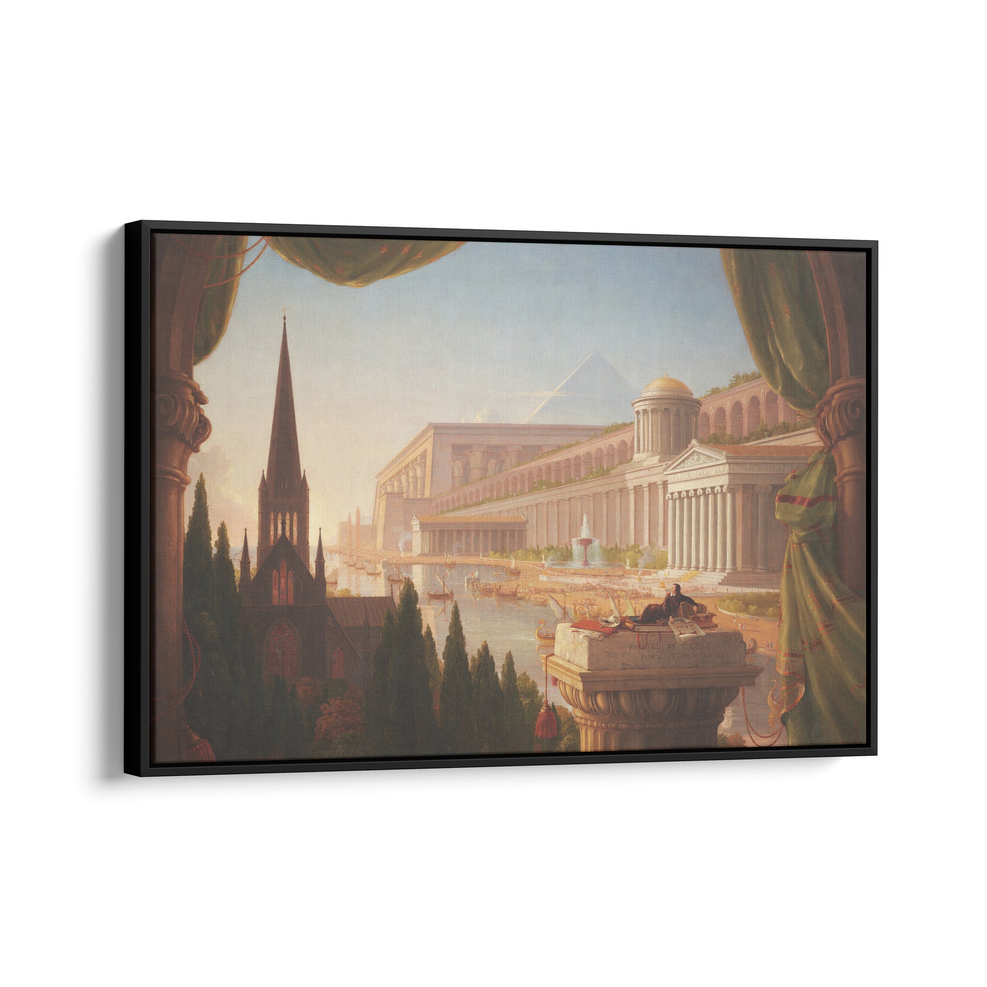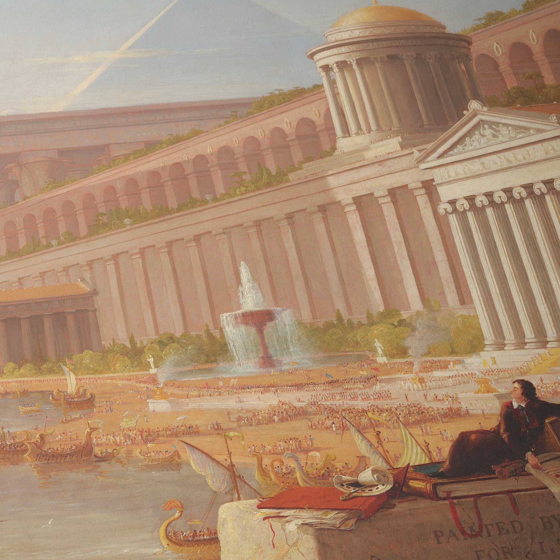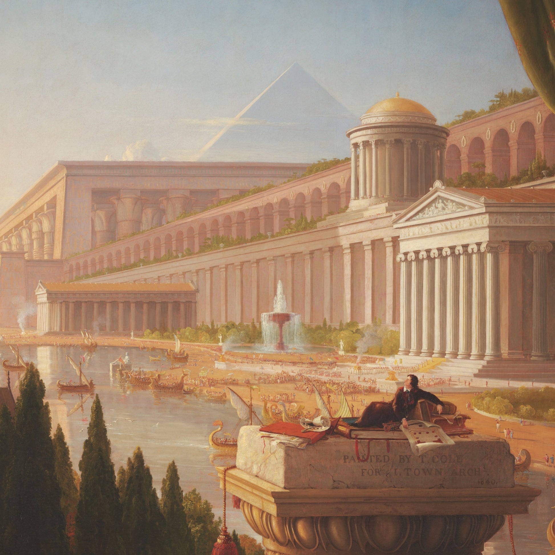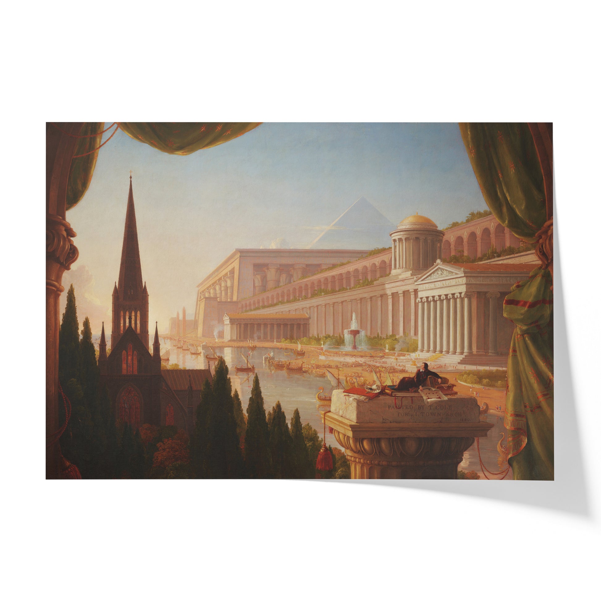Thomas Cole’s The Architect’s Dream (1840) is a sweeping allegory of architectural history, presenting in one dreamlike panorama the achievements of Egypt, Greece, Rome, and the Gothic Middle Ages. By layering these styles into a single imaginative landscape, Cole not only demonstrates his fascination with the evolution of culture but also elevates architecture as a symbol of human creativity and spiritual aspiration. The reclining figure of the architect, lost in contemplation, reminds us that all these monuments are both products of intellect and visions of the imagination, making the painting as much about the act of dreaming as about the history it depicts.