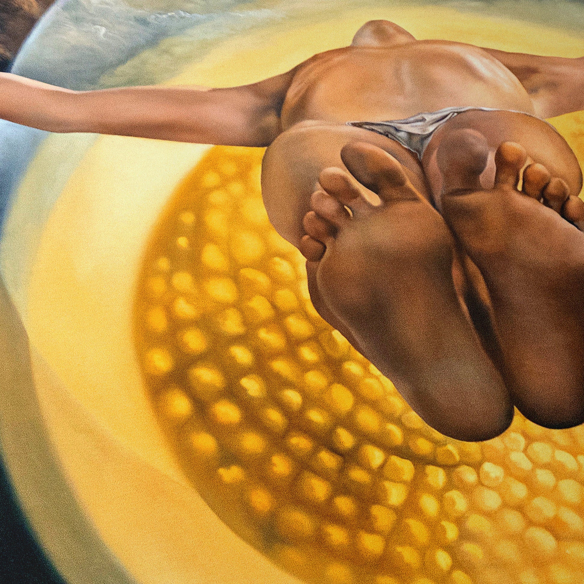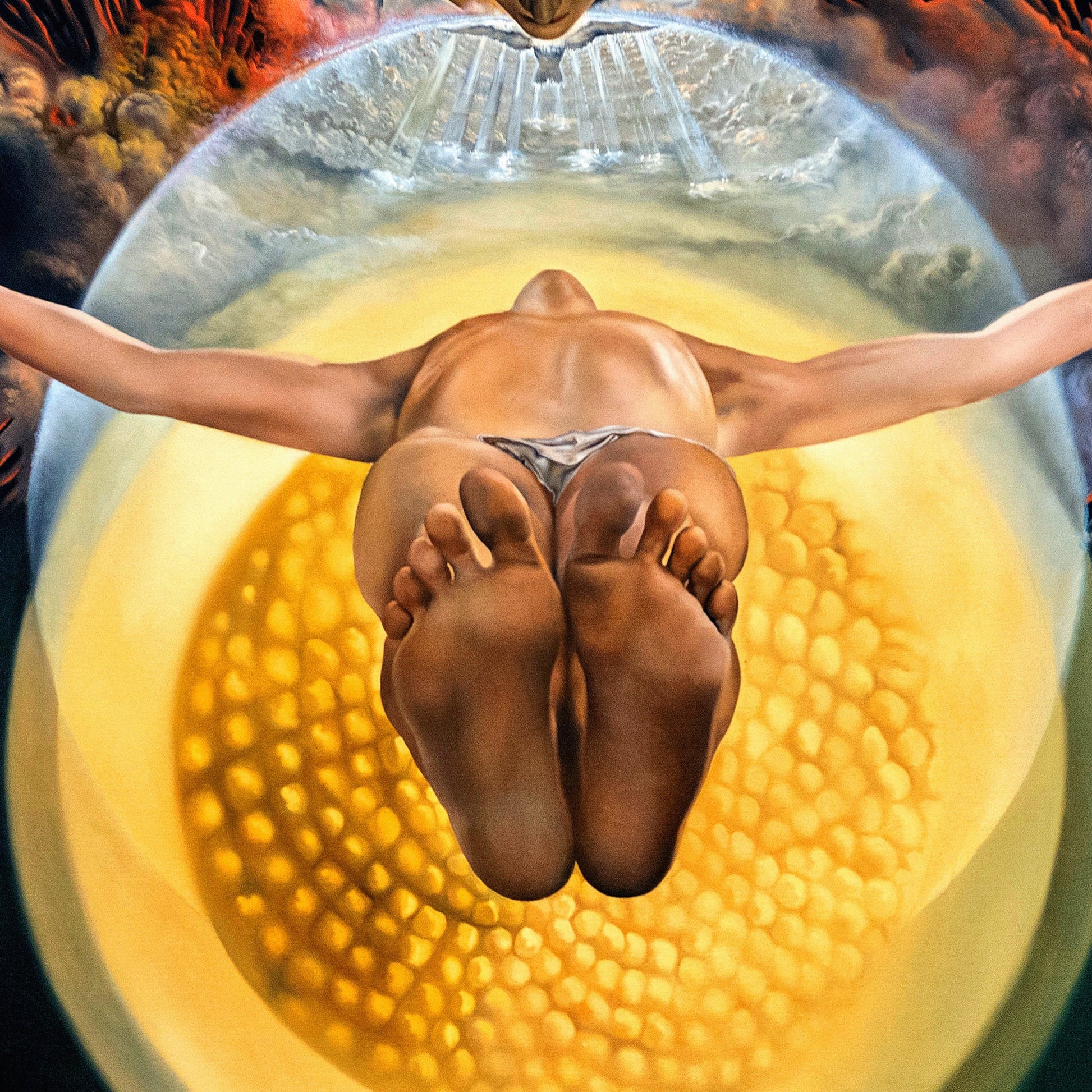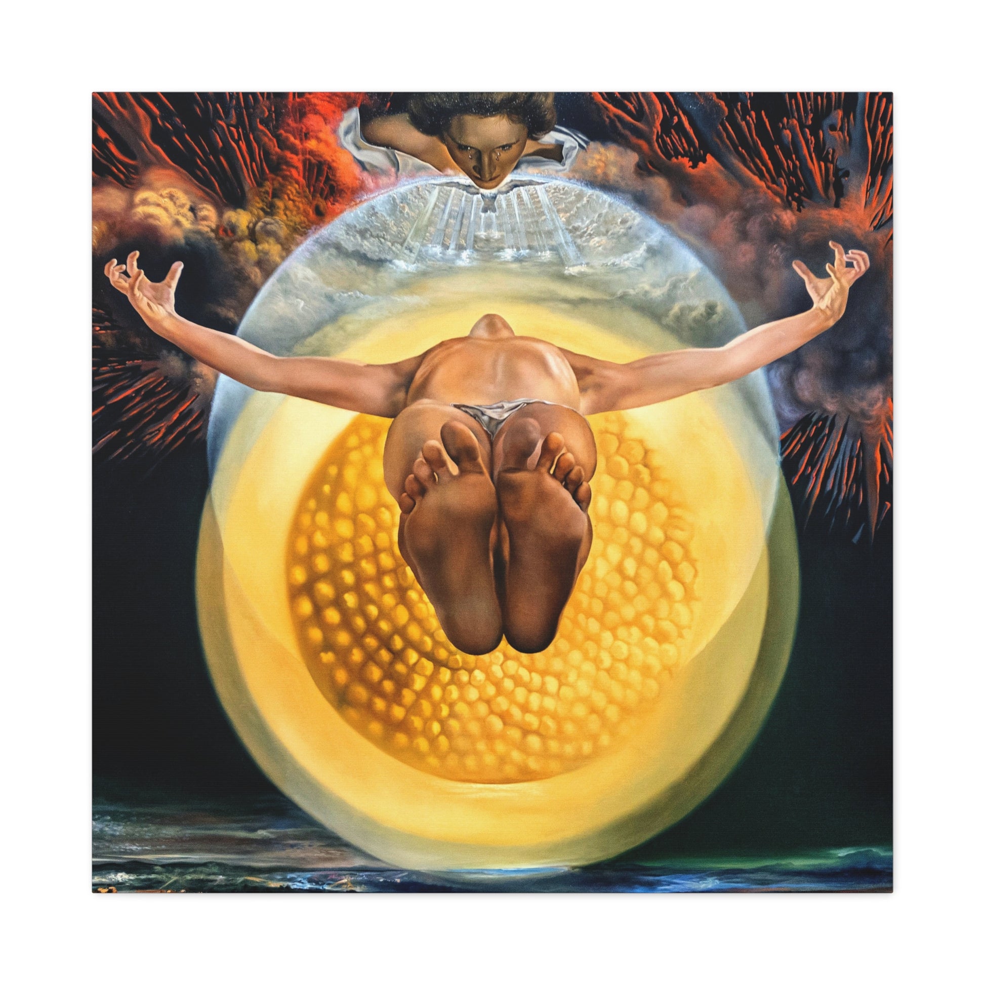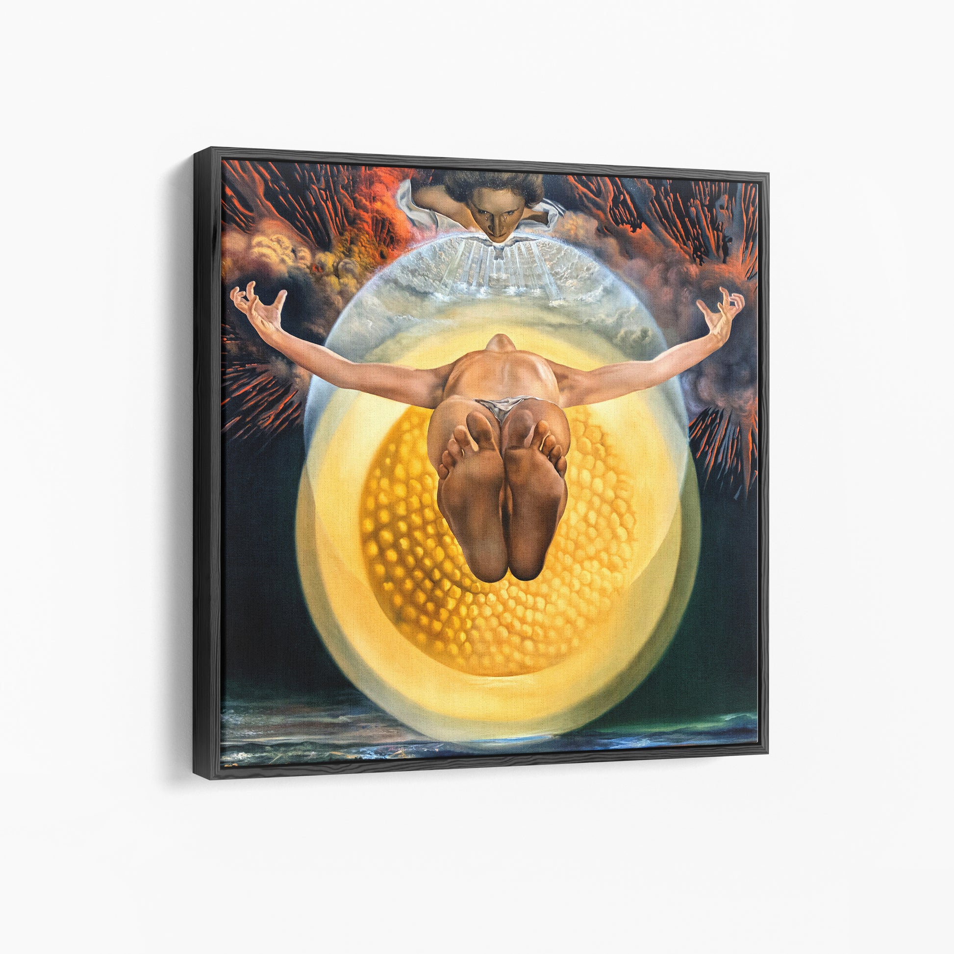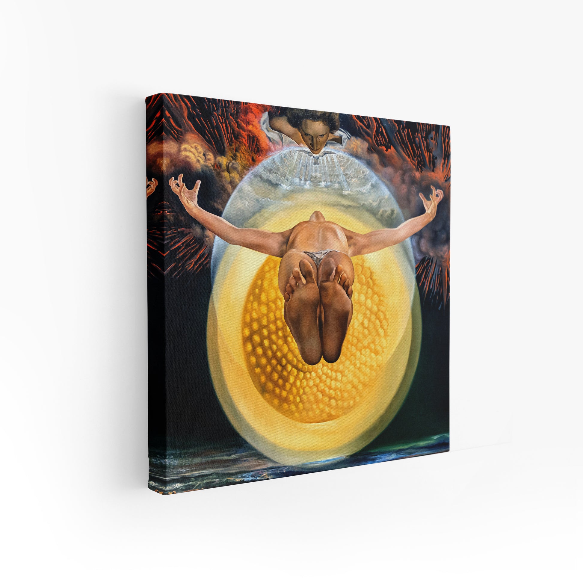 Salvador Dalí's The Ascension of Christ (1958) is a striking depiction of spirituality and transcendence through the lens of surrealism. The painting captures Christ ascending toward a radiant light, viewed from a unique, almost vertiginous perspective as if the viewer is beneath Him. This upward perspective emphasizes divine elevation and cosmic grandeur. Christ's outstretched arms and serene expression evoke themes of surrender and unity with the divine, while the circular patterns and golden hues surrounding Him suggest heavenly glory and eternal harmony. Dalí’s distinctive style shines through in the ethereal, dreamlike quality of the composition, blending religious iconography with scientific influences, such as atomic energy and spiraling forms inspired by DNA. The interplay of realism and surrealism reflects Dalí's deep interest in the intersection of faith, science, and the mystical. Ultimately, the work invites contemplation of the mysteries of divinity, the nature of existence, and the profound sense of awe in spiritual transcendence.