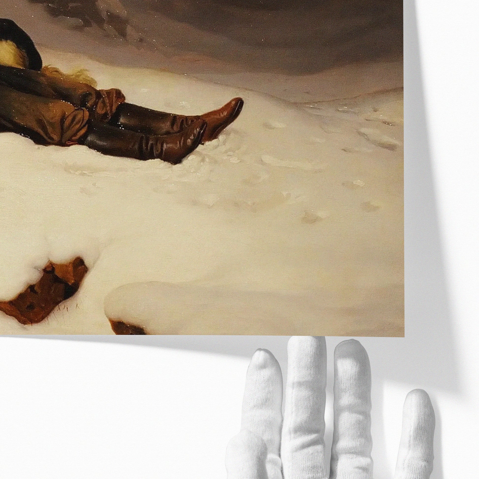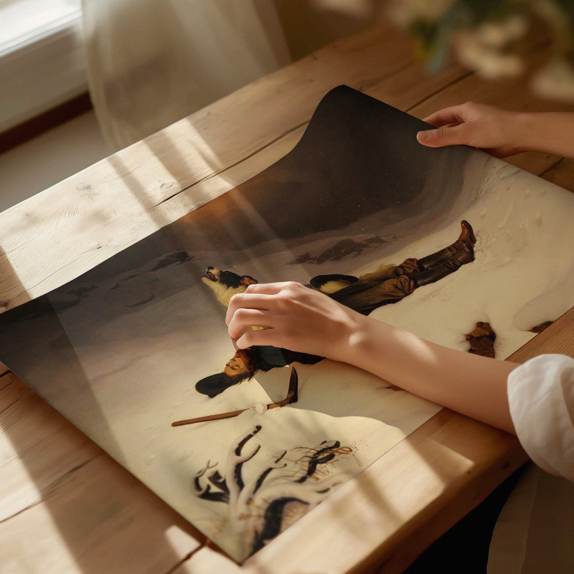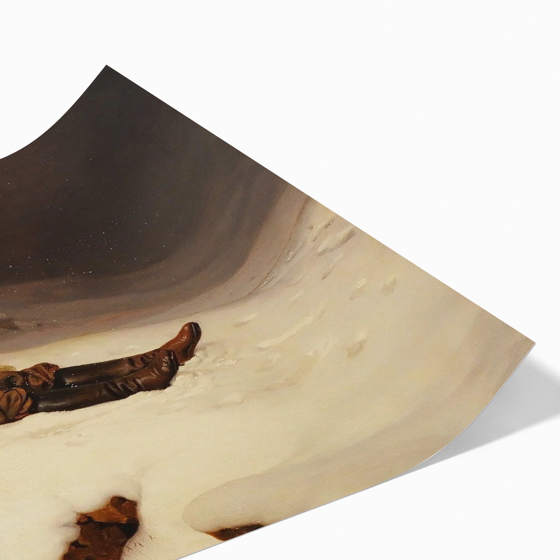 "The Dead Miner" by Charles Christian Nahl, completed in 1867, is a poignant and powerful depiction of the harsh realities faced by miners during the California Gold Rush. In this emotionally charged scene, Nahl portrays a miner lying lifeless on the ground, his body worn and exhausted from the grueling work of mining for gold. The miner's comrades gather around him, their expressions a mix of grief, exhaustion, and resignation to the dangers of their profession. Nahl's attention to detail, particularly in the miner's rugged clothing and the rugged terrain, conveys the gritty reality of life in the mines. The stark contrast between light and shadow adds to the dramatic intensity of the scene, emphasizing the solemnity of the moment. "The Dead Miner" serves as a poignant reminder of the sacrifices and hardships endured by those who sought fortune in the goldfields, capturing the human toll of the pursuit of wealth during this tumultuous period in American history.