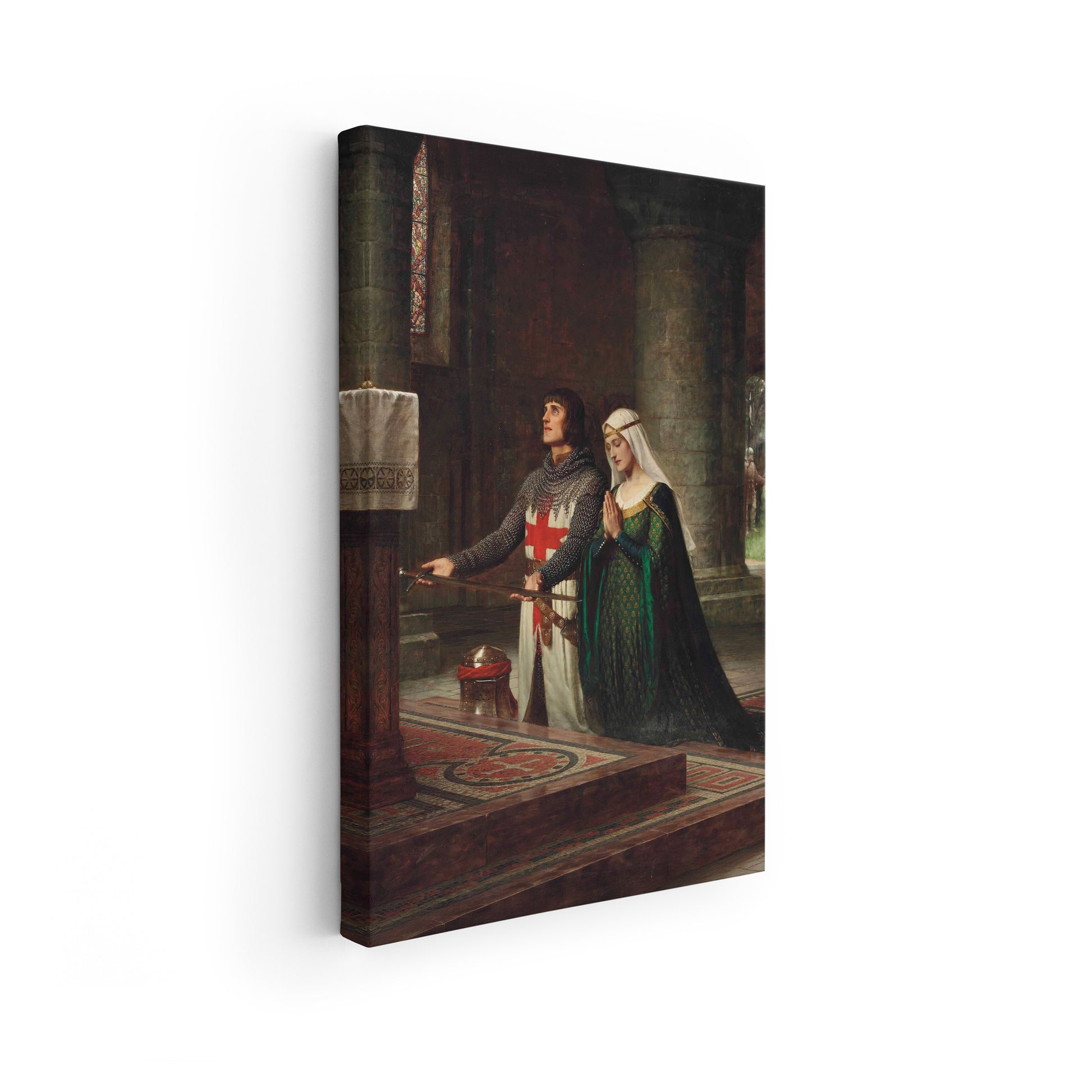 Edmund Blair Leighton’s The Dedication (1908) captures a solemn moment steeped in medieval chivalric idealism, showing a knight and his lady kneeling before an altar as he consecrates his sword in a gesture of piety and devotion that underscores the era’s romanticized values of duty, honor, and love. The richly detailed scene — with the knight in chainmail and the lady in elegant attire within a church setting — uses light, composition, and historical costume to evoke a sense of reverence and timeless commitment, reflecting both Victorian nostalgia for the past and the artist’s penchant for sentimental narrative that resonated with contemporary audiences. This work, part of a series exploring chivalric themes alongside pieces like God Speed and The Accolade, illustrates Leighton’s skill in blending historical idealization with emotional accessibility, making medieval devotion relatable to early twentieth-century viewers.