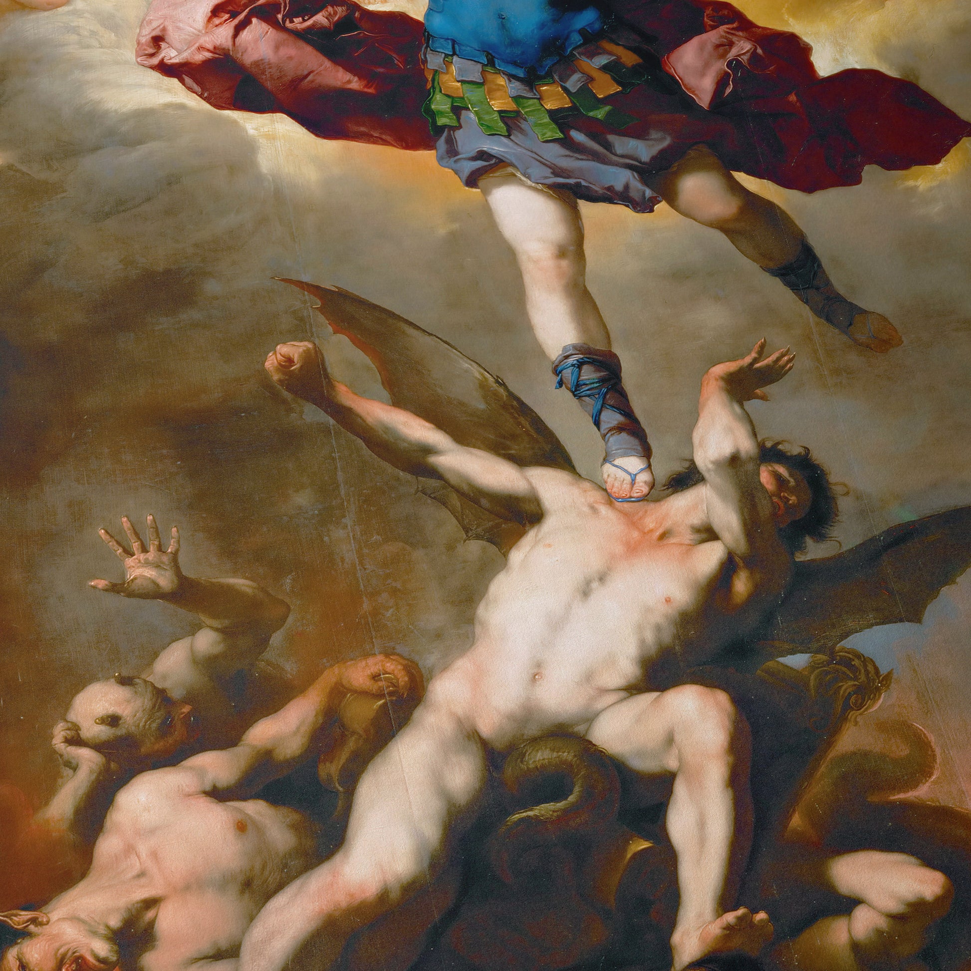 In his painting The Fall of the Rebel Angels (c. 1660–1665), Luca Giordano stages a violent and dramatic cosmic battle that vividly embodies the conflict between divine light and infernal chaos. The work is divided into two contrasting zones: the upper half glows with light and serene colours, reflecting Giordano’s assimilation of Venetian painting traditions, whereas the lower half is plunged into darkness and writhing agony — a chiaroscuro rooted in the Neapolitan Baroque lineage of Jusepe de Ribera and his followers. The central figure, the archangel (traditionally Michael the Archangel), stands triumphant with extended wings and raised sword, dominating a tumult of contorted demonic bodies — an embodiment of divine order smashing rebellious pride. Through dynamic composition, stark contrasts of light and shadow, and a sweeping gesture of celestial justice, the painting becomes not only a visual spectacle but a symbolic affirmation of a moral universe in which rebellion is met with inevitable divine retribution.