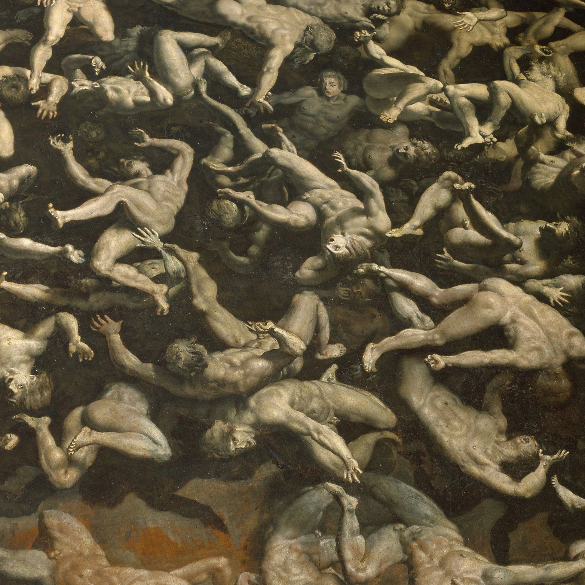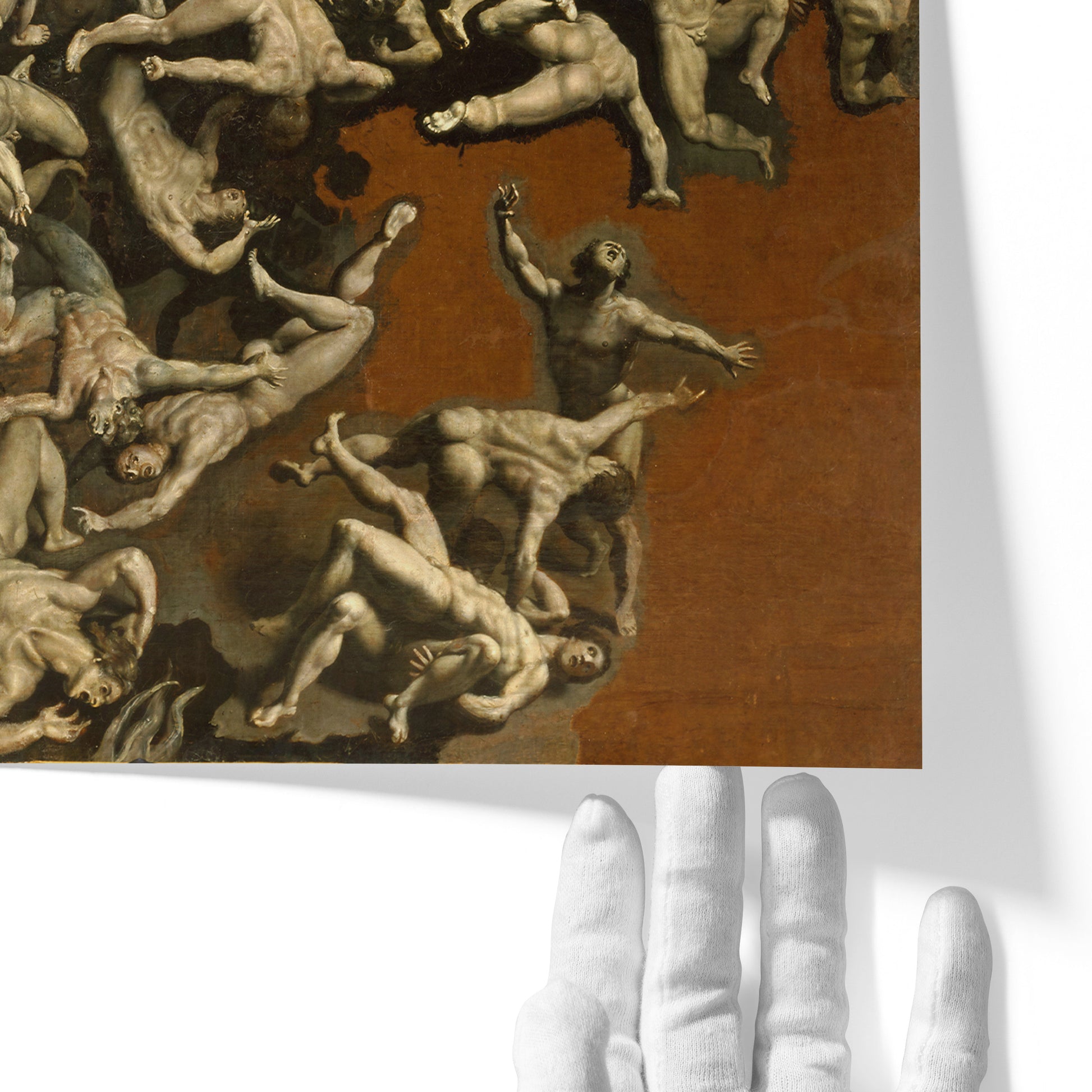 In The Fall of the Rebel Angels (c. 1612–14) by Andrea Commodi, the artist stages a tumultuous cascade of angels caught in mid-fall, their bodies twisting in a tightly packed vortex that reflects both divine drama and painterly ambition. The work was conceived as a design for a monumental fresco commission from Pope Paul V at the Quirinal Palace in Rome but ultimately abandoned, leaving this dynamic composition as the sole testimony of its scope.  Commodi’s indebtedness to Michelangelo is evident in the heroic musculature of the figures and the congested spatial drama. The absence of any divine judge or triumphant archangel emphasizes instead the raw, unmediated collapse of the rebellious, making the scene as much psychological as theological—a vision of sin’s consequence rather than its cosmic resolution.