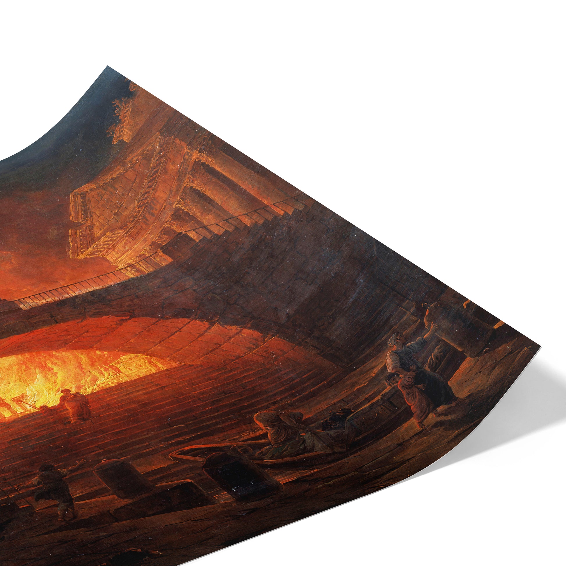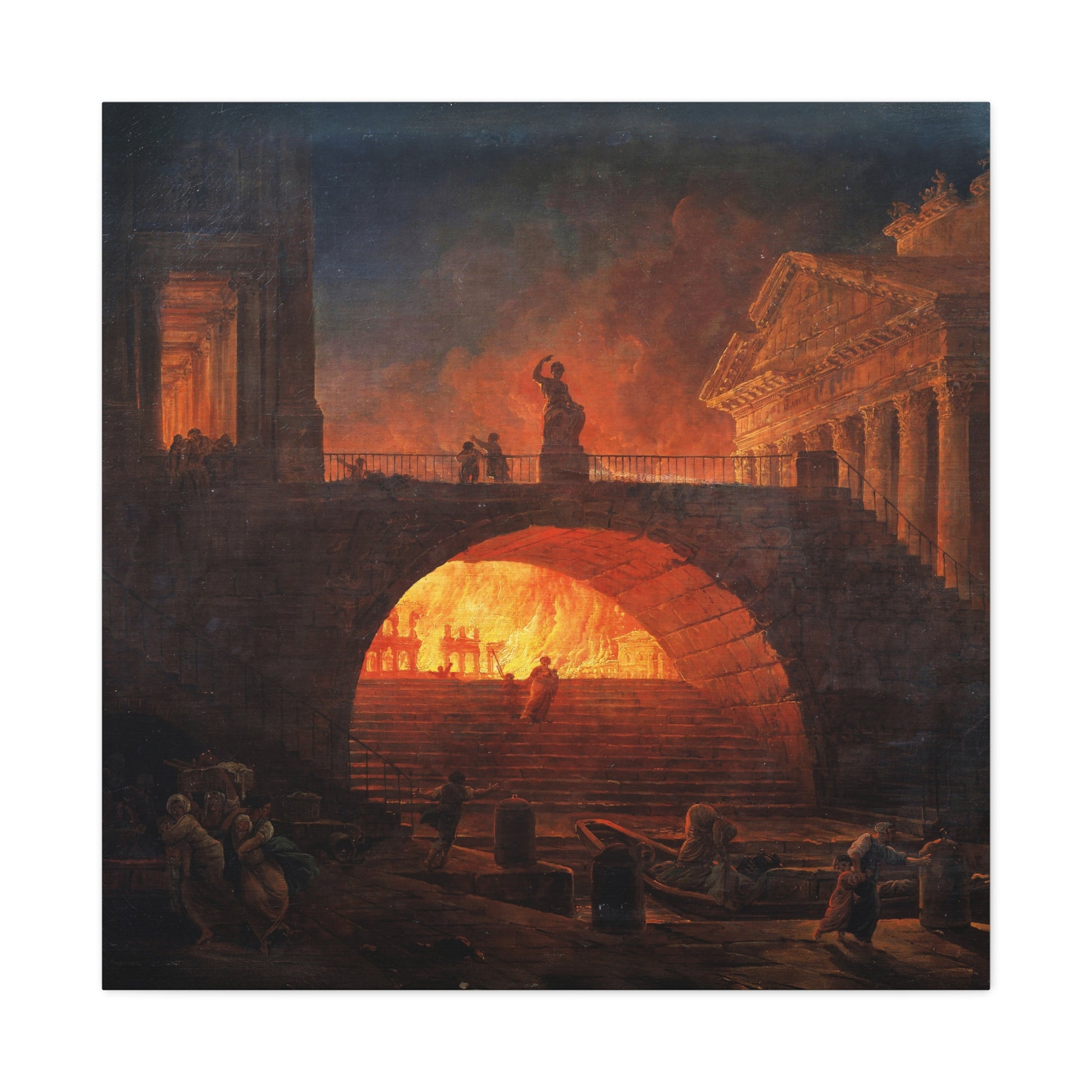 Hubert Robert’s The Fire of Rome, 18 July 64 AD transforms a debated historical event into a grand theatrical vision, merging fact, rumor, and artistic invention. Through monumental arches and classical facades, he frames a city consumed by incandescent flames, casting an orange glow over the chaos. The choice to depict only women and children fleeing intensifies the emotional weight, contrasting human fragility with the enduring stone architecture. A statue atop the central arch looms above the tragedy, symbolizing the tension between the eternal and the mortal. The dramatic interplay of light and shadow aligns with the aesthetic of the sublime, where beauty and devastation coexist, and the fall of a great civilization becomes both a spectacle and a warning.