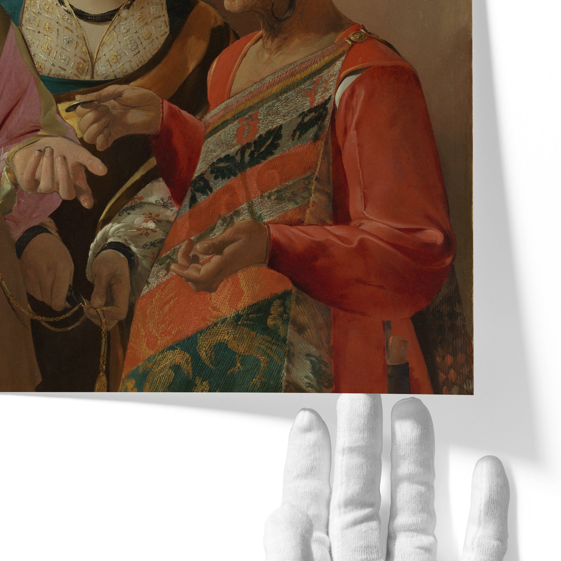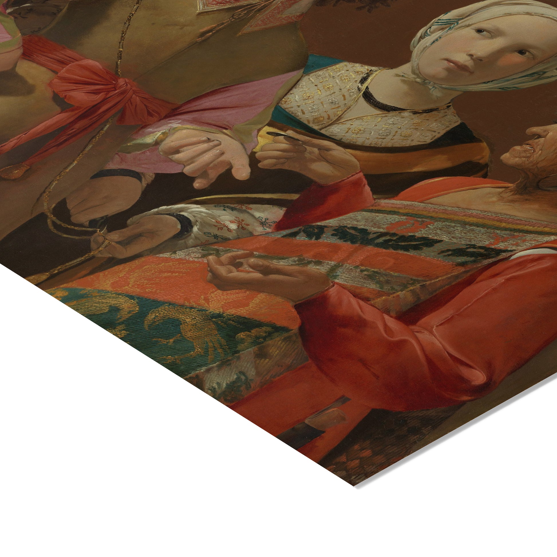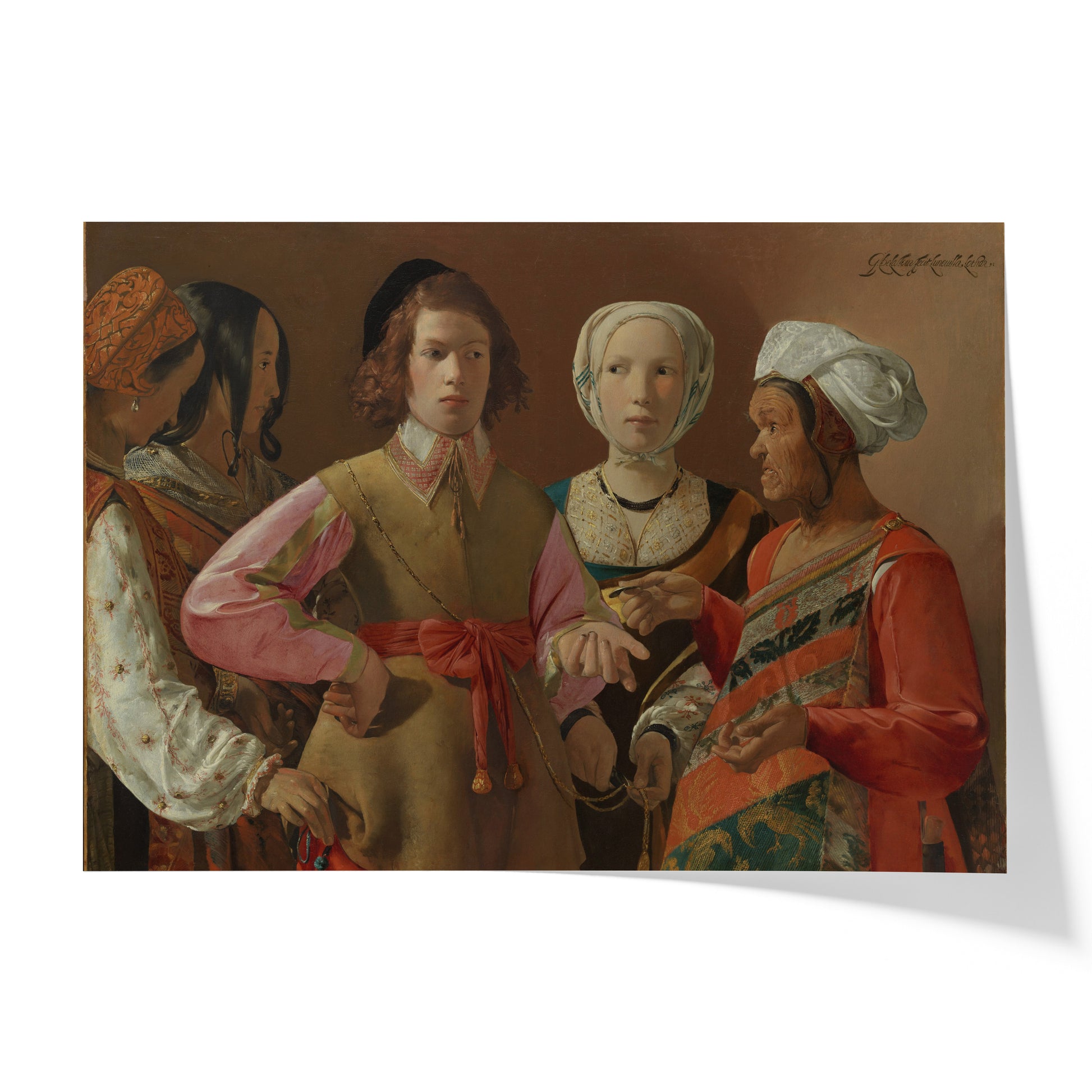 The Fortune Teller by Georges de La Tour, painted around 1630, presents a carefully staged scene in which a young aristocrat consults a group of women who appear to be telling his fortune, while in reality they are robbing him. The composition is structured with remarkable clarity, each figure positioned almost parallel to the picture plane, which gives the scene a theatrical stillness. La Tour, a leading figure of the French Baroque, was influenced by Caravaggio’s realism, yet his approach is more controlled and silent. Here, light is even and restrained, allowing the viewer to focus on the subtle gestures of the hands as they remove the young man’s purse and cut his pocket. The painting functions as both a genre scene and a moral warning about vanity, naivety, and social deception. Today it is housed in the Metropolitan Museum of Art in New York, and it remains one of La Tour’s most compelling explorations of illusion and human vulnerability.
