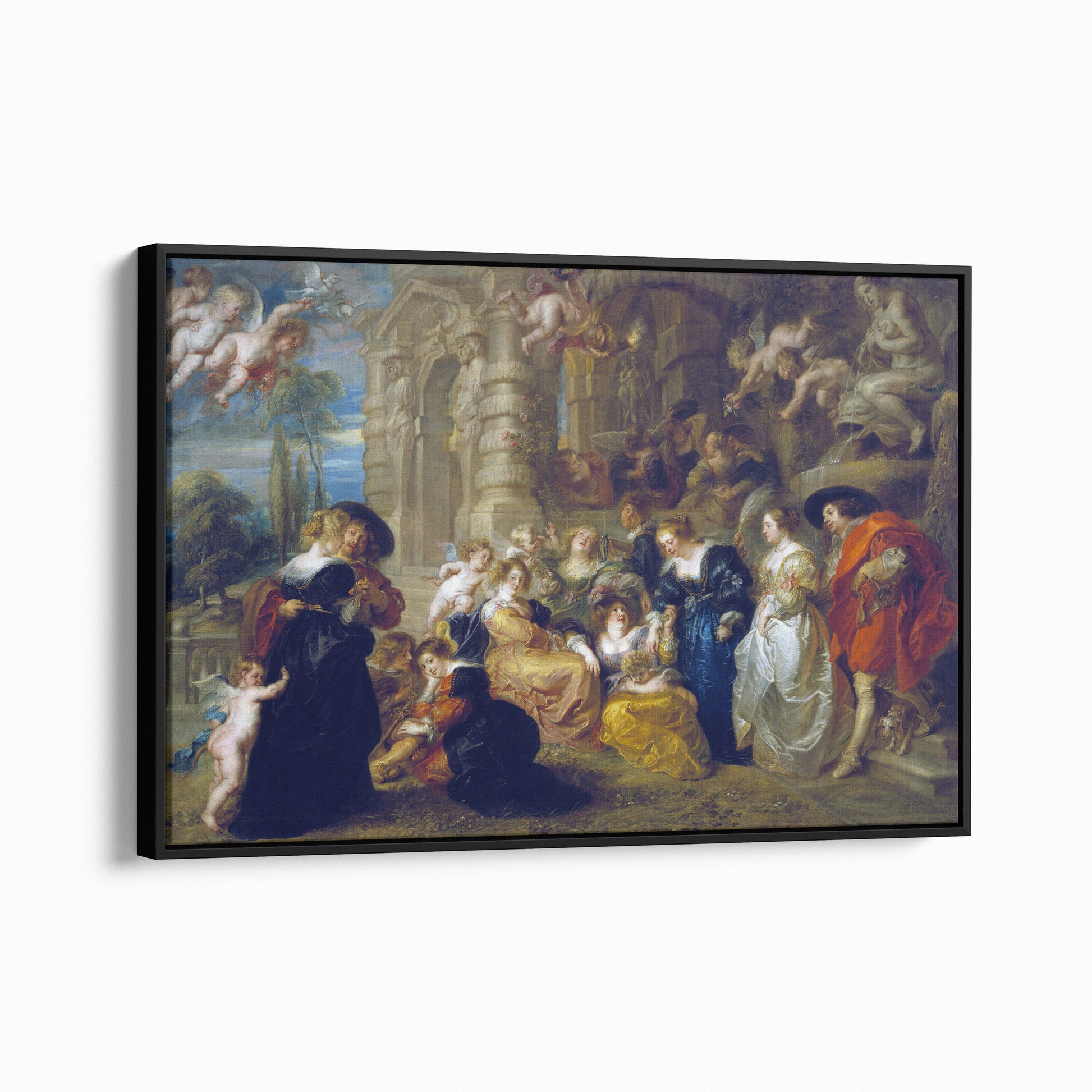 "The Garden of Love" by Peter Paul Rubens, painted around 1633, is a lavish and vibrant depiction of a mythological scene inspired by classical themes of love and fertility. In this masterpiece, Rubens portrays a group of elegantly draped figures amidst a verdant garden setting, engaged in playful and amorous interactions.