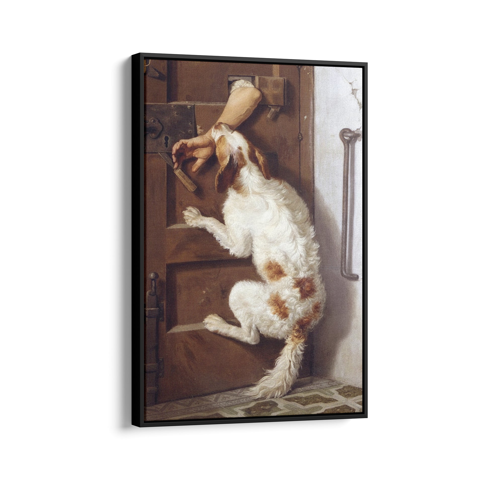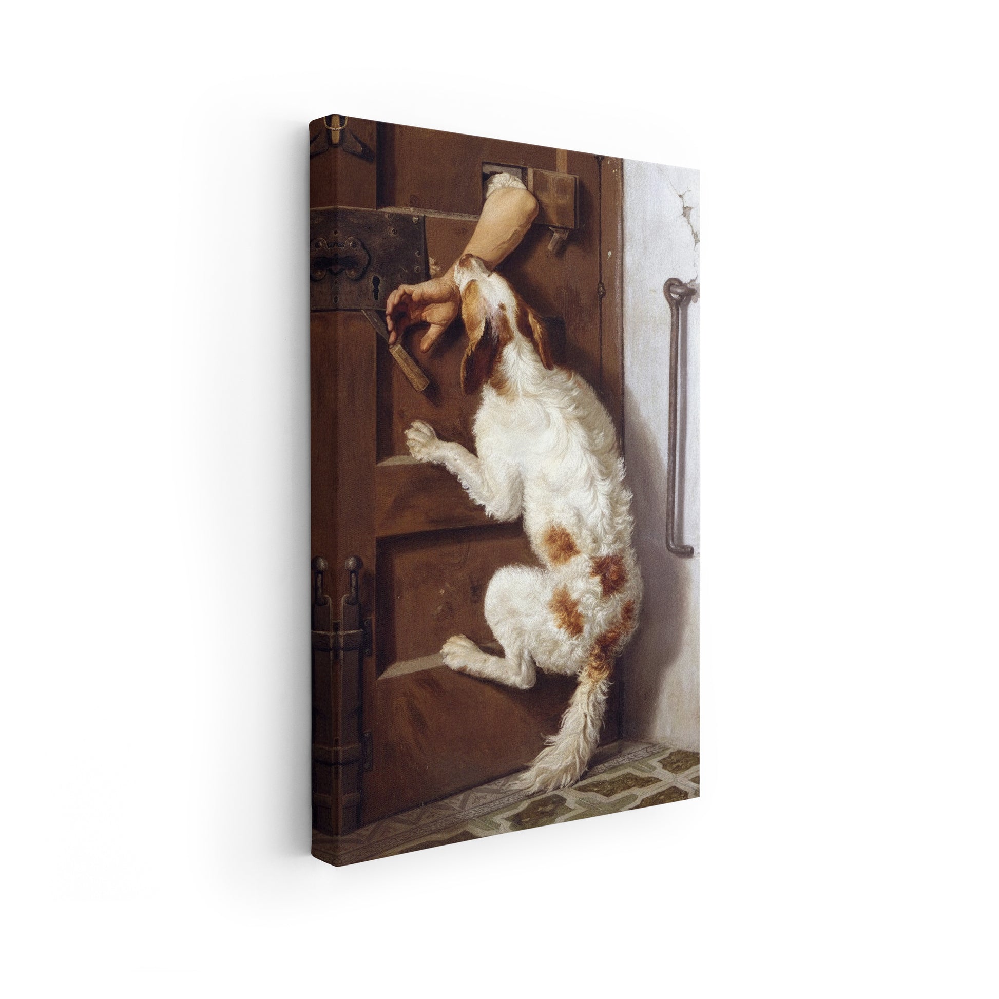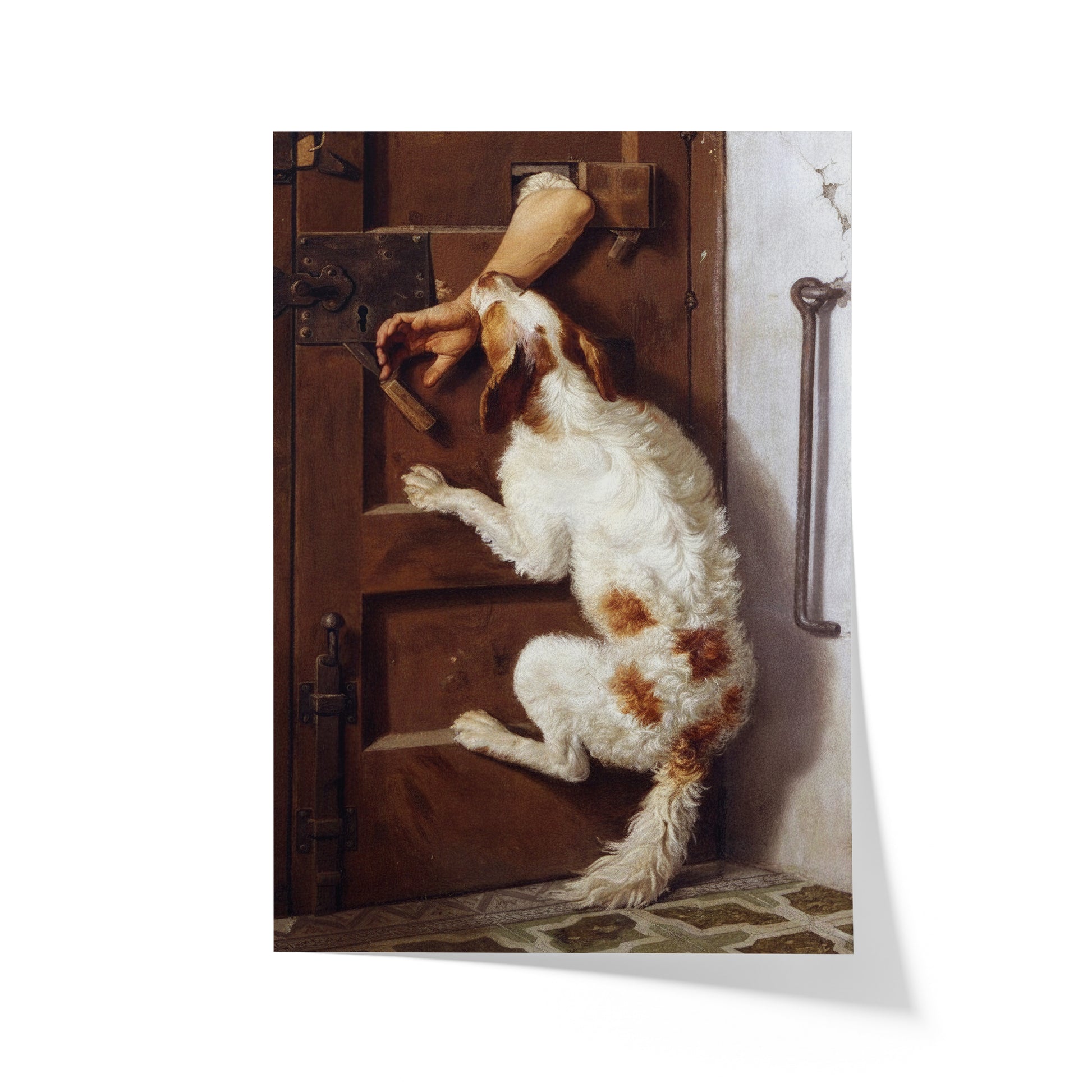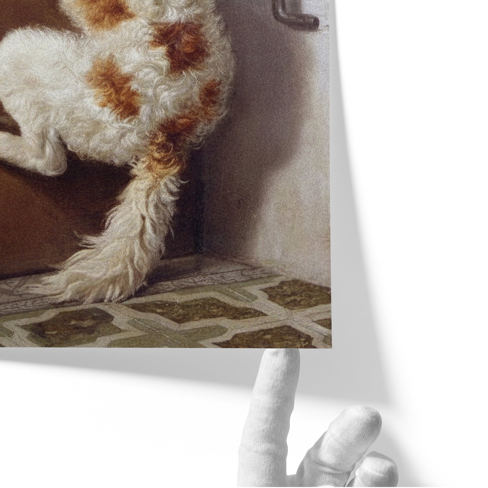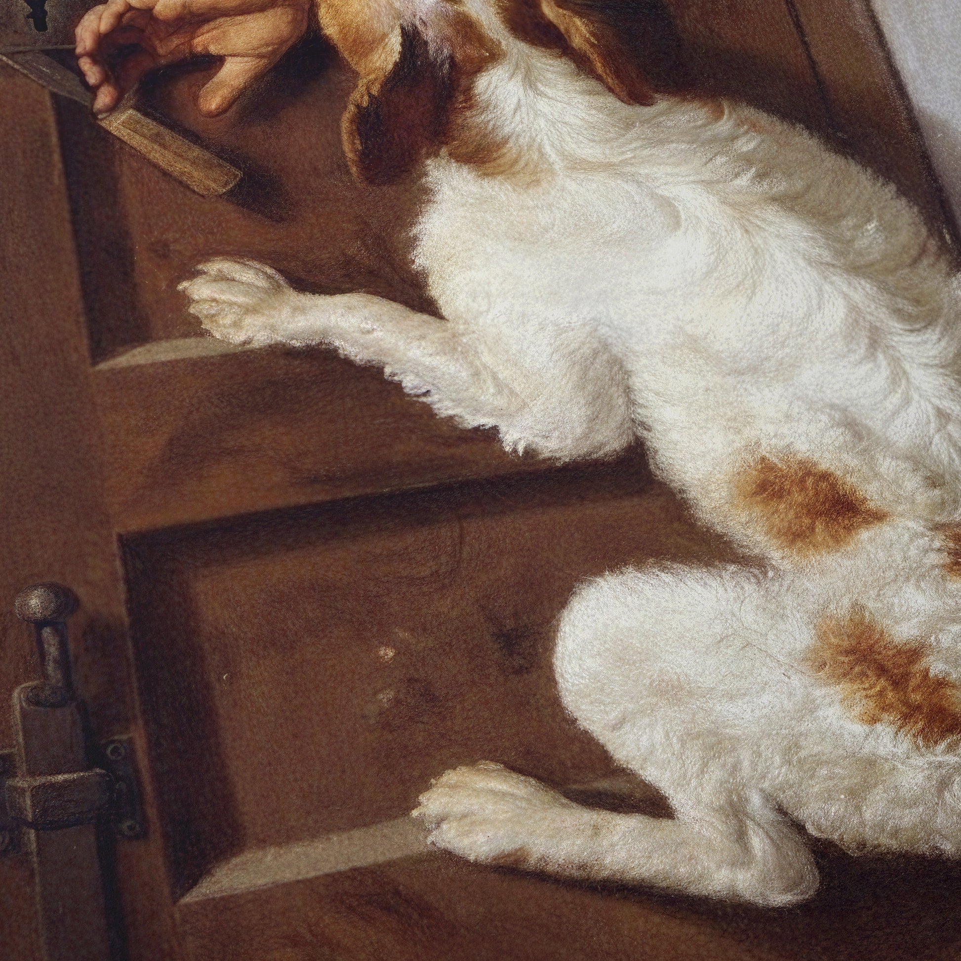 In The Hand of the Thief (c. 1864) by Giuseppe De Nigris, the artist transforms a moment of crime into a vivid genre scene, showing a dog clamping its jaws onto the arm of a would-be thief as he reaches for a door lock. The painting juxtaposes the refined setting—suggested by the polished wood of the door and the subtle light—with the abrupt violence of the intrusion, inviting viewers to contemplate both the absurdity and seriousness of the act. The artist’s careful rendering of textures—the smooth key, the canine fur, the thief’s tense hand—heightens the realism and draws the viewer into the immediacy of the moment. At the same time, there is a hint of moral lesson: the vigilant dog acting as protector, the thief caught in the act, and the door as threshold between order and disorder. De Nigris blends narrative drama, domestic intimacy, and a touch of humour to craft a scene that is both entertaining and morally pointed.