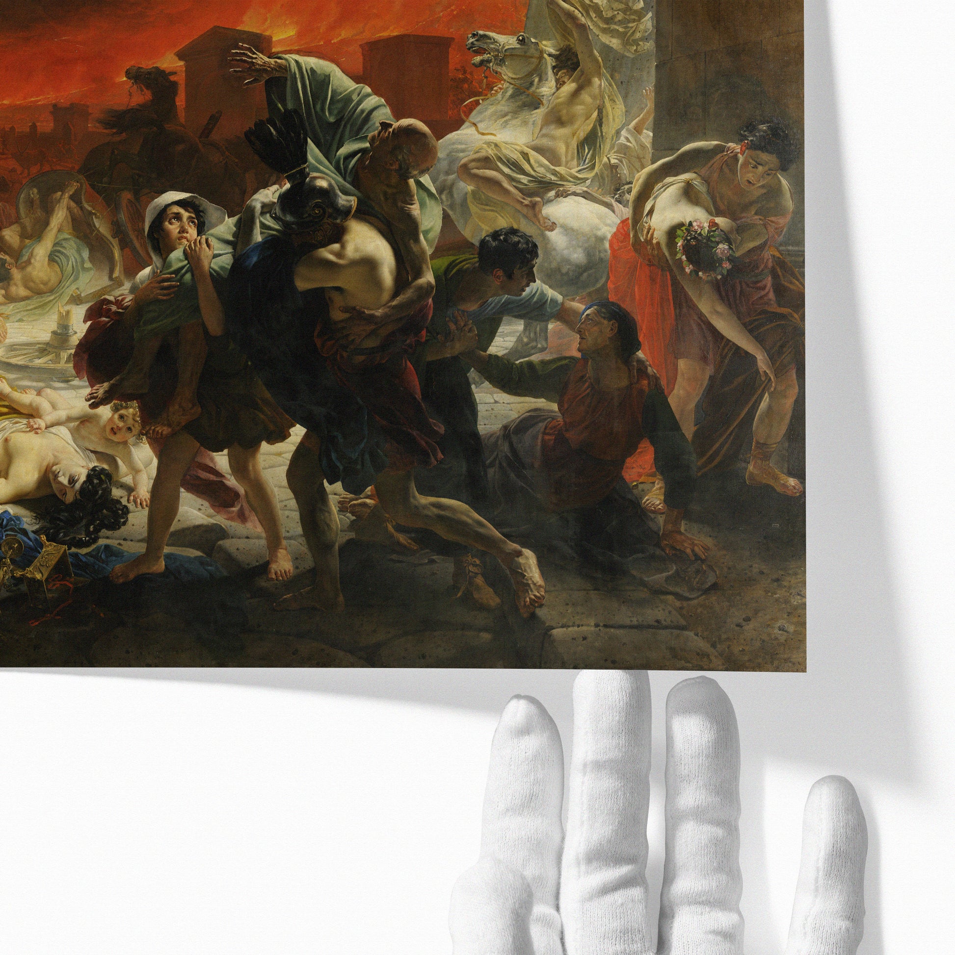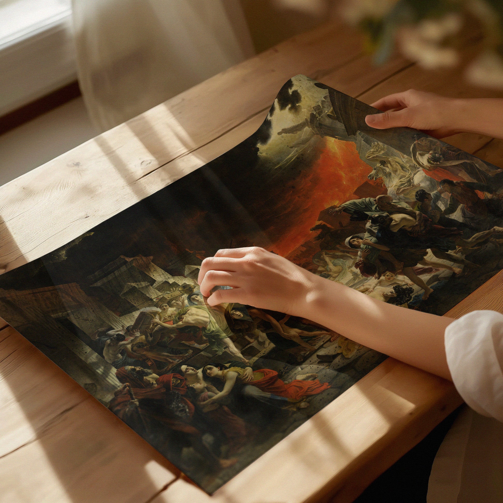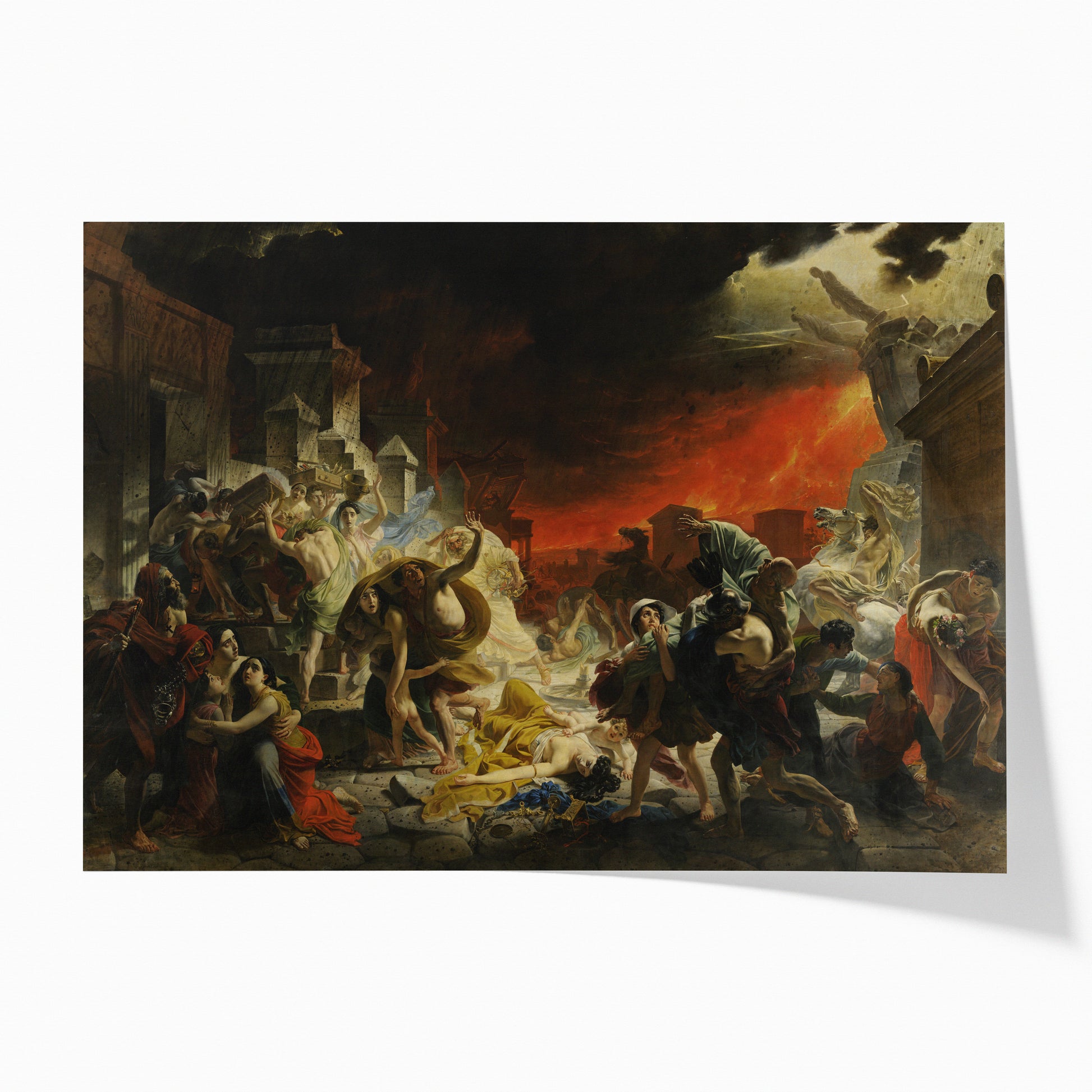 "The Last Day of Pompeii" by Karl Bryullov, completed in 1833, is a monumental painting depicting the catastrophic eruption of Mount Vesuvius in 79 AD that destroyed the ancient Roman city of Pompeii. Bryullov captures the chaos, terror, and devastation of the volcanic eruption as it engulfs the city in a cloud of ash and smoke. The painting is filled with a multitude of figures, each caught in a moment of panic, despair, or resignation, creating a tableau of human suffering and tragedy. It stands as a haunting reminder of the fragility of human civilization in the face of natural forces.