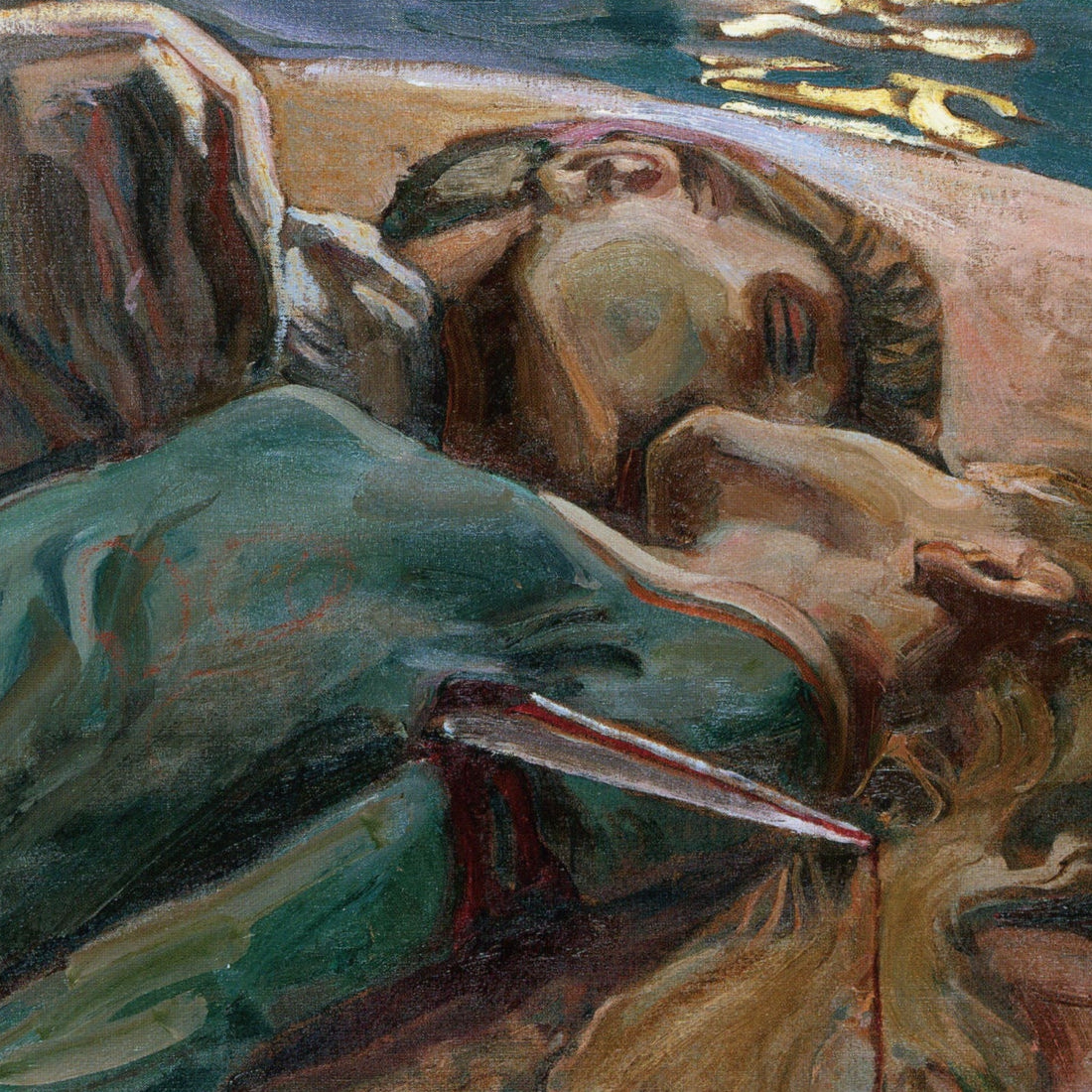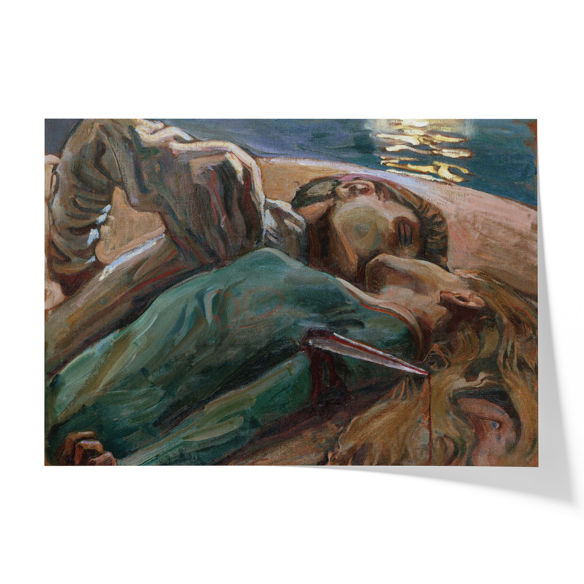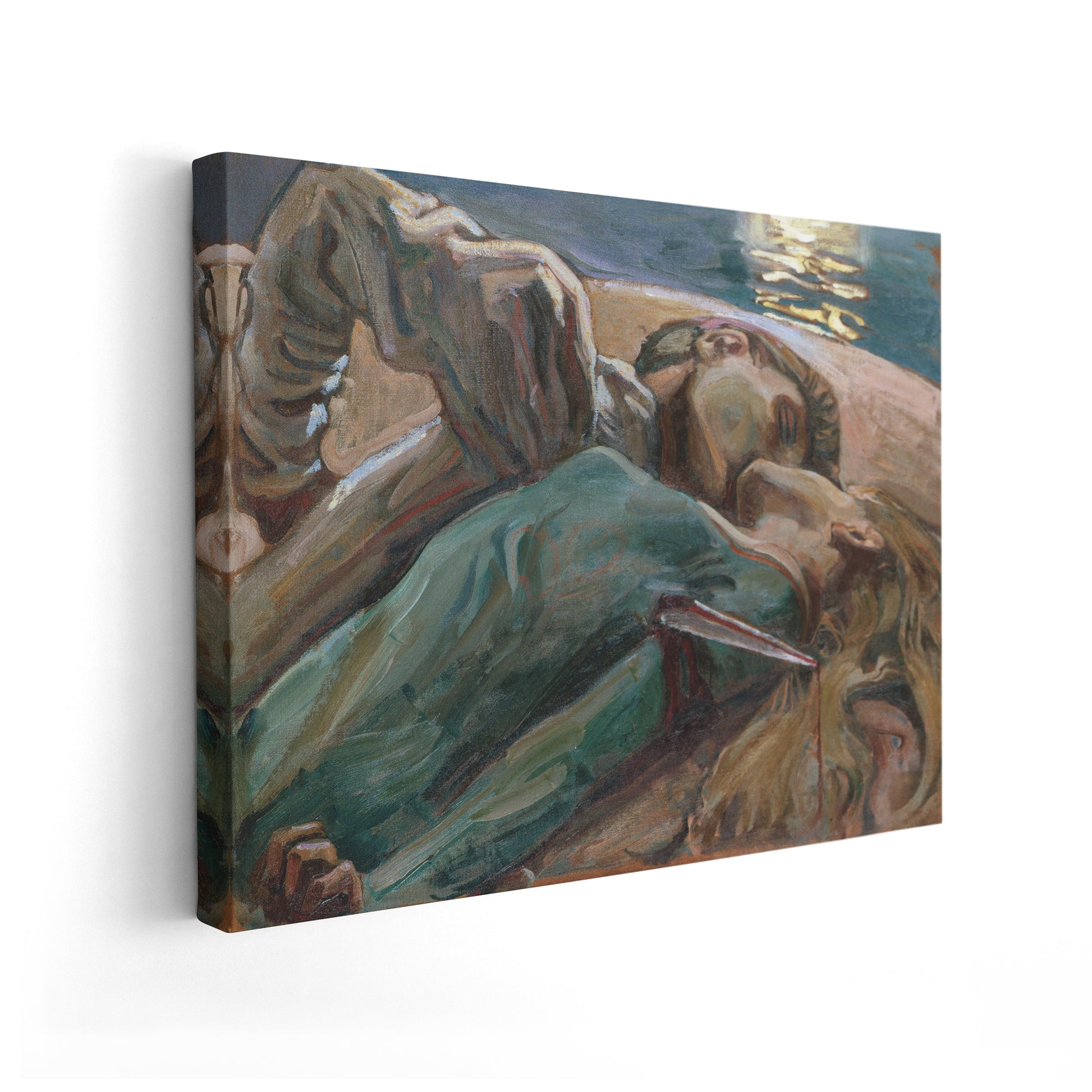 Akseli Gallen-Kallela’s The Lovers (1906–1917) portrays two figures locked in an embrace that is both tender and unsettling, disrupted by the presence of a sword between their bodies. The contrast between intimacy and danger turns the painting into more than a depiction of passion—it becomes a meditation on the dual nature of love as both life-giving and destructive. Painted during a period when Gallen-Kallela moved away from his heroic Kalevala scenes to more personal, psychological themes, the work reflects Symbolist ideals by using the sword as a powerful metaphor for sacrifice, betrayal, or the inevitability of loss. It captures love not as pure harmony, but as a force shadowed by fragility and mortality.