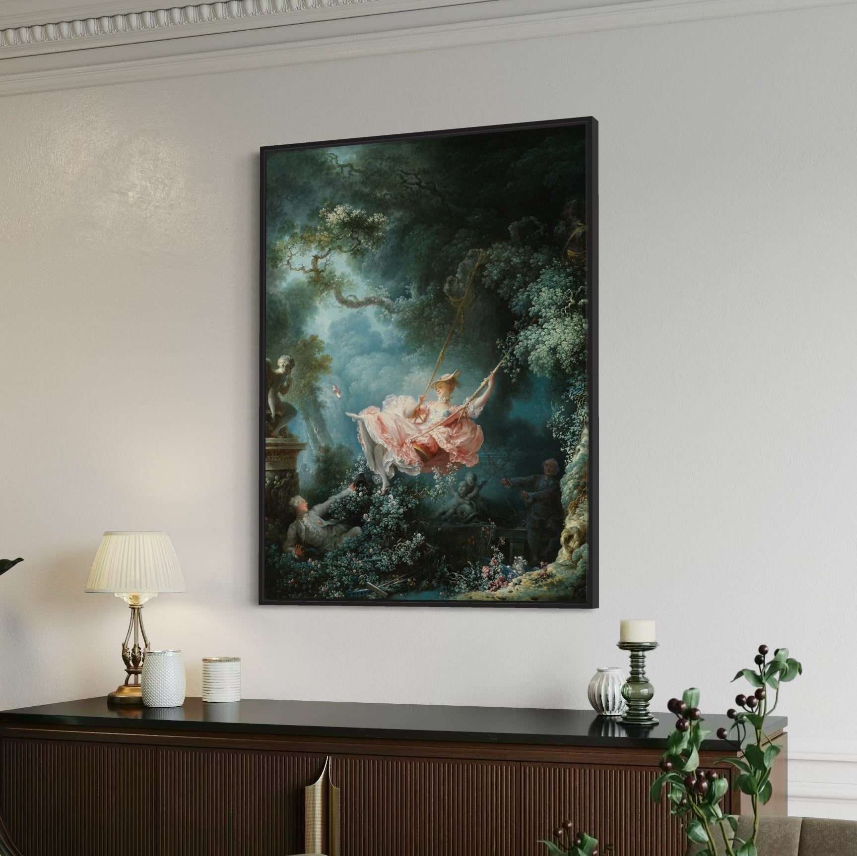 "The Swing," created by Jean-Honoré Fragonard in 1767, epitomizes the playful and frivolous spirit of the Rococo era. This painting depicts a young woman on a swing, being pushed by an older man while her lover, hidden in the bushes, gazes up at her. The lush garden setting, the woman's flowing dress, and the playful mood are all rendered with Fragonard's characteristic lightness and elegance, capturing a moment of romance and carefree joy.
