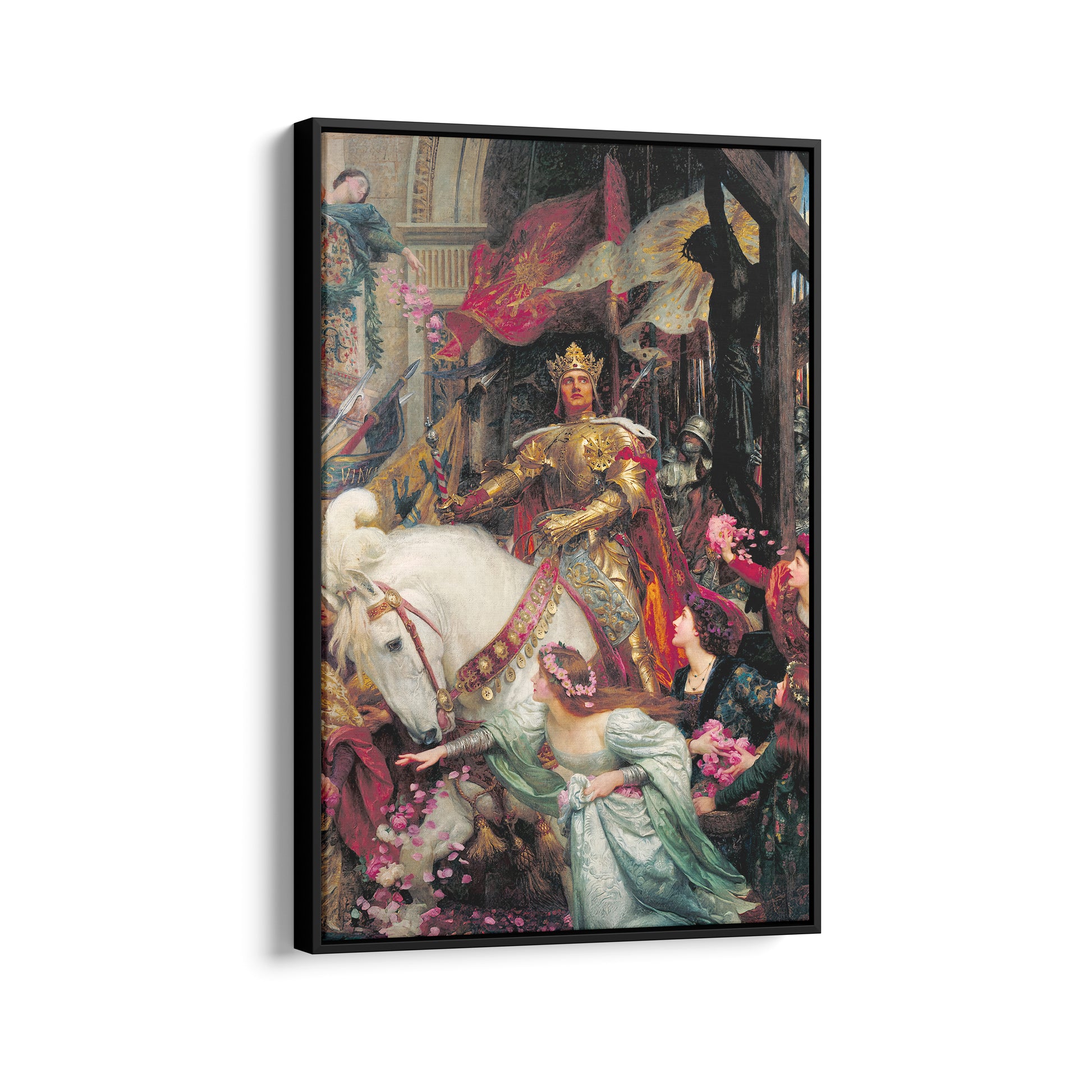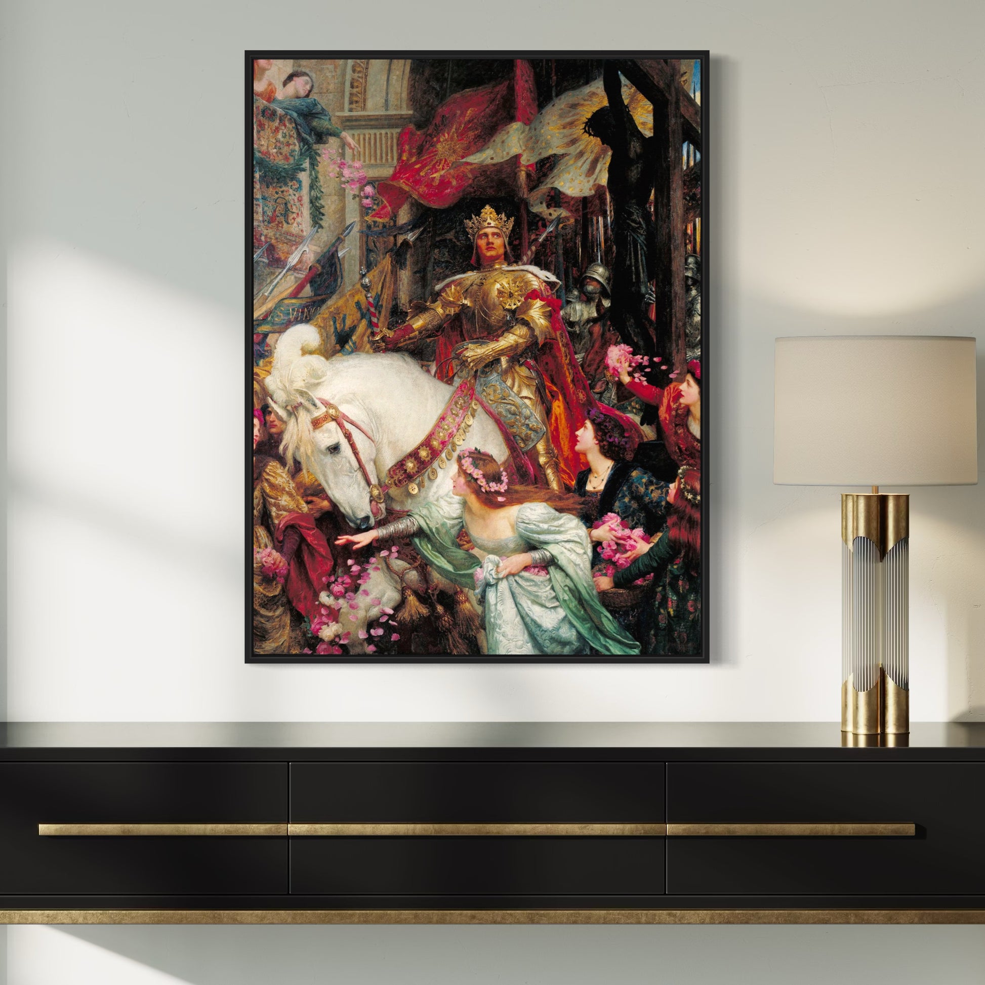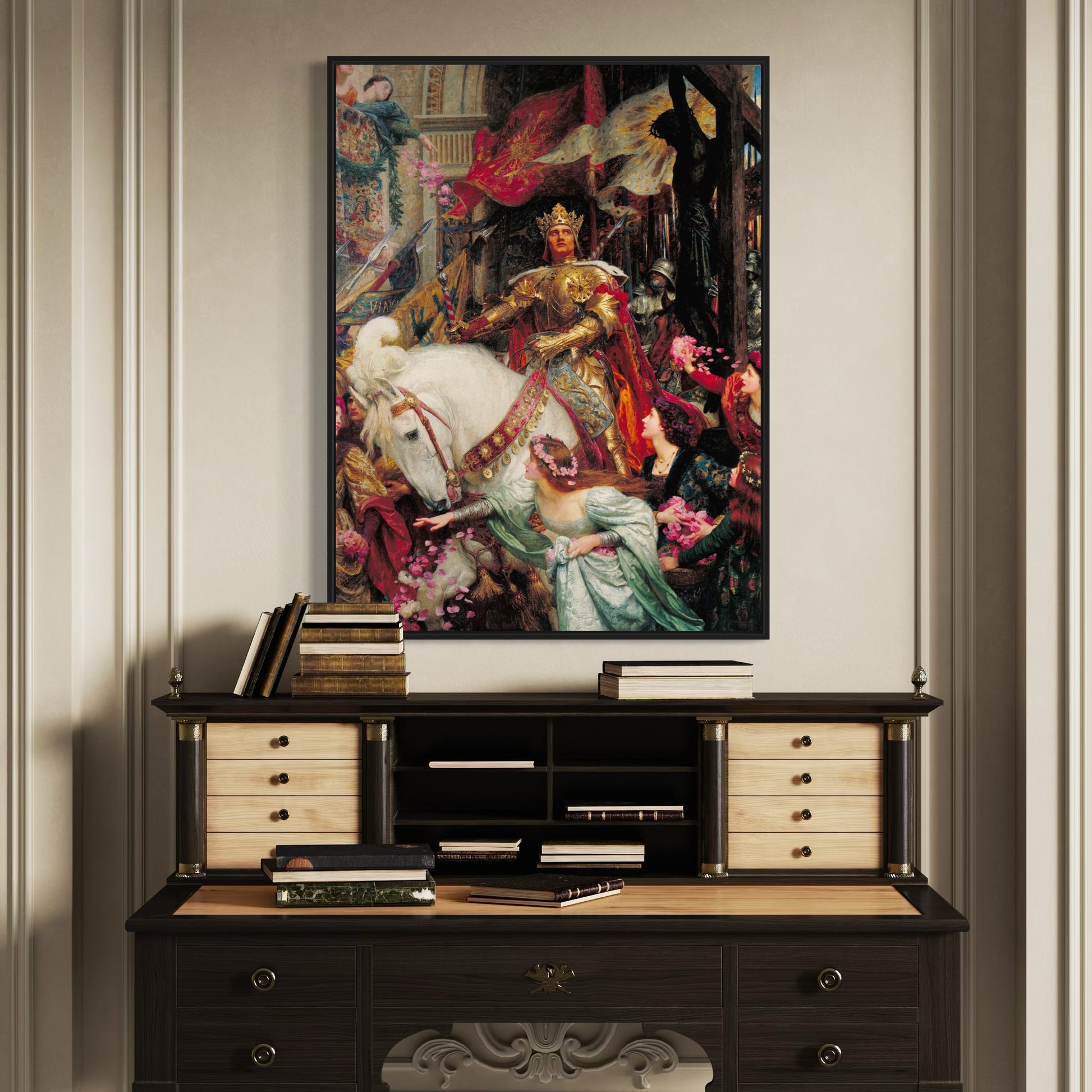 This painting depicts a triumphant medieval prince returning home on a white horse adorned with three feathers, a symbol of nobility. Wearing a golden crown and opulent armor, he is surrounded by jubilant admirers who shower him with petals, celebrating his victorious return.