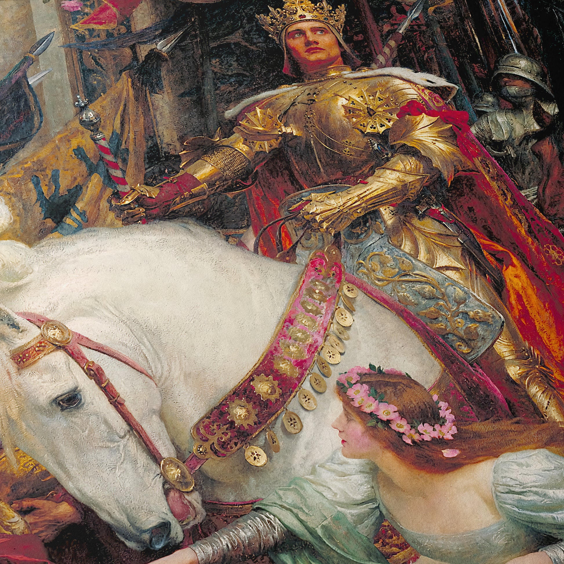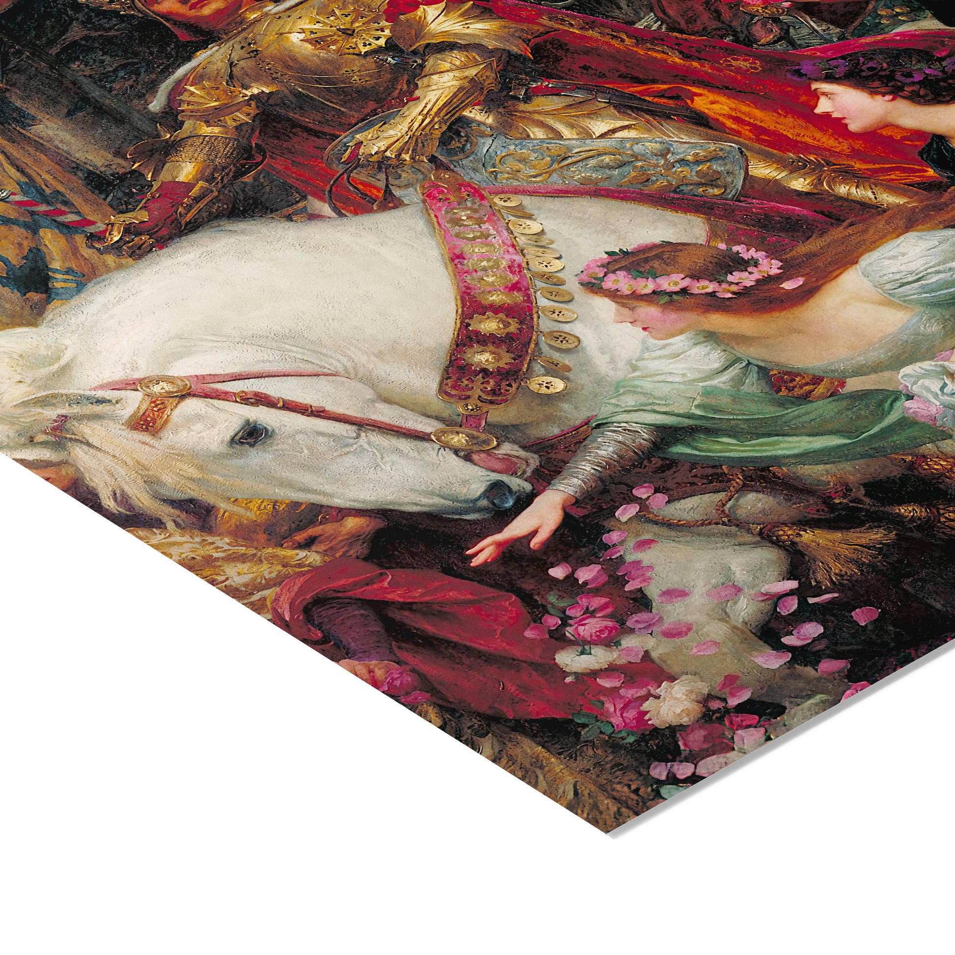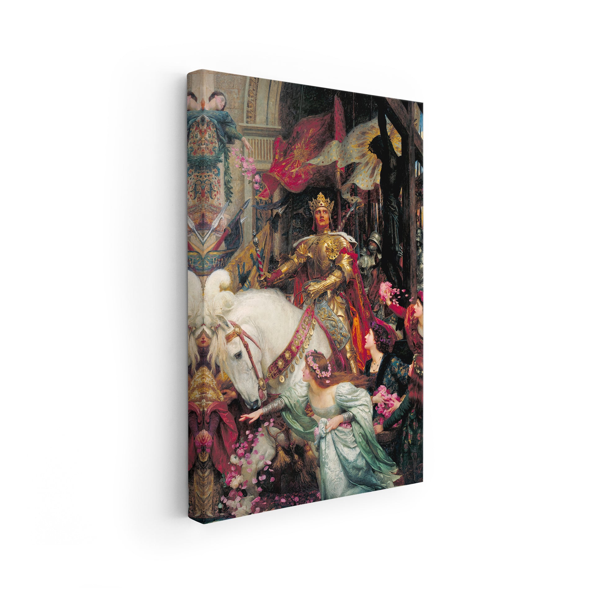 This painting depicts a triumphant medieval prince returning home on a white horse adorned with three feathers, a symbol of nobility. Wearing a golden crown and opulent armor, he is surrounded by jubilant admirers who shower him with petals, celebrating his victorious return.