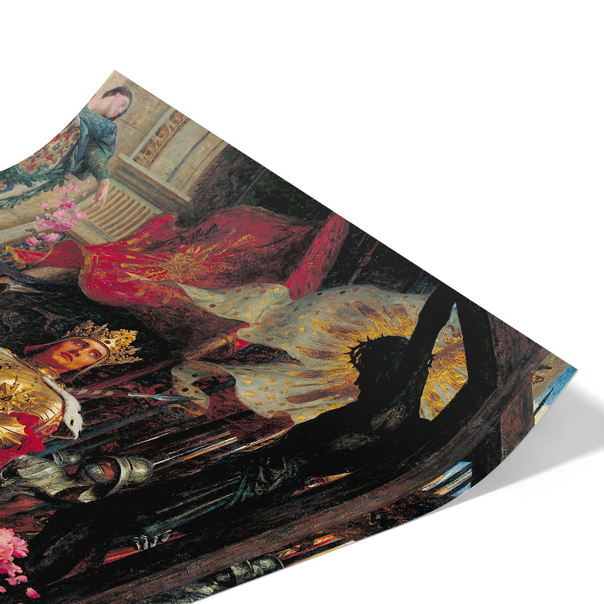 However, the prince's gaze is fixed on a crucifix positioned to the right, contrasting his jeweled crown with Christ's crown of thorns. This juxtaposition serves as a poignant reminder of the fleeting nature of earthly power and the enduring significance of spiritual humility.