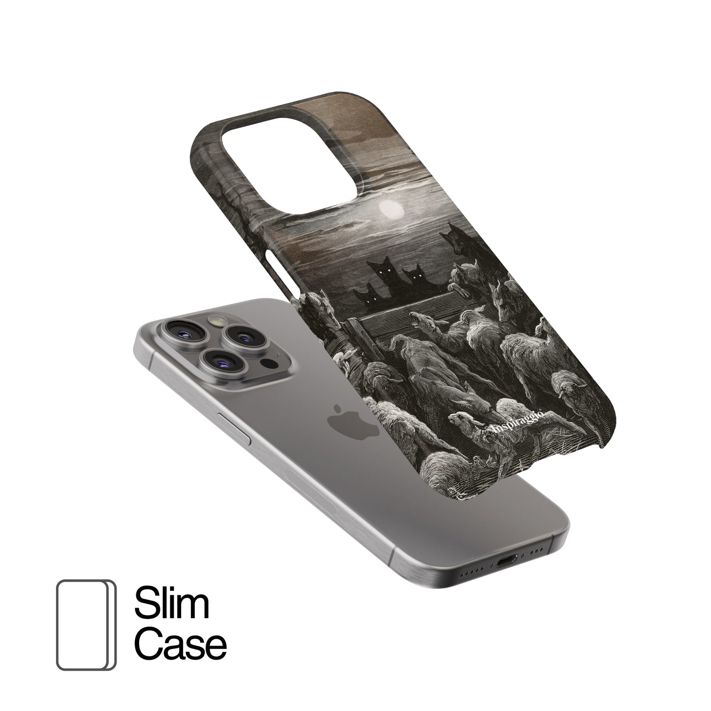 Gustave Doré's engraving "The Wolves and The Sheep" from around 1867 is a powerful illustration that conveys a sense of dread and impending doom. It depicts a flock of sheep in a state of panic, with some trying to escape and others frozen in fear. Above them on a wooden ledge, a group of wolves with glowing eyes observe the flock, exuding a sense of malice and predation. The scene is set at night, with the full moon casting a ghostly light over the turbulent scene, enhancing the overall menacing and terrifying mood of the artwork. Doré's use of contrast between the innocence of the sheep and the cunning of the wolves, set against the backdrop of the natural elements, creates a chilling narrative that captures the viewer's attention.