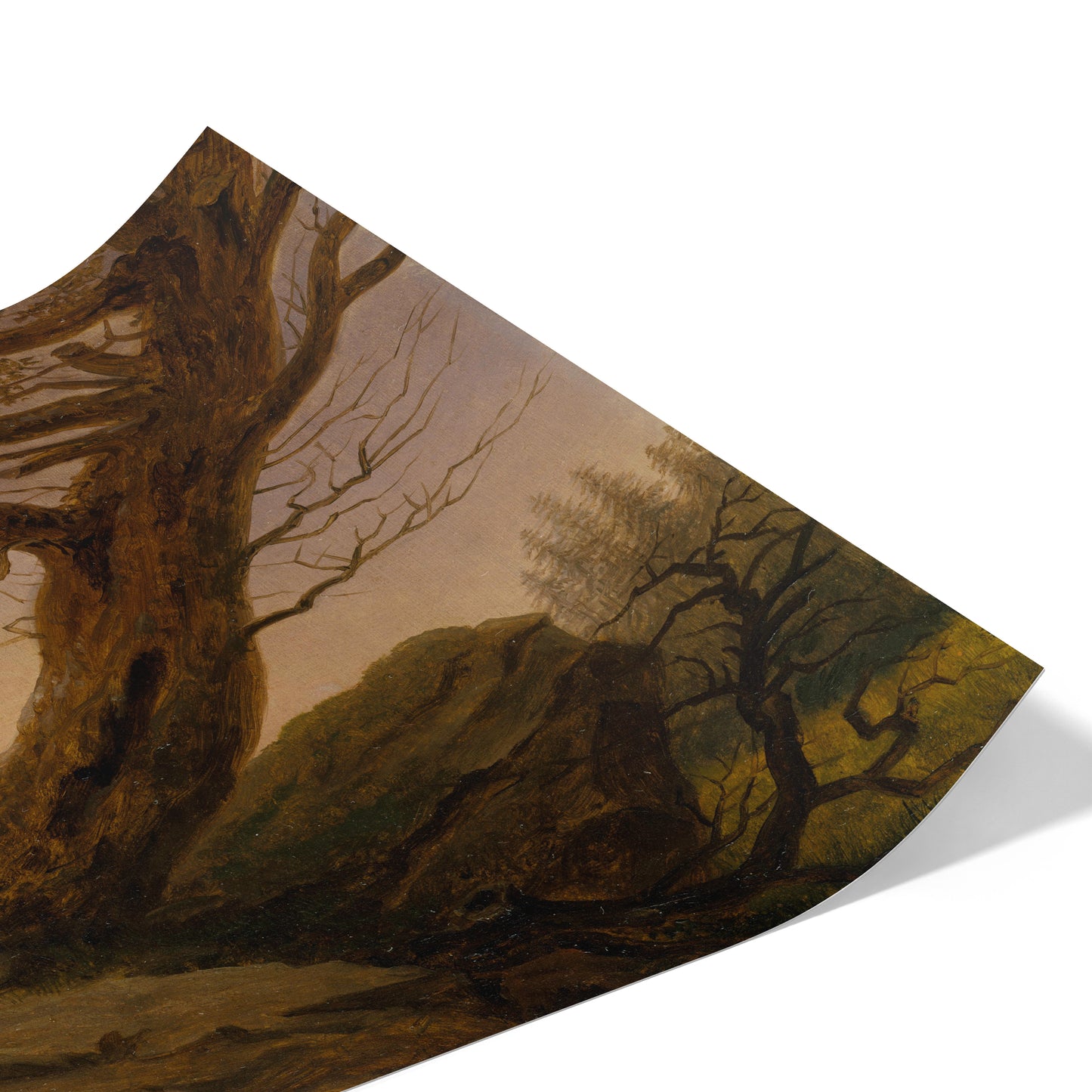 Caspar David Friedrich's Two Men Contemplating the Moon (1819–20) is a quintessential example of Romanticism, capturing the profound relationship between humanity and nature. The painting depicts two cloaked figures, viewed from behind, standing on rocky terrain as they gaze at a crescent moon rising above a barren, skeletal tree. The figures, one older and one younger, may symbolize the passage of time or the guidance of one generation to the next. Friedrich's use of muted tones and soft lighting creates an atmosphere of stillness and introspection, emphasizing the sublime beauty and mystery of the natural world. The composition invites viewers to share in the figures' quiet meditation, suggesting a search for spiritual or existential meaning. By turning their backs to the audience, the figures become proxies for the viewer, making the experience of awe and contemplation deeply personal. The scene exemplifies Friedrich’s ability to evoke the transcendent power of nature, contrasting human fragility against the vast, eternal cosmos.